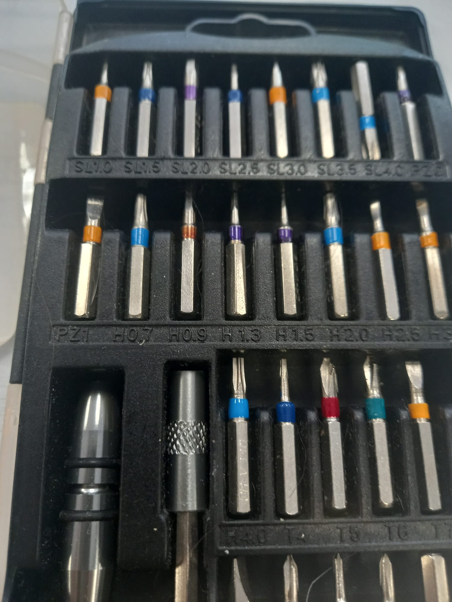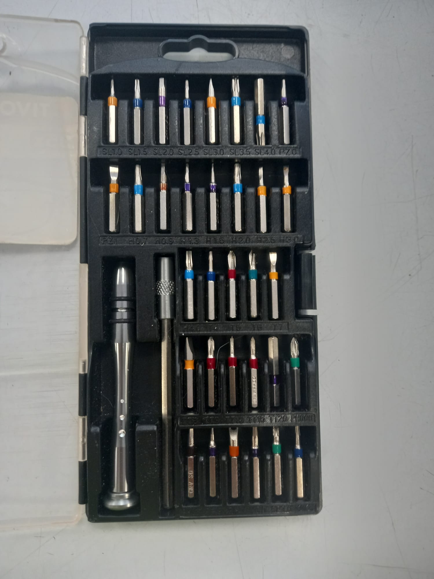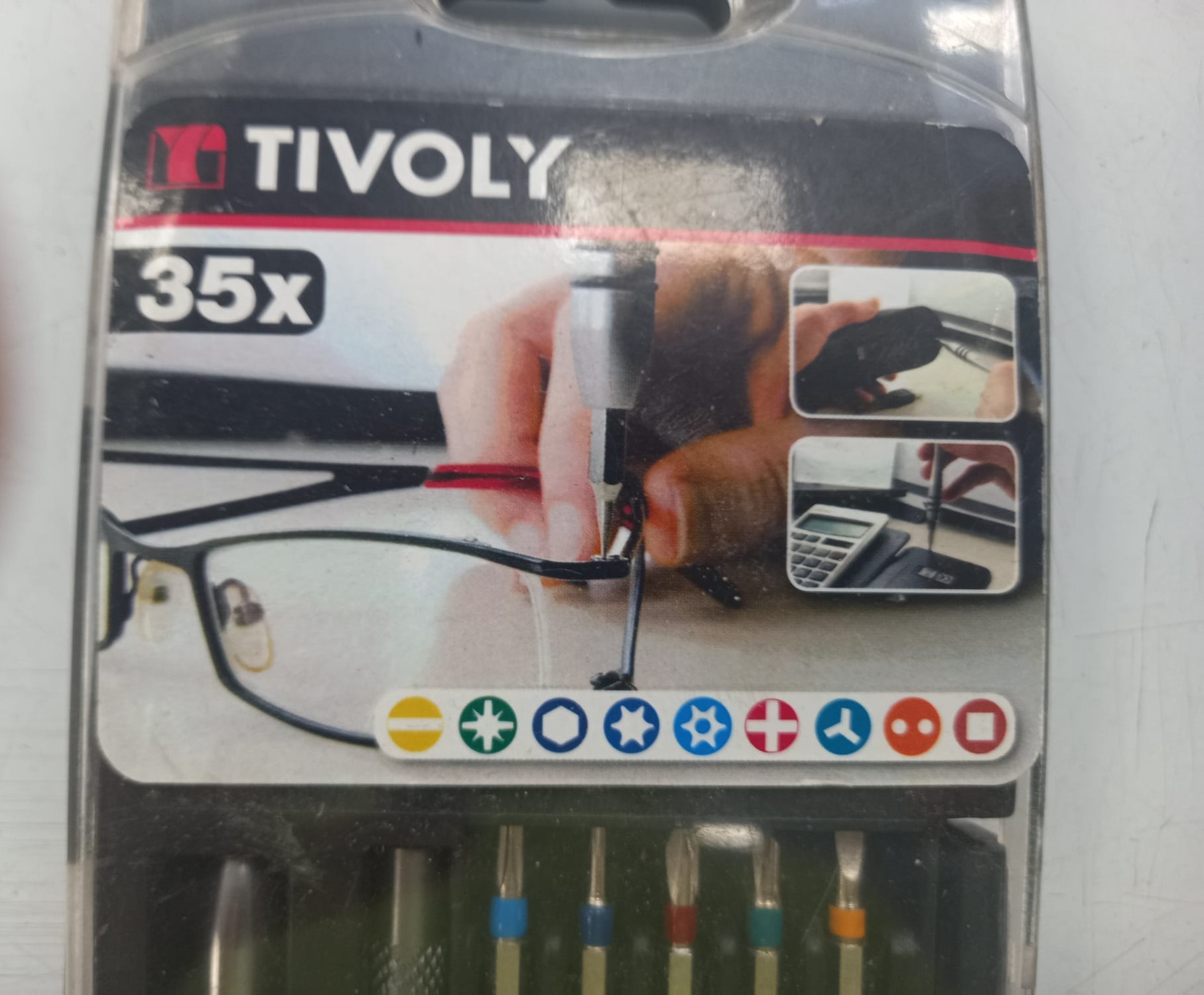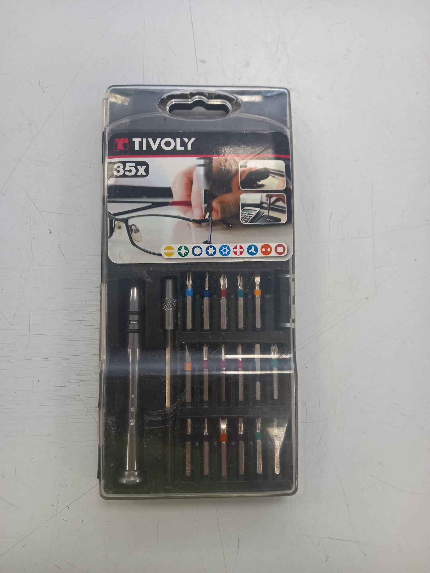 Set de destornillador de precisión Tivoly con 35 piezas. Incluye mango y puntas variadas. Ideal para trabajos de electrónica y reparaciones delicadas.