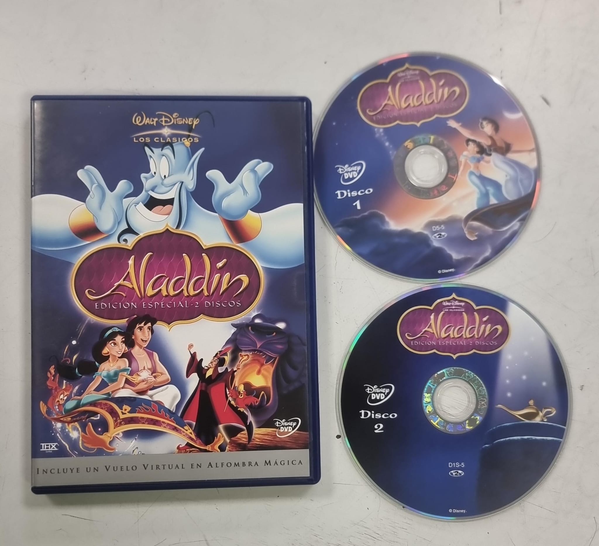 Vendo la película animada de Disney, Aladdin, en DVD. Es una edición especial de 2 discos. La caja y los discos están en buenas condiciones. Edición especial en español.