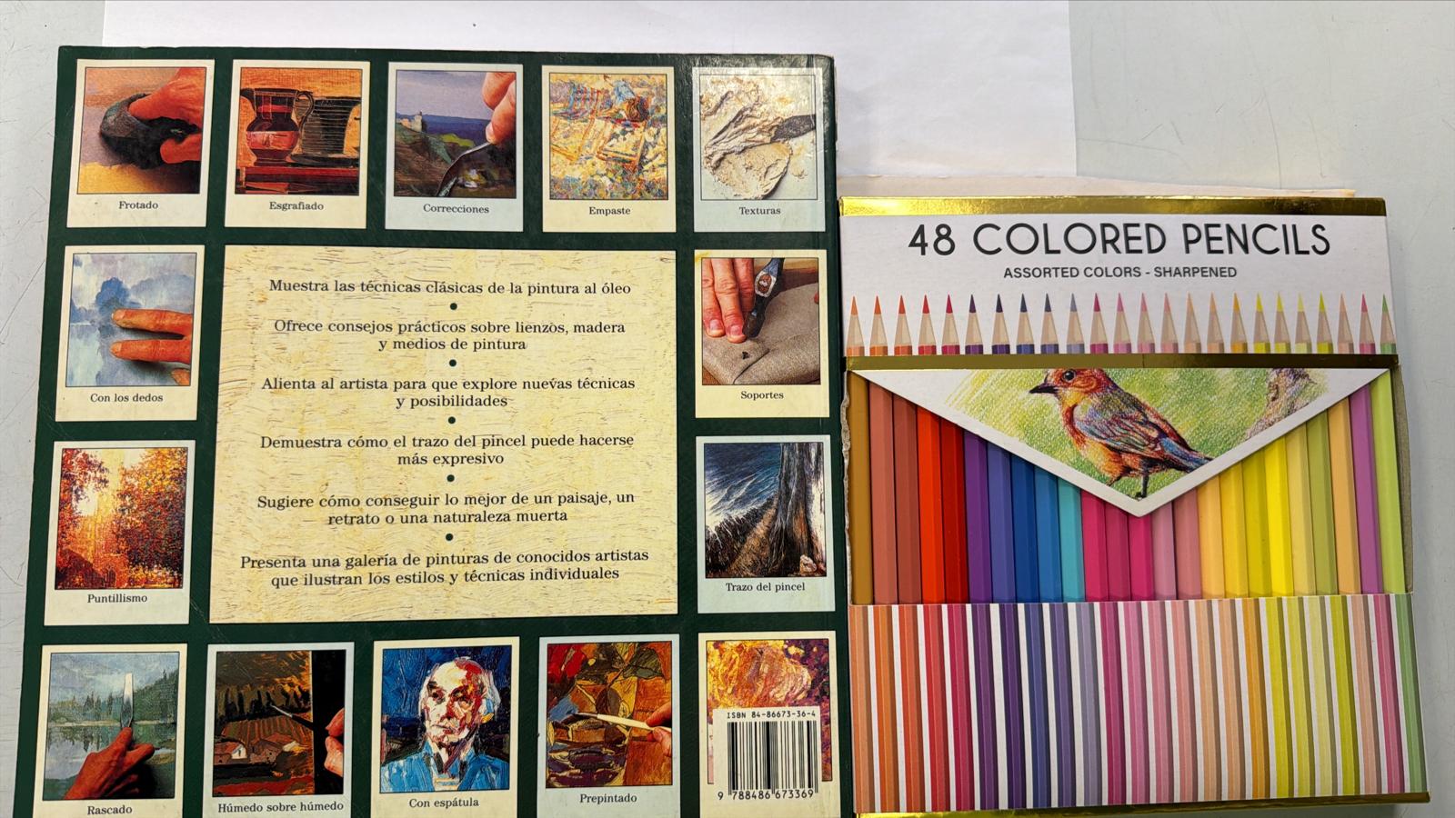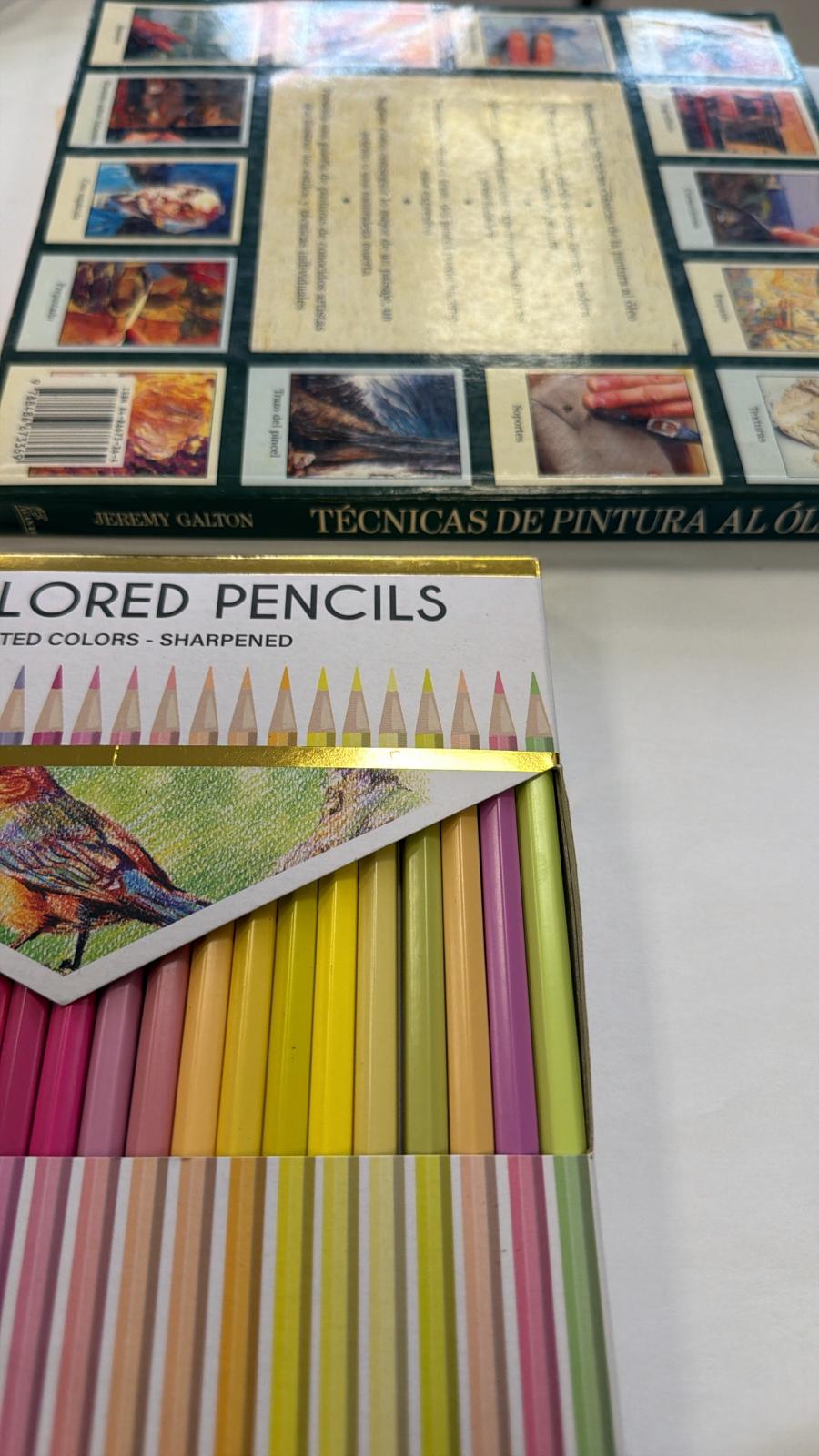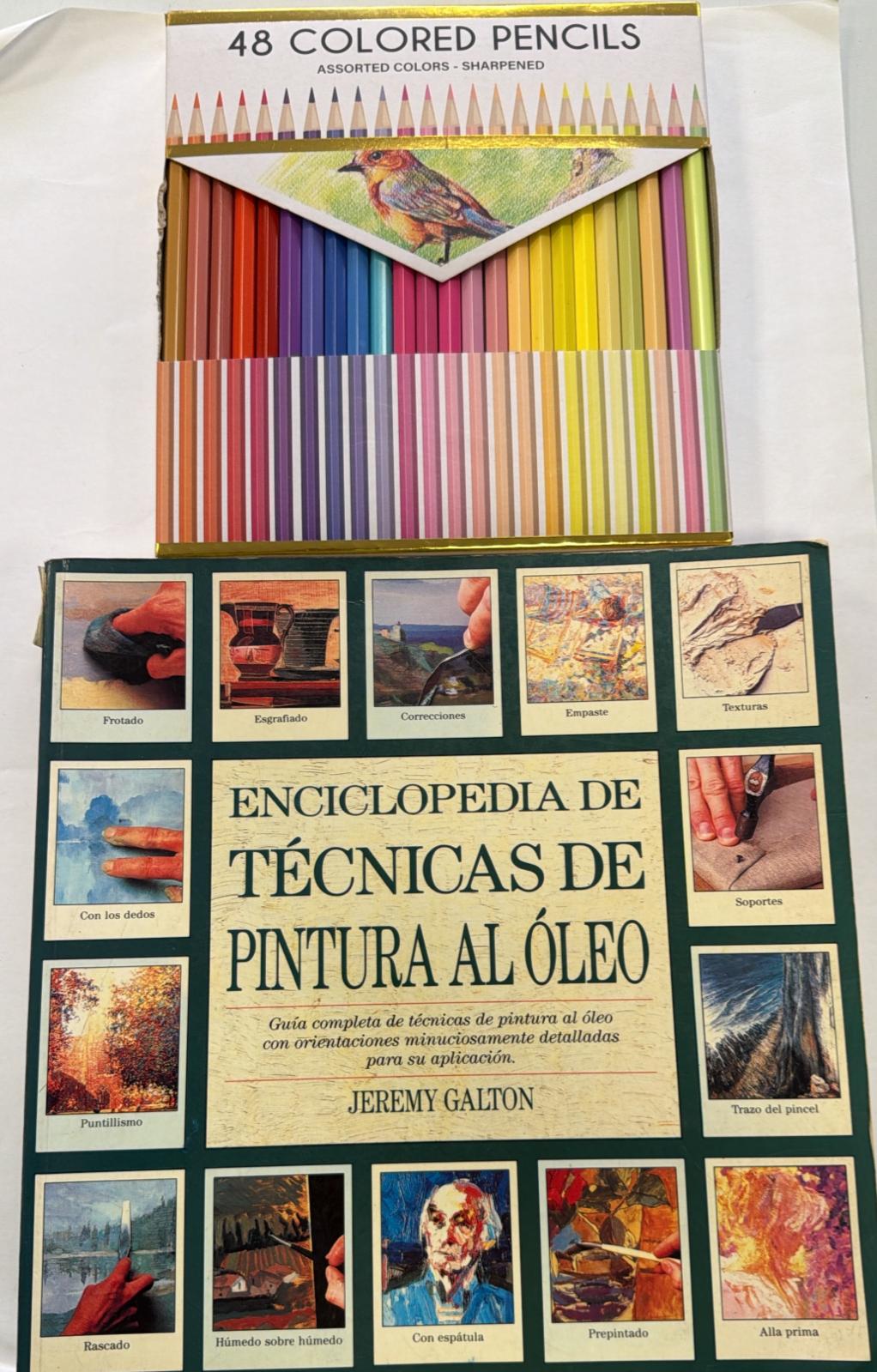 48 lápices de colores y el libro titulado Enciclopedia de técnicas de pintura al óleo, escrito por Jeremy Galton. Guía práctica que detalla diversas técnicas artísticas para pintura al óleo, incluyendo procedimientos como empaste, texturas, esgrafiado, veladuras y técnicas de aplicación con espátula o pincel, entre otras. Desperfeccto estetico en el libro como se observa en las imagenes .