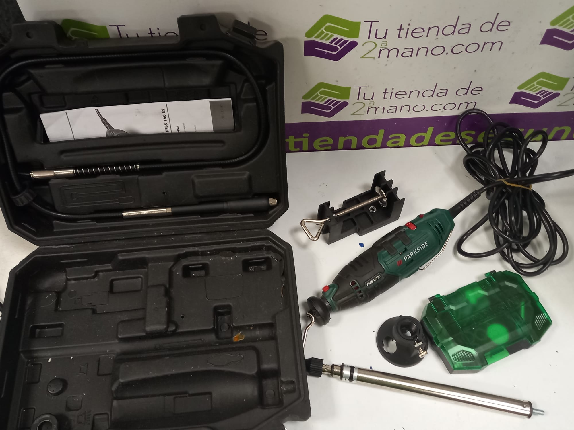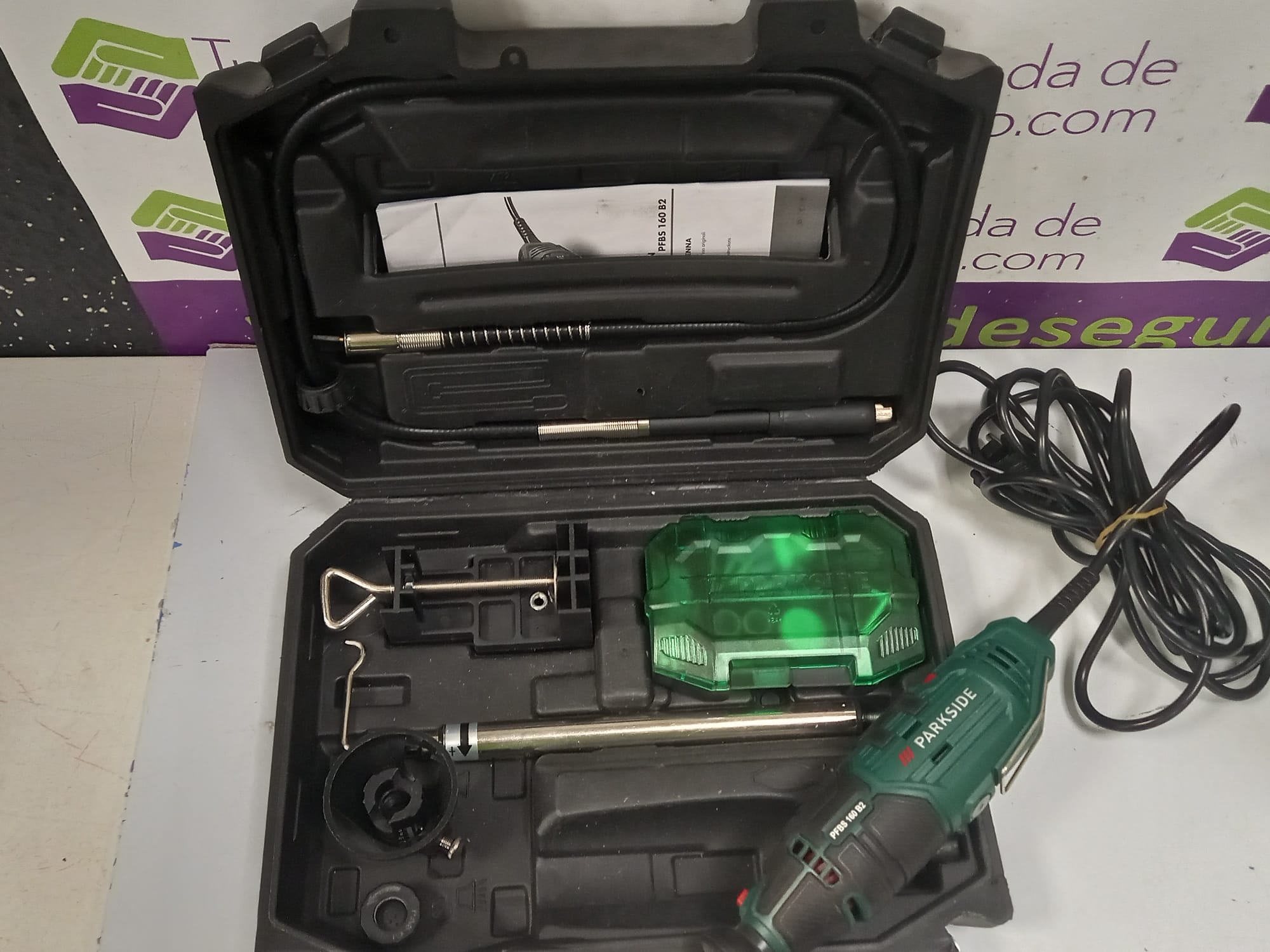 Esmeriladora Parkside, modelo PFBS160 B2. Añade maletín. Potencia de 160W. Potencia con regulación. Añade algunas puntas.