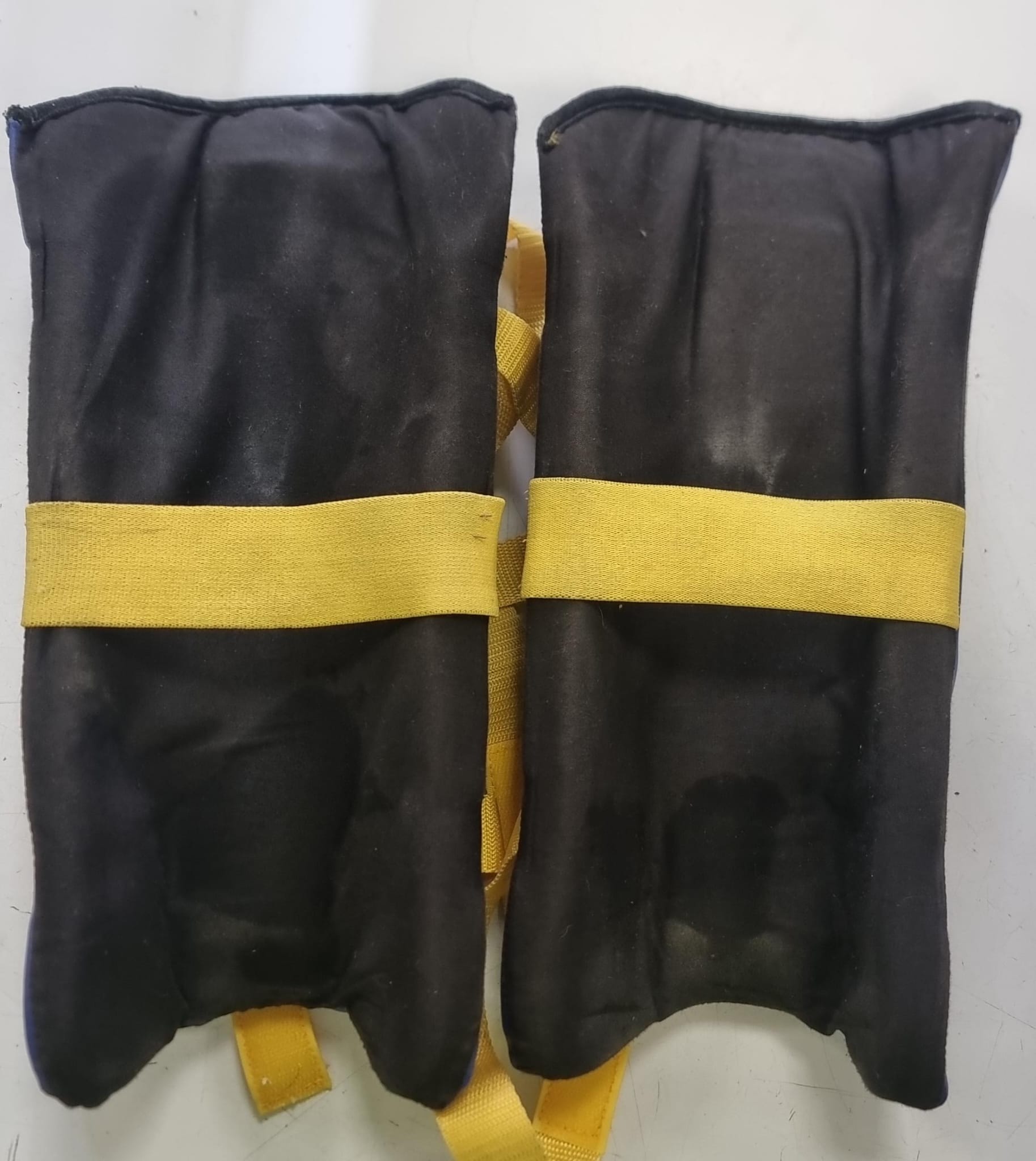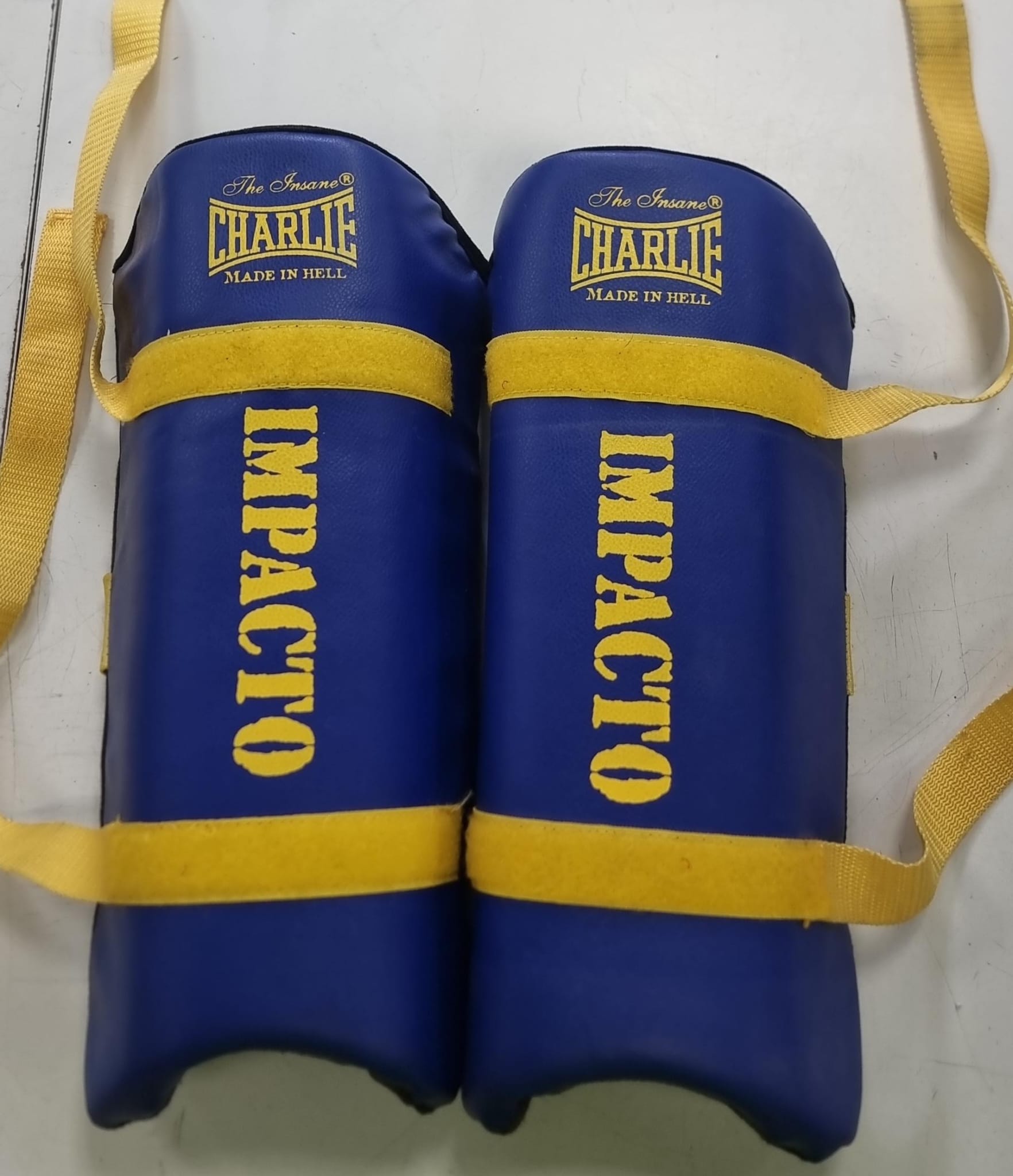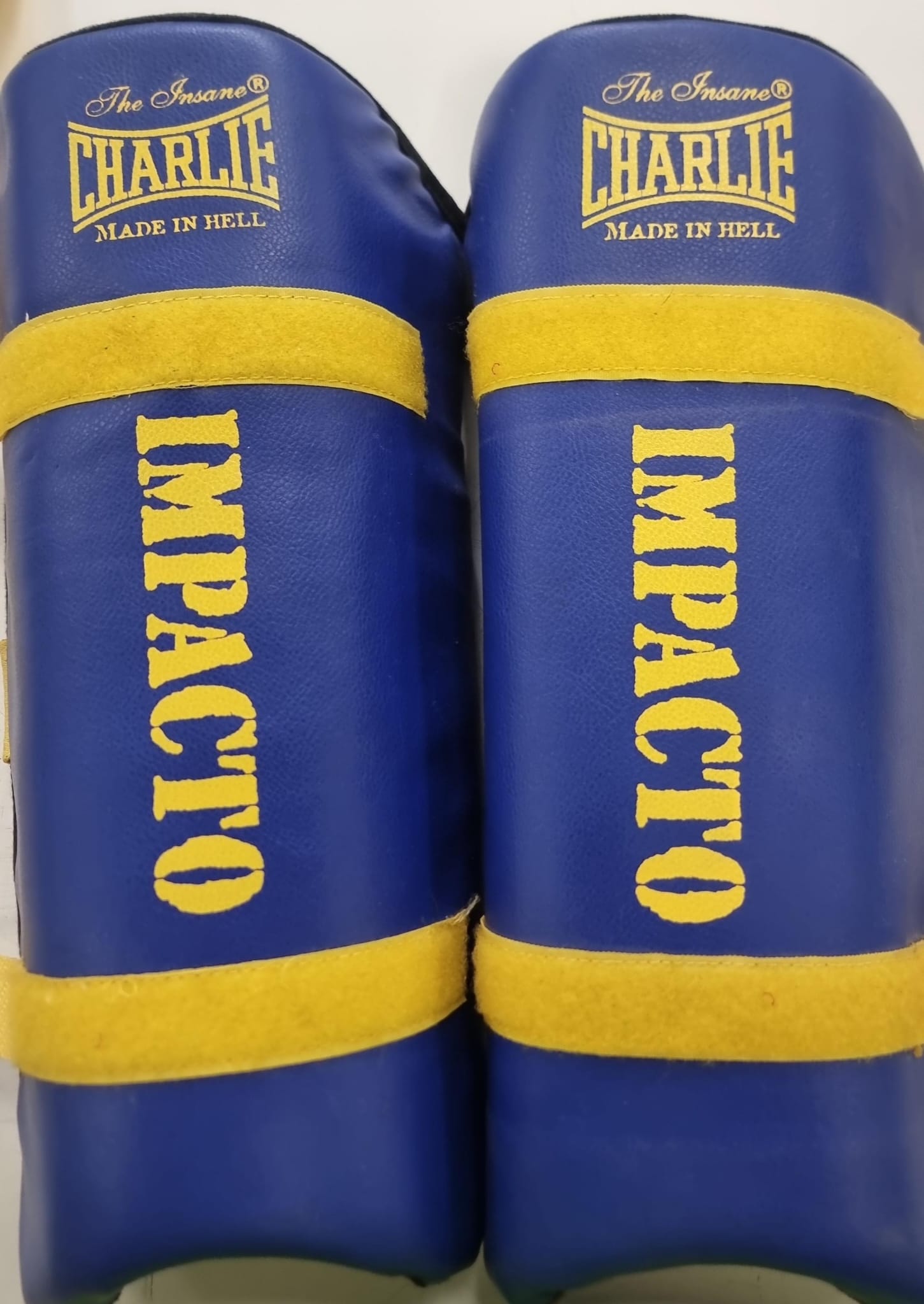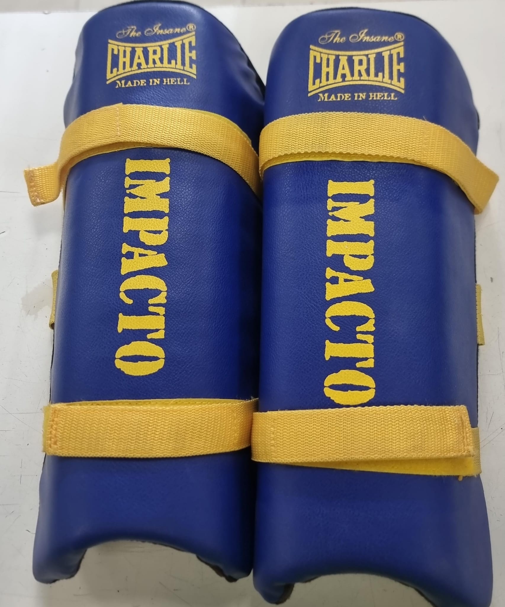 Par de espinilleras de la marca Charlie, modelo Impacto.Color azul con detalles en amarillo. Cintas de sujeción amarillas.