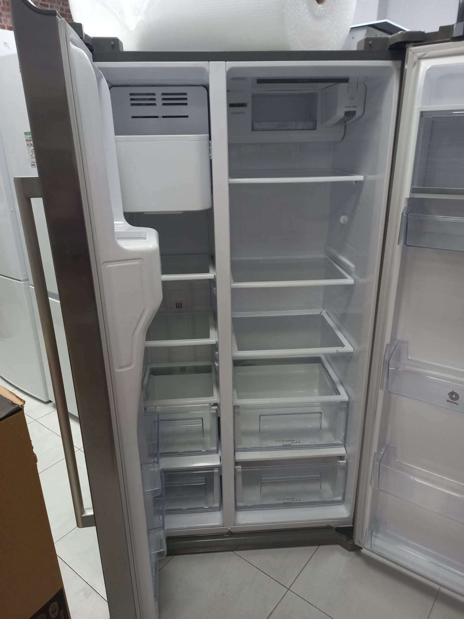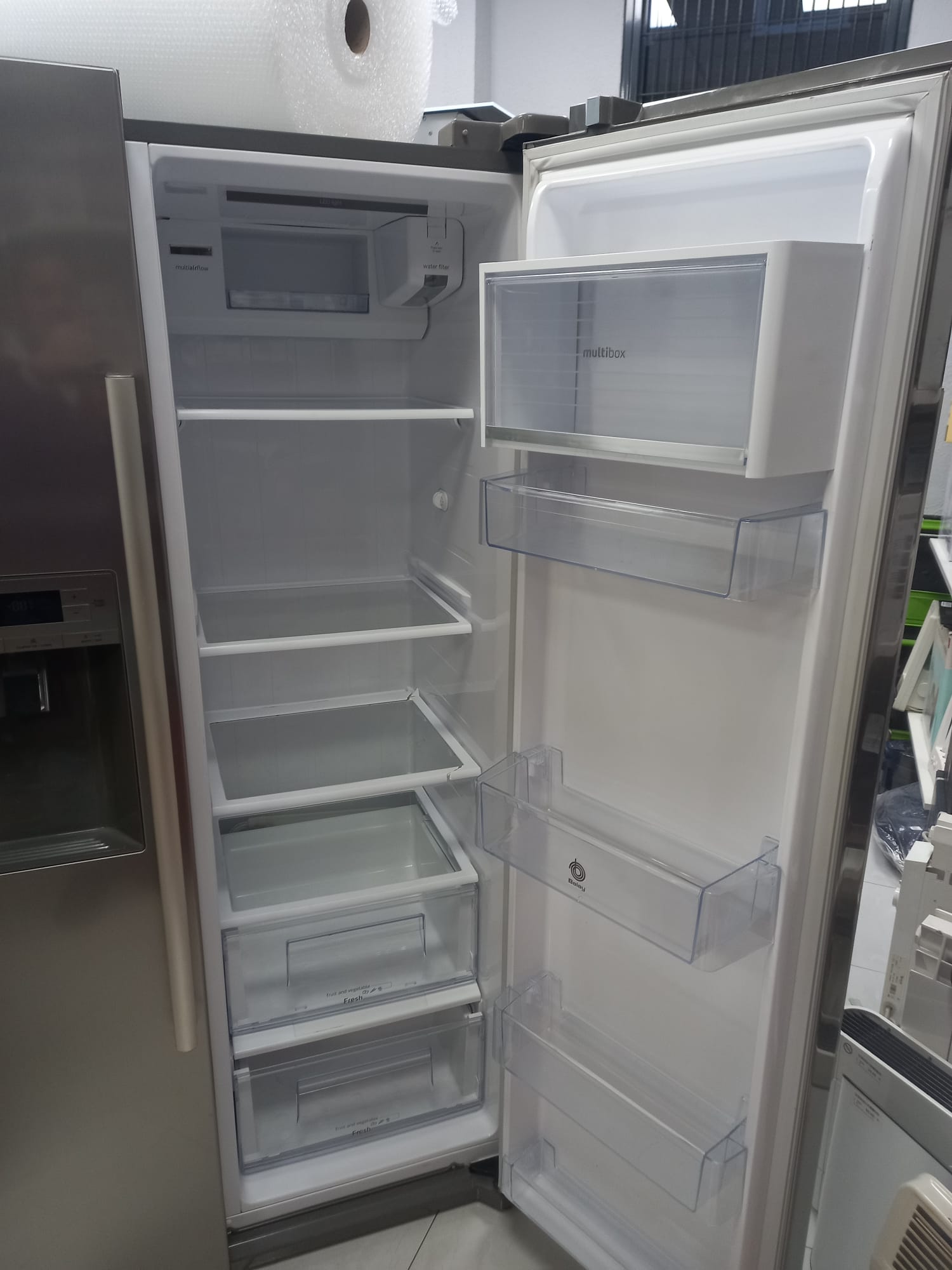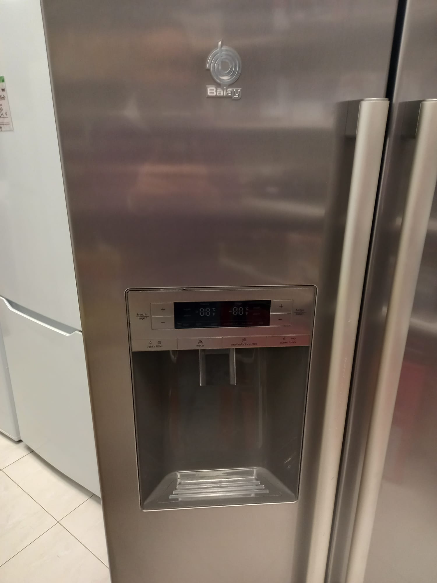 Puertas acero de inoxidable antihuellas. Clase eficiencia energética A++. Dimensiones (alto x ancho): 177 cm x 91 cm. Tecnología No Frost. Electrónica táctil digital integrada en la puerta. 2 baldas con algún ligero desperfecto como se aprecia en las imágenes. Sistema eficiente de iluminación mediante LED. Sensores inteligentes de control de la temperatura. Dispensador de agua, hielo en cubitos y hielo picado. Compartimento multibox con tapa abatible. Zona fría para latas.