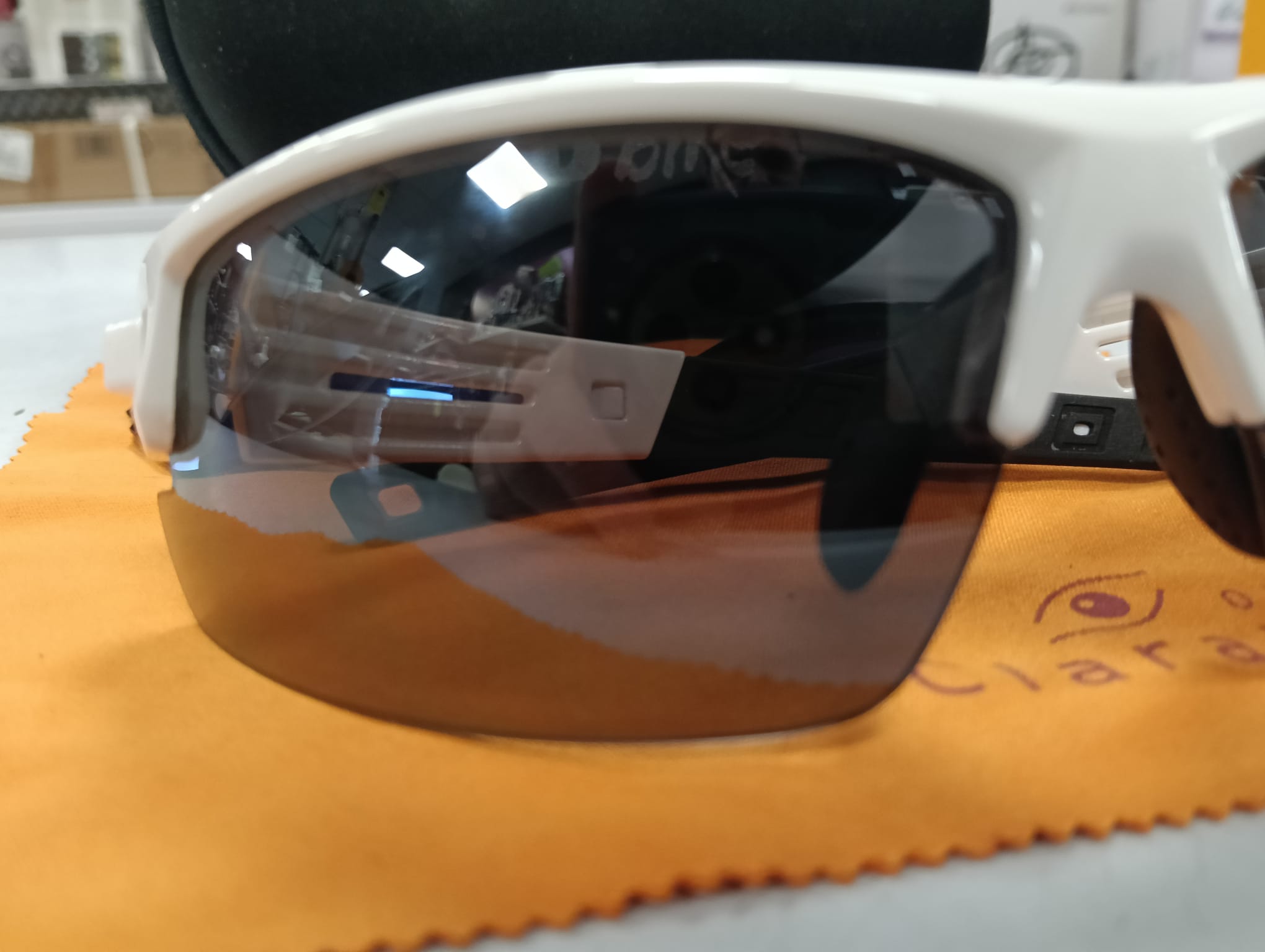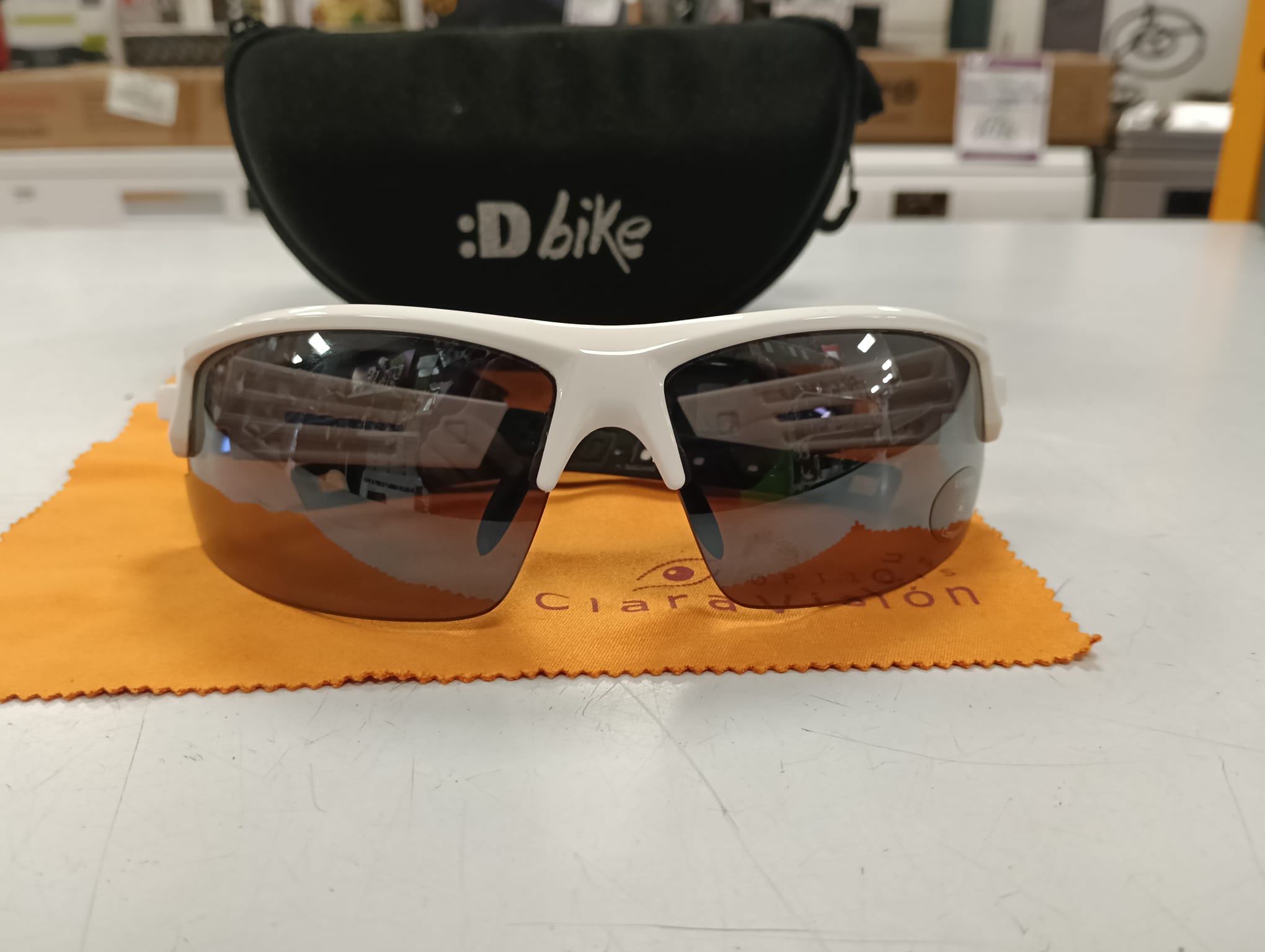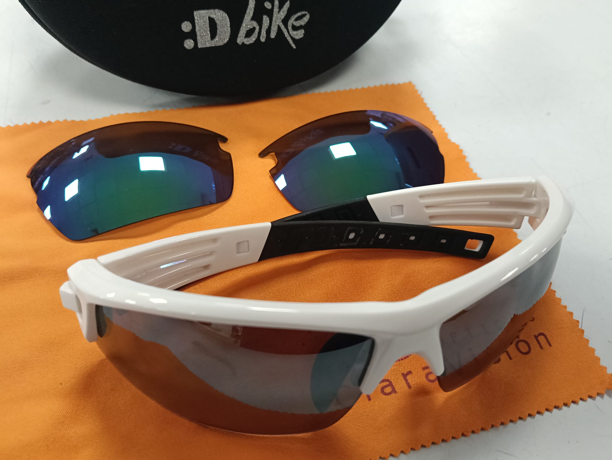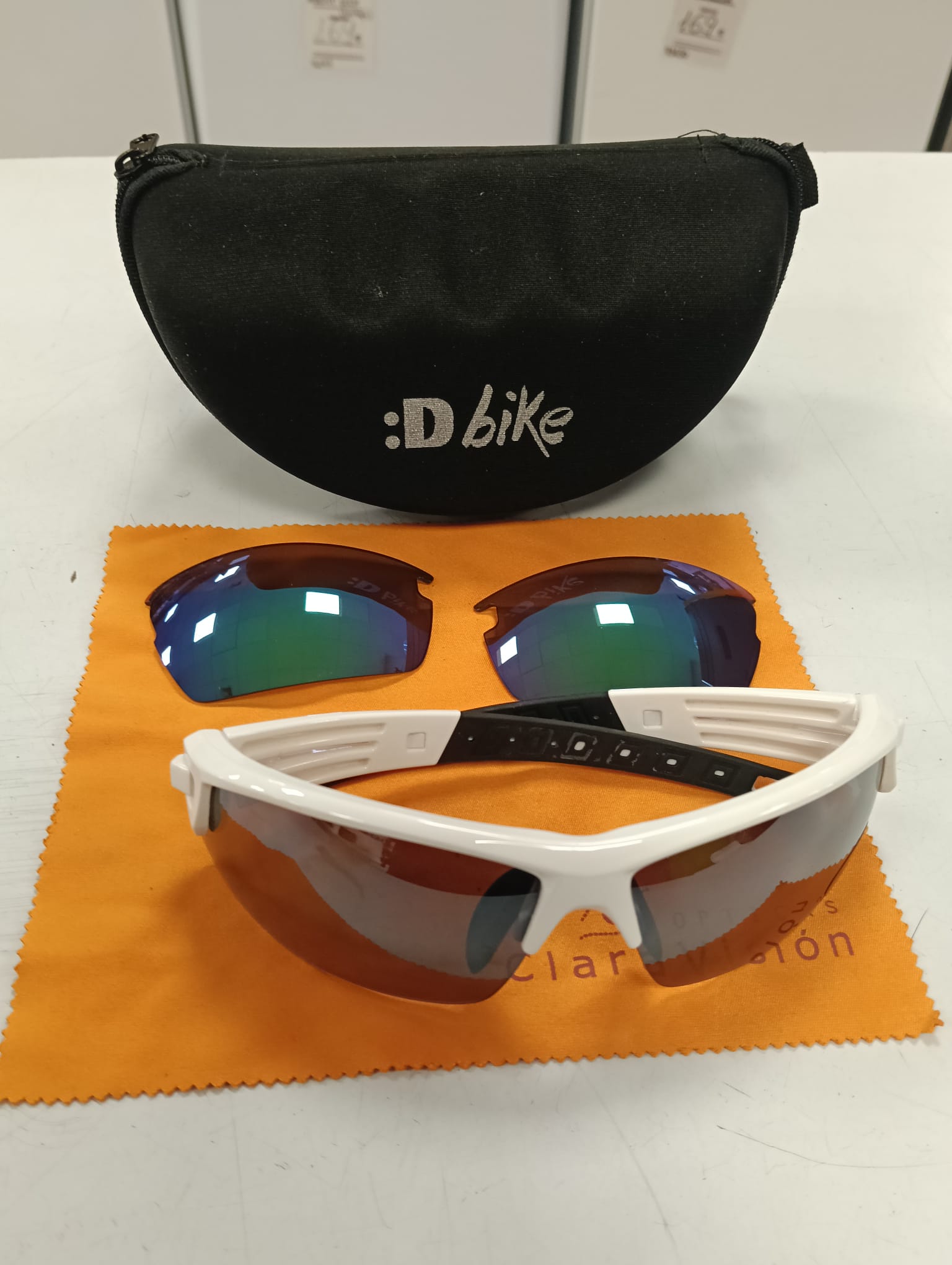 Set de gafas de ciclismo D Bike con lentes intercambiables. Incluye funda protectora. Montura blanca. Lentes de espejo con acabado multicolor. Incluye funda rígida negra.