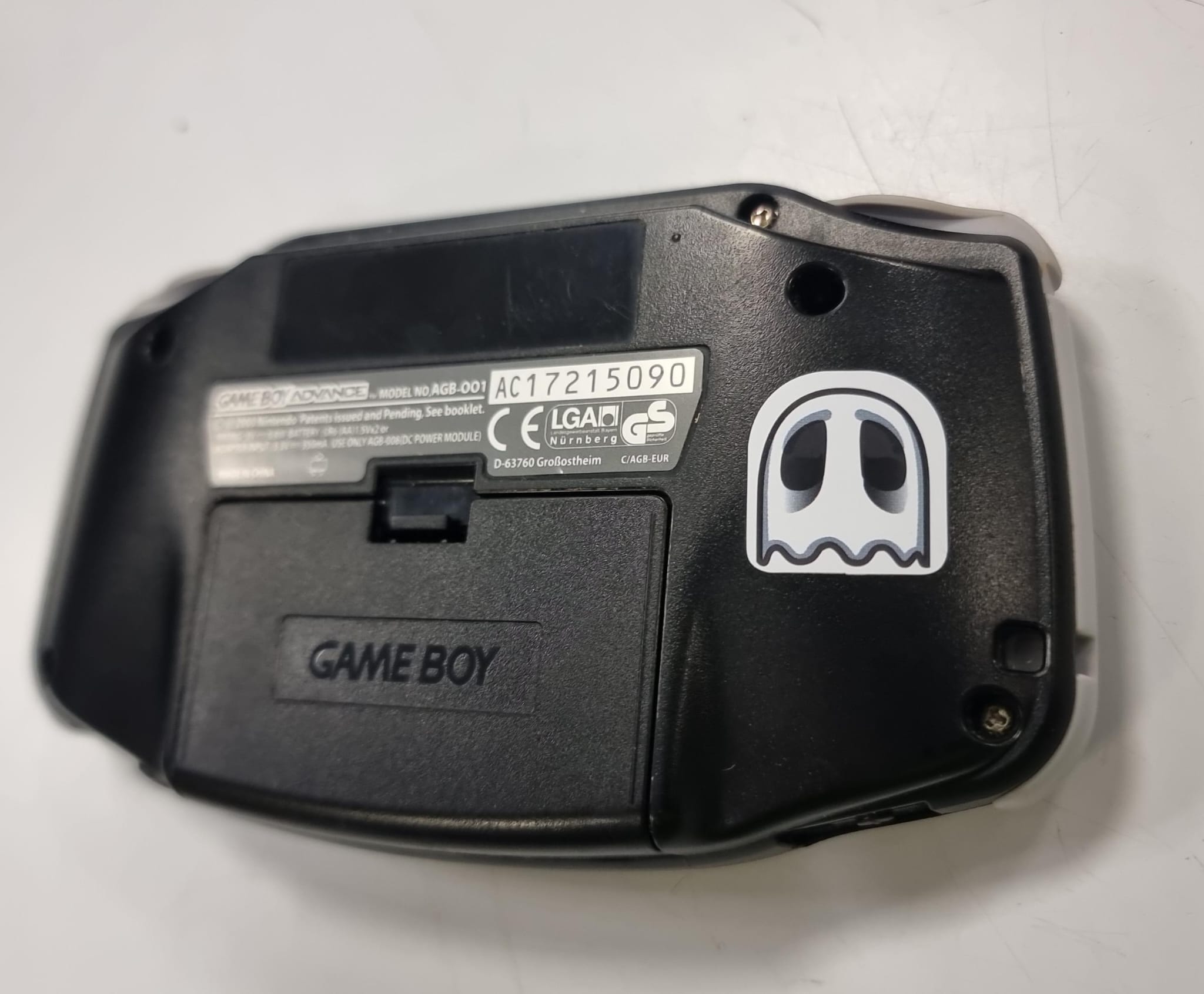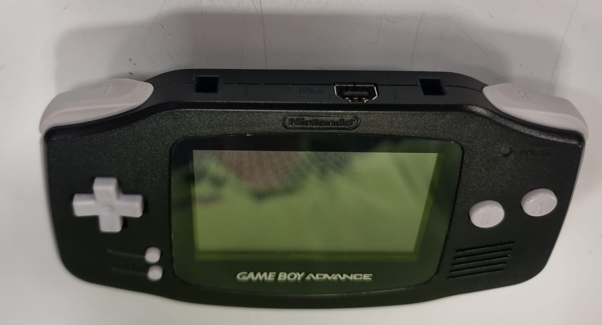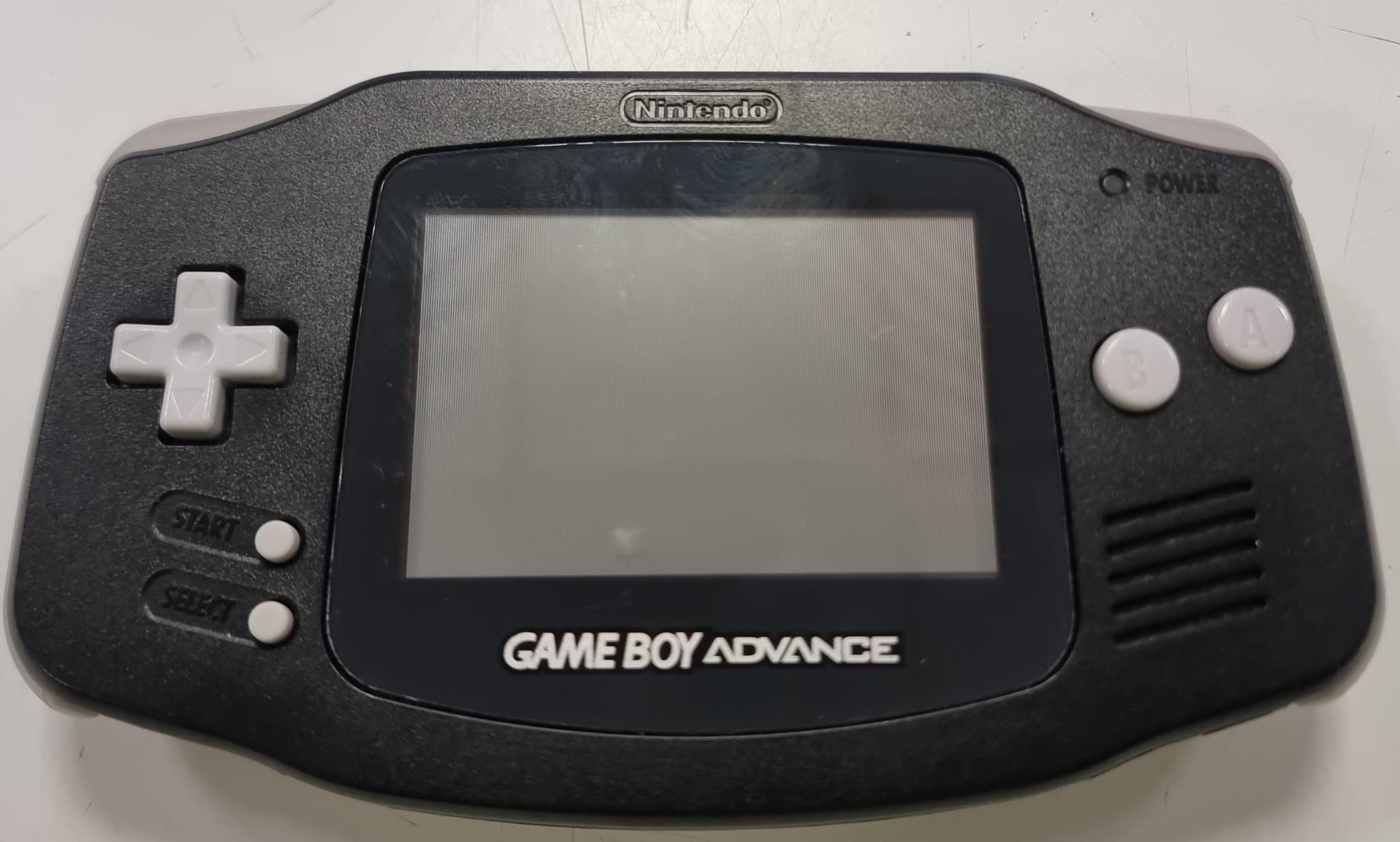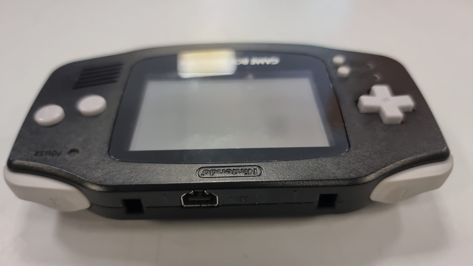 Consola portátil Game Boy Advance en colores negro y gris. Diseño ergonómico.Botones de control. Pantalla de visualización.