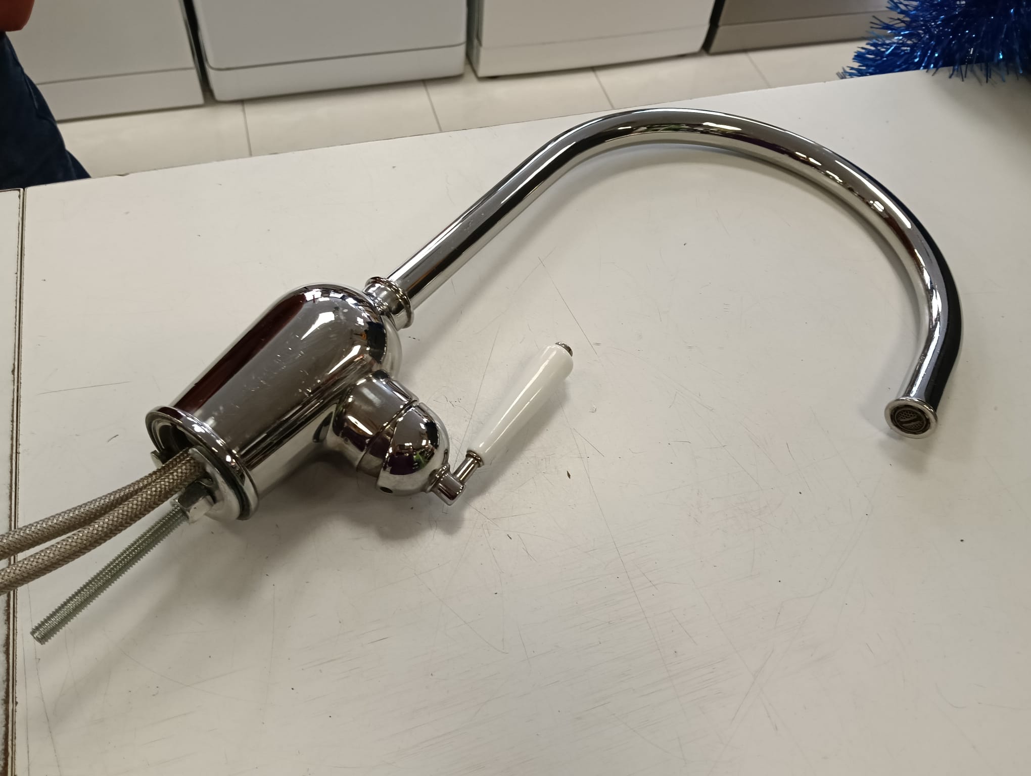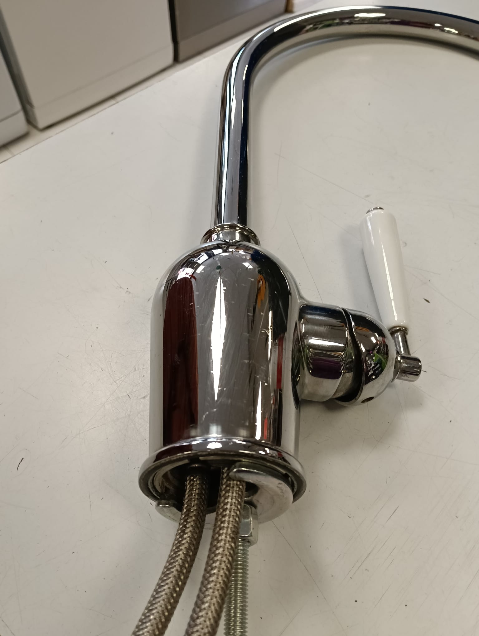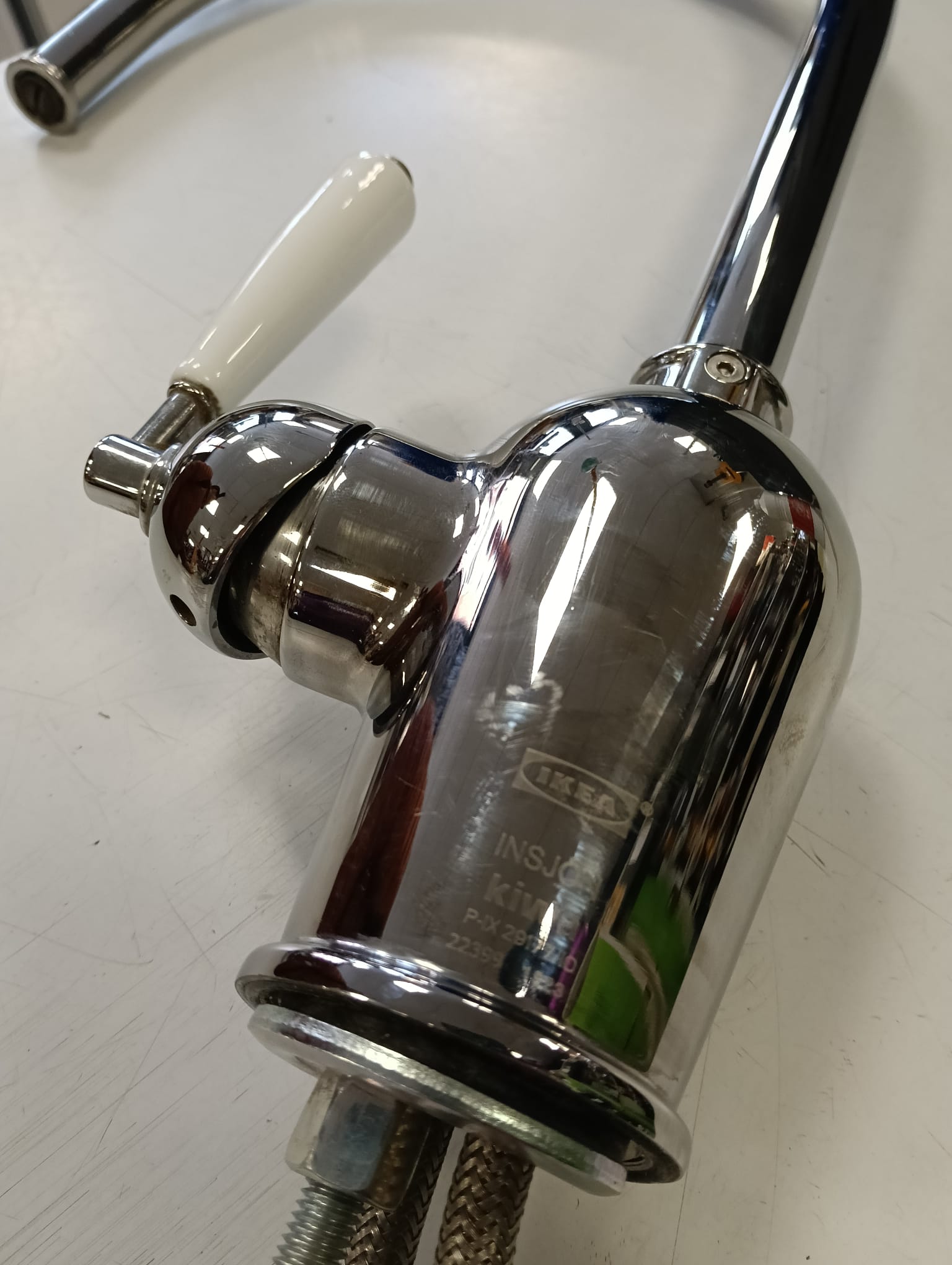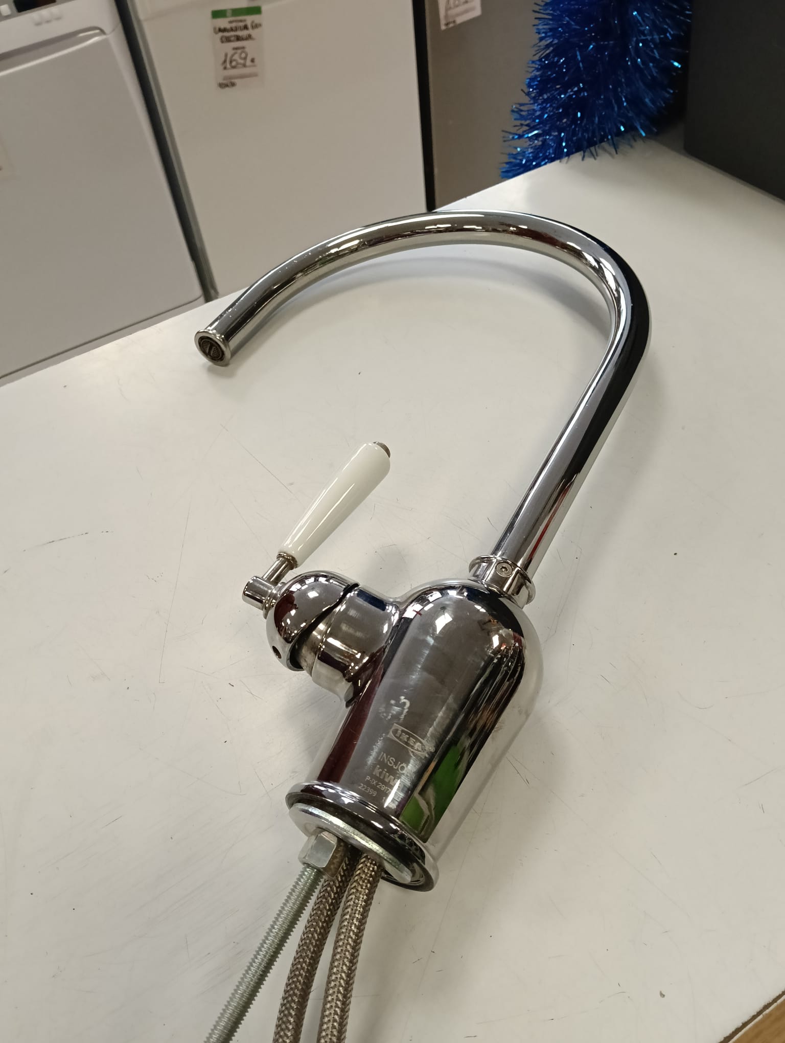 Grifo de cocina, modelo Ikea Insjon. Cromado. Pomo monomando con cubierta en blanco. Altura de grifo desde la base 40cm.