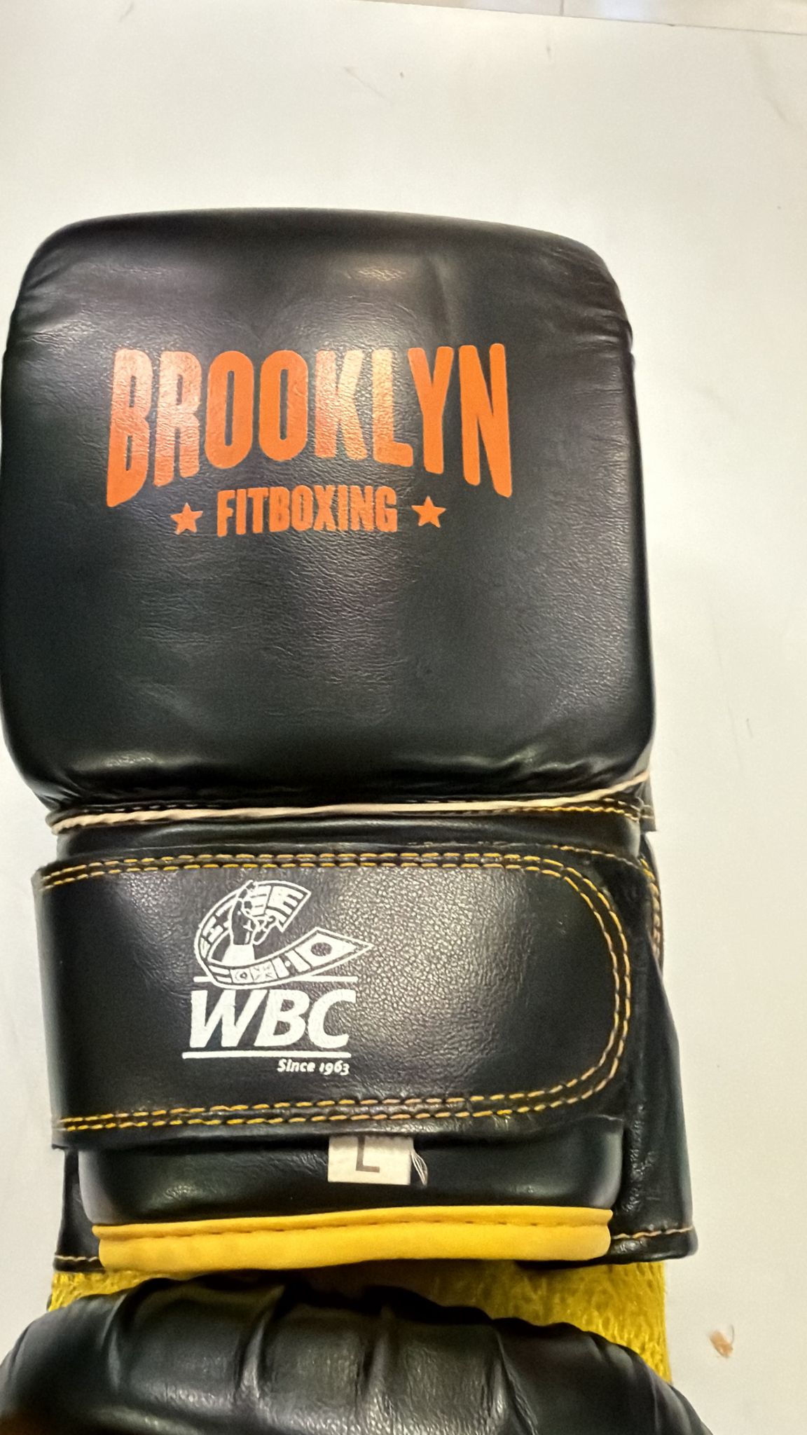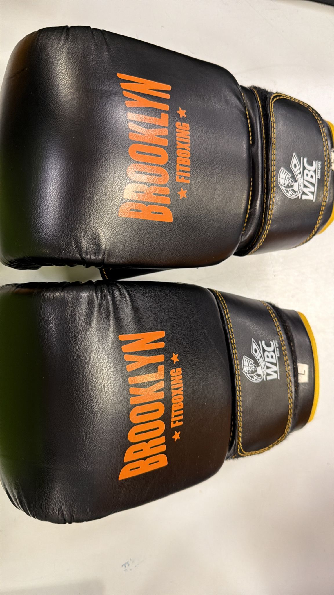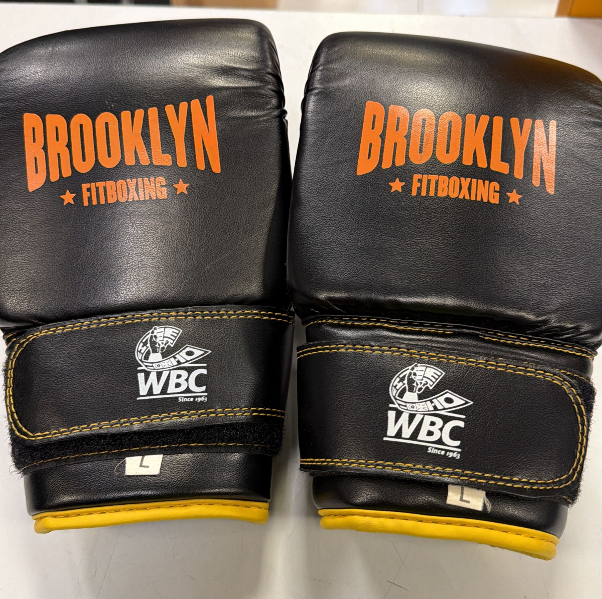 Par de guantes de boxeo Brooklyn Fitboxing en talla L. Diseñados para entrenamiento.Color negro con detalles en naranja. Cierre de velcro ajustable. Logo de WBC en la muñeca.