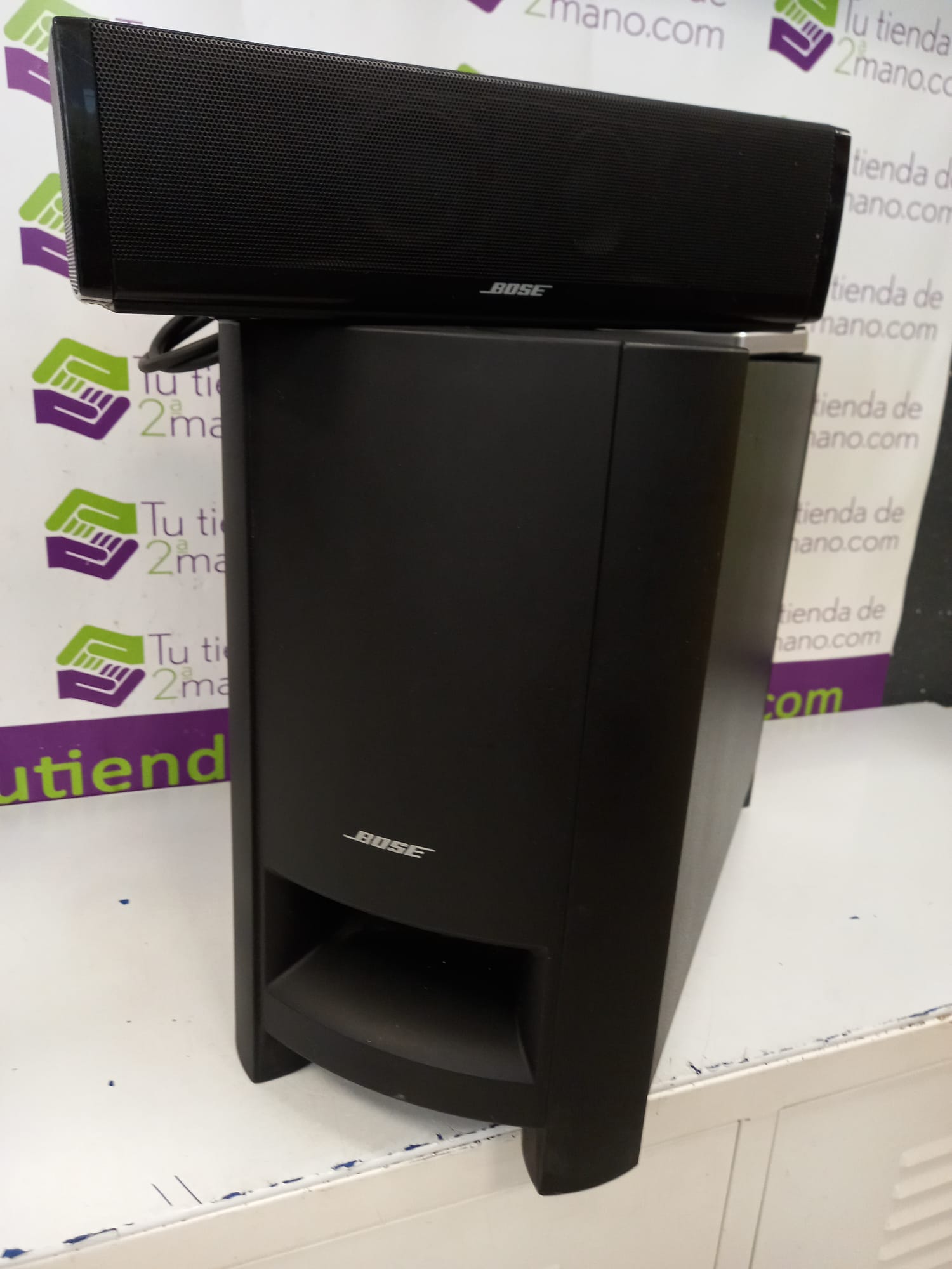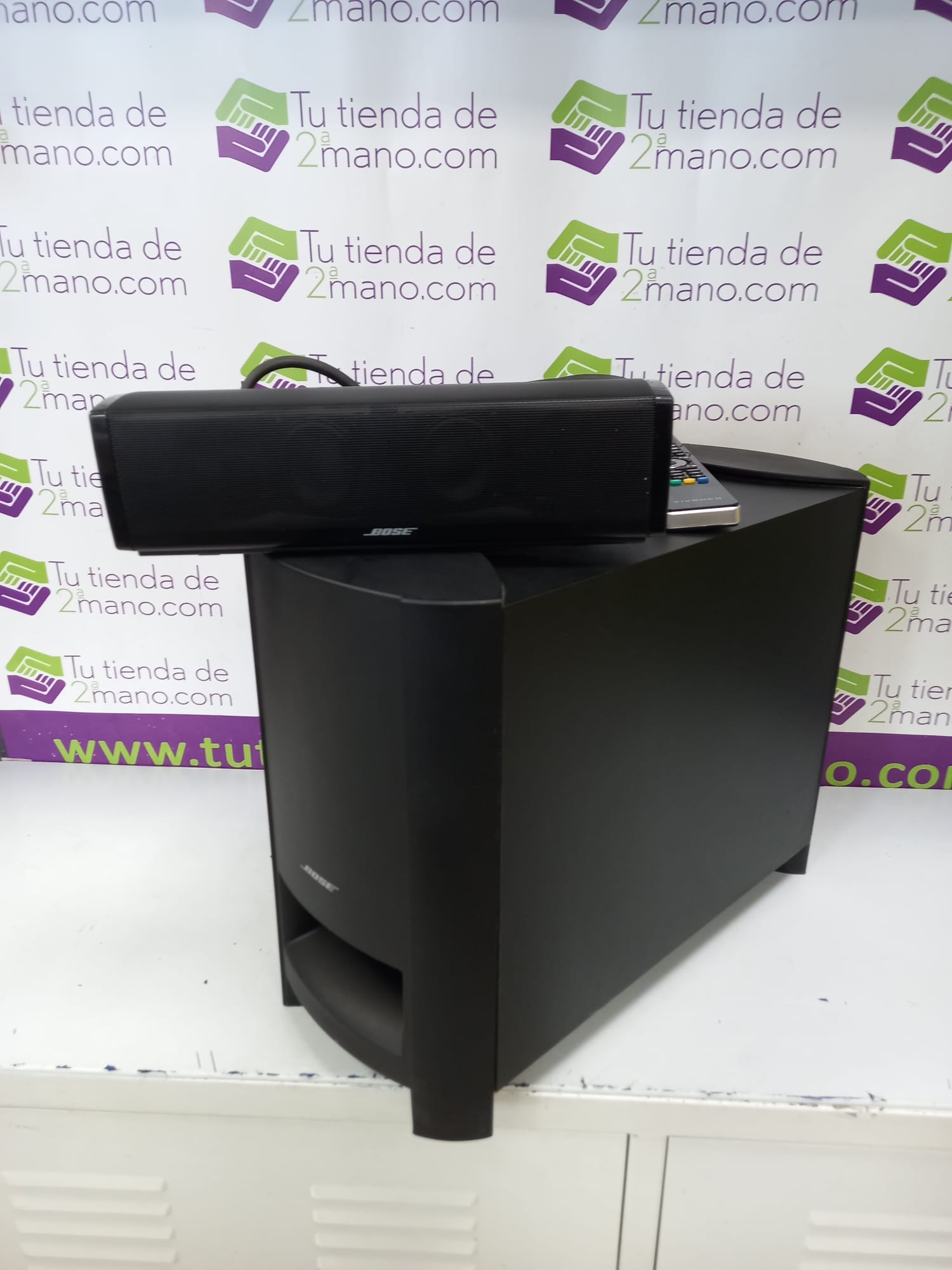 Sistema de altavoces para cine en casa Bose CineMate 15. Bluetooht, entrada de audio digital óptica, digital coaxial y una entrada de audio estéreo. Mando no original. Producto con marca en parte superior como se aprecia en imagen.