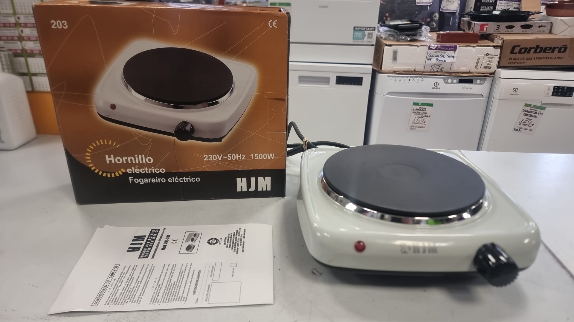 Hornillo eléctrico HJM de 1500W, ideal para cocinar. Modelo: 203 Voltaje: 230V Frecuencia: 50Hz Potencia: 1500W Color: Blanco.