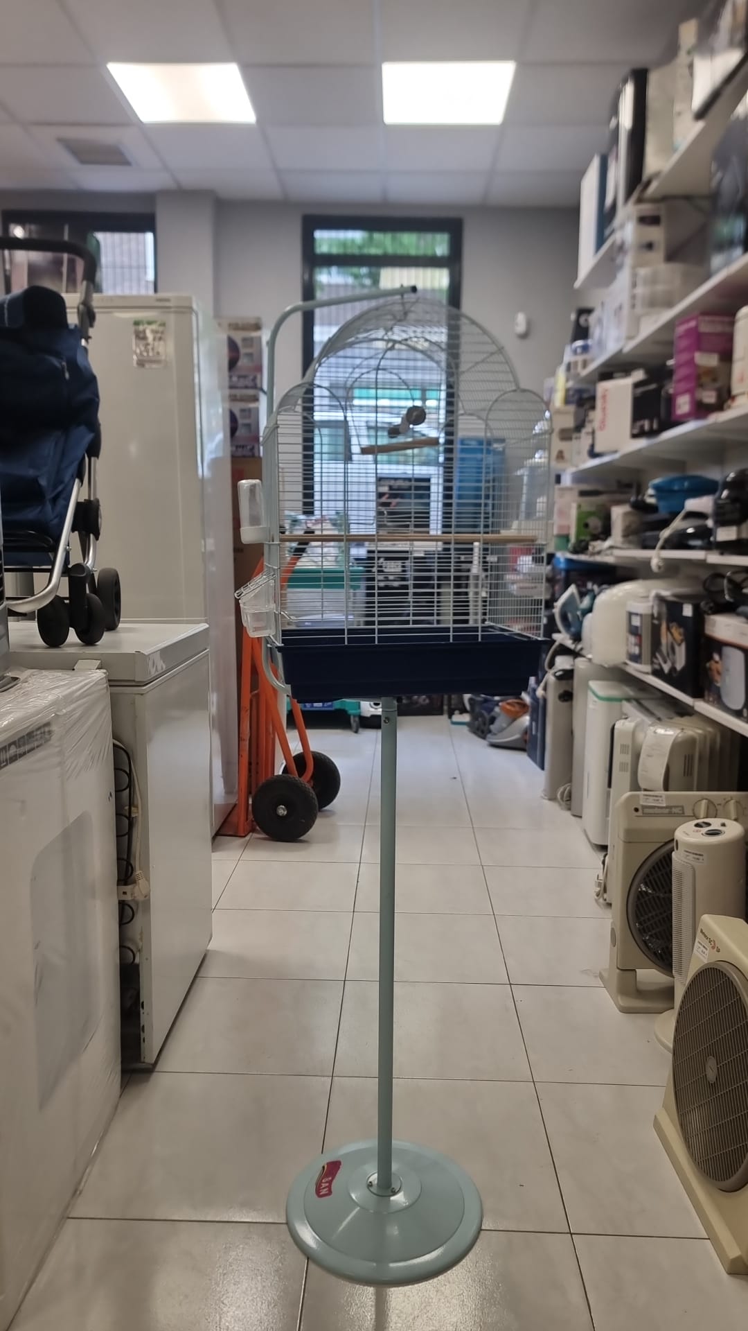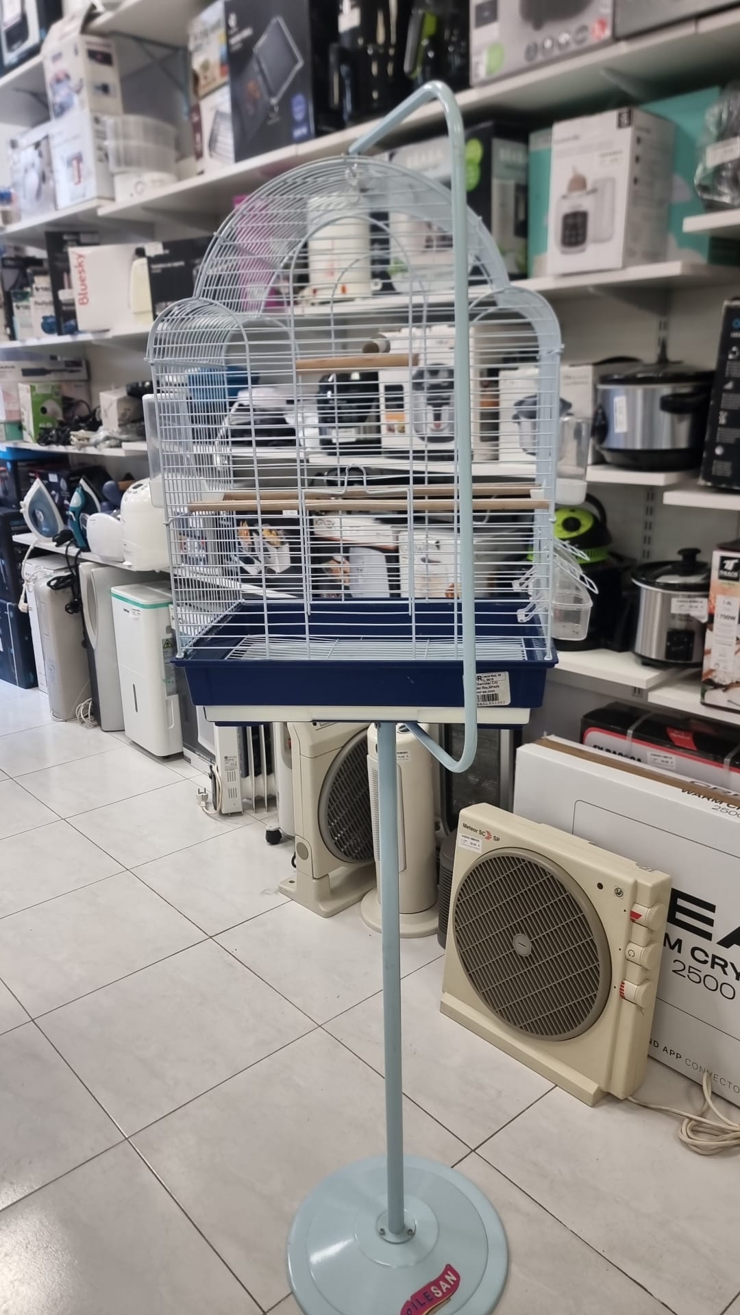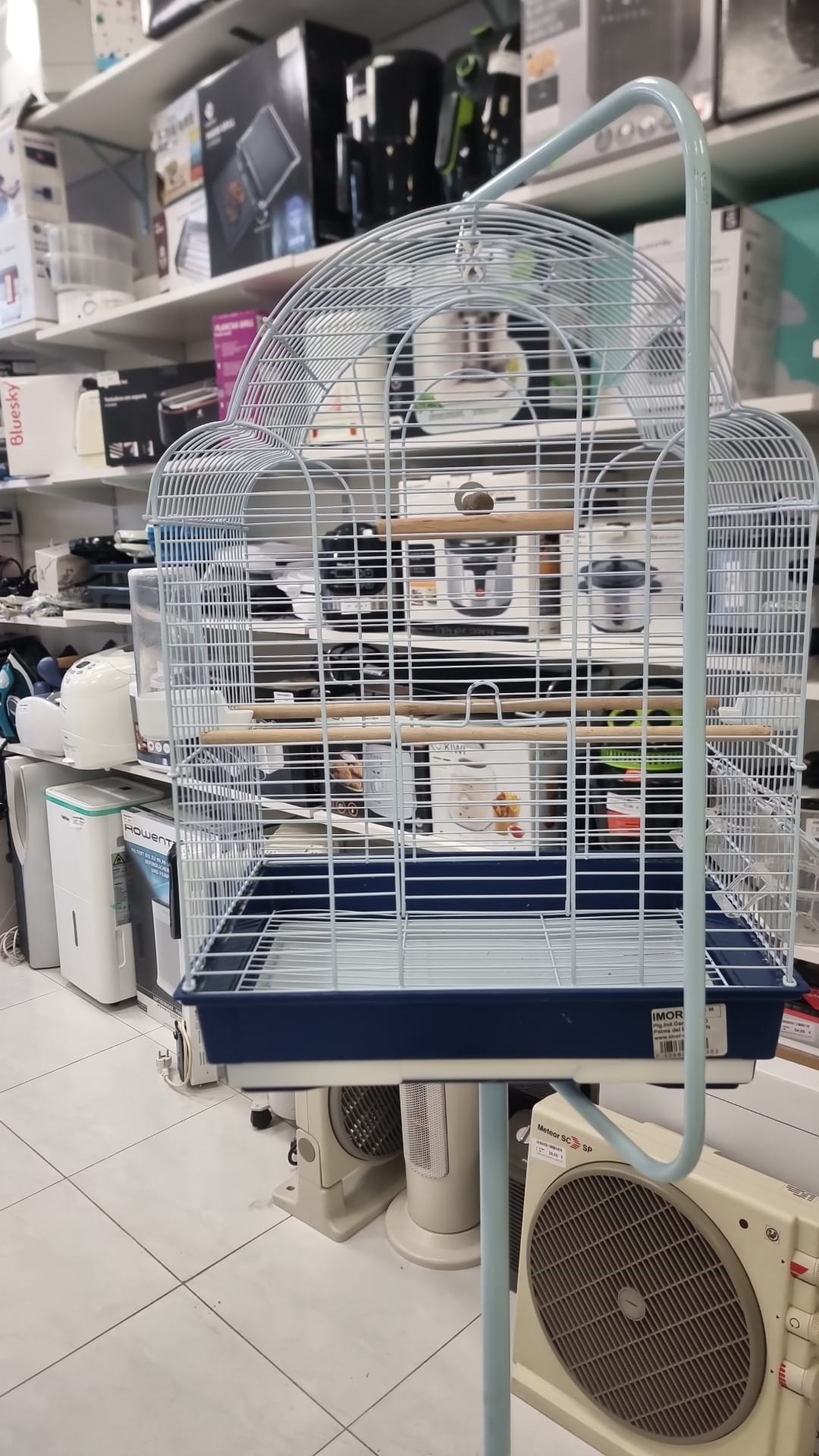Jaula para pájaros con su soporte.Jaula de metal con base azul.Soporte de pie en color azul claro.