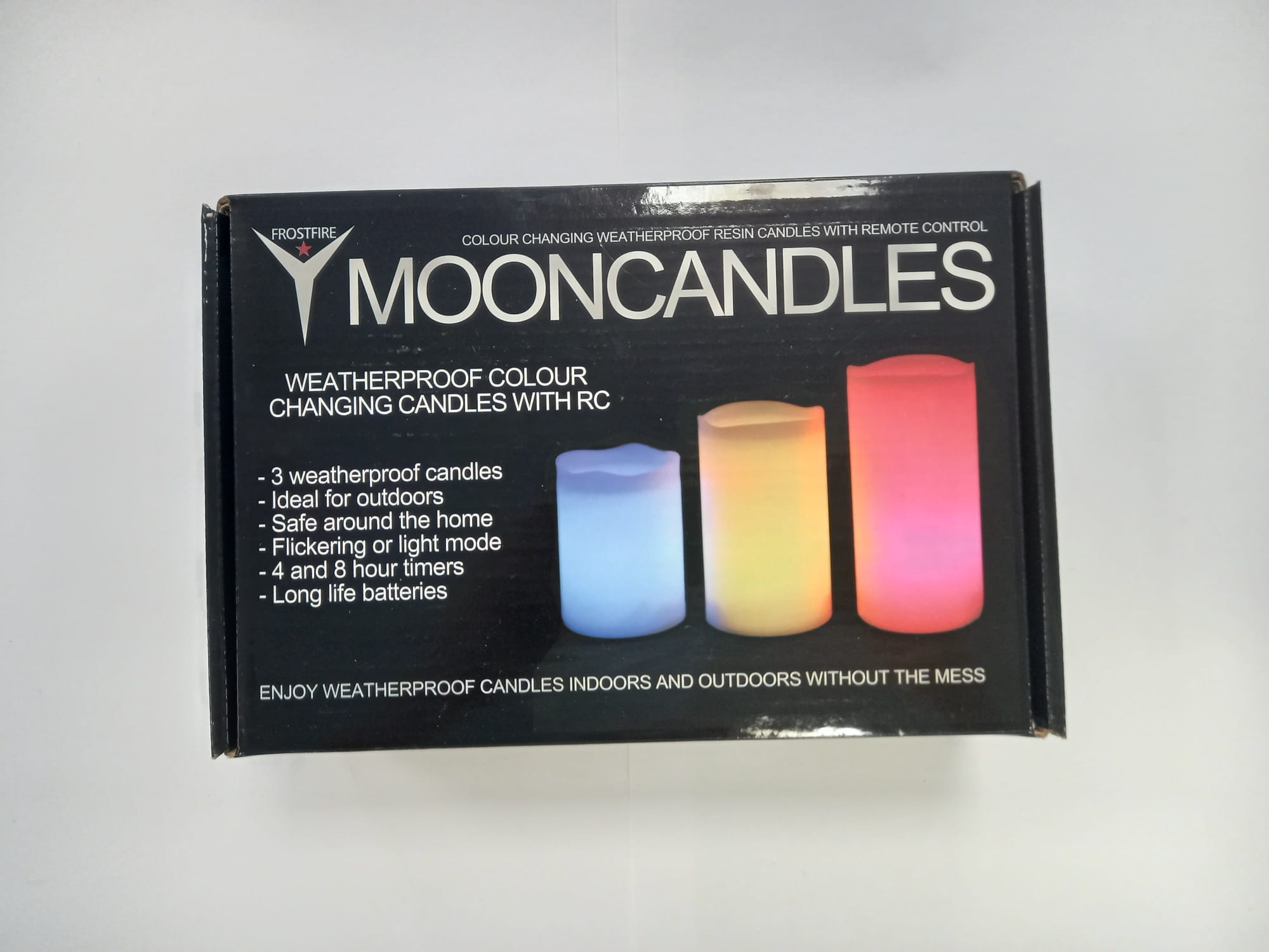 Conjunto de 3 velas LED Mooncandles de Frostfire, perfectas para decoración interior y exterior. Son resistentes a la intemperie y cambian de color. Ideales para exteriores. Seguras en el hogar. Modo parpadeo o luz fija.Temporizadores de 4 y 8 horas.