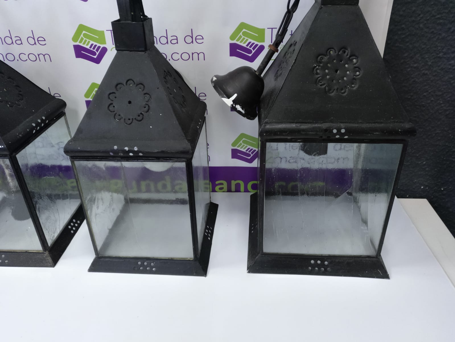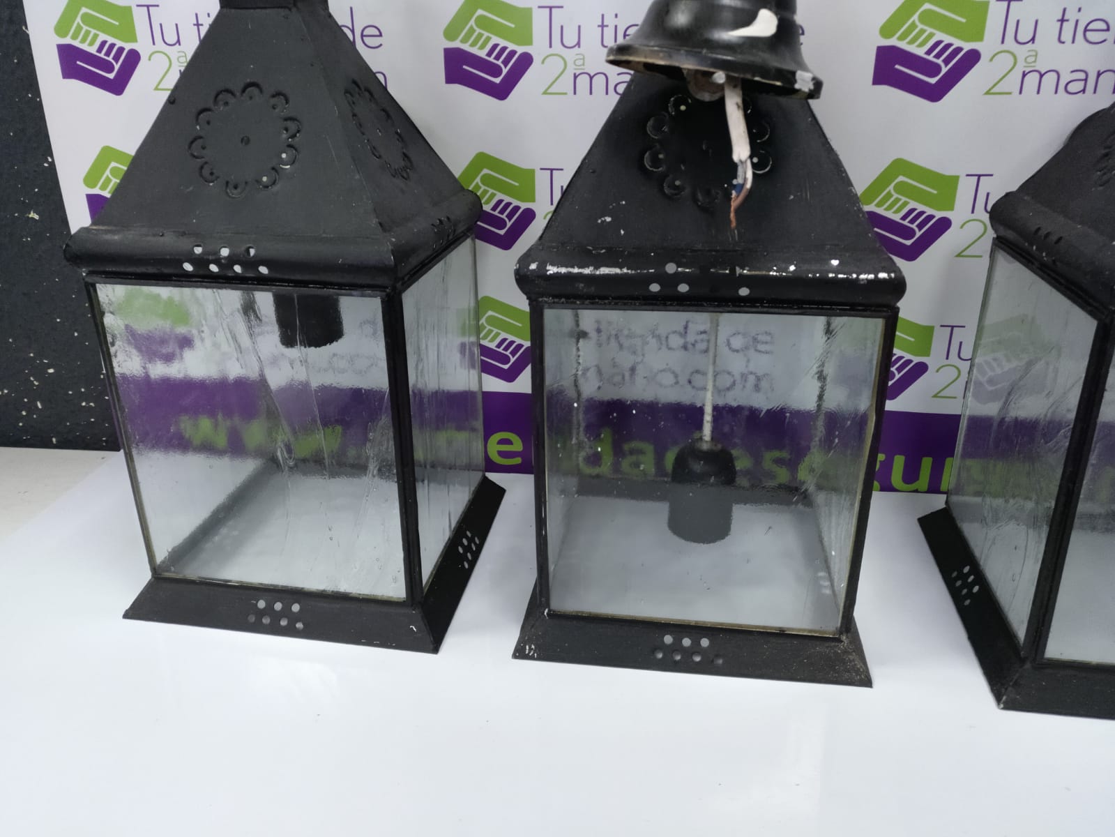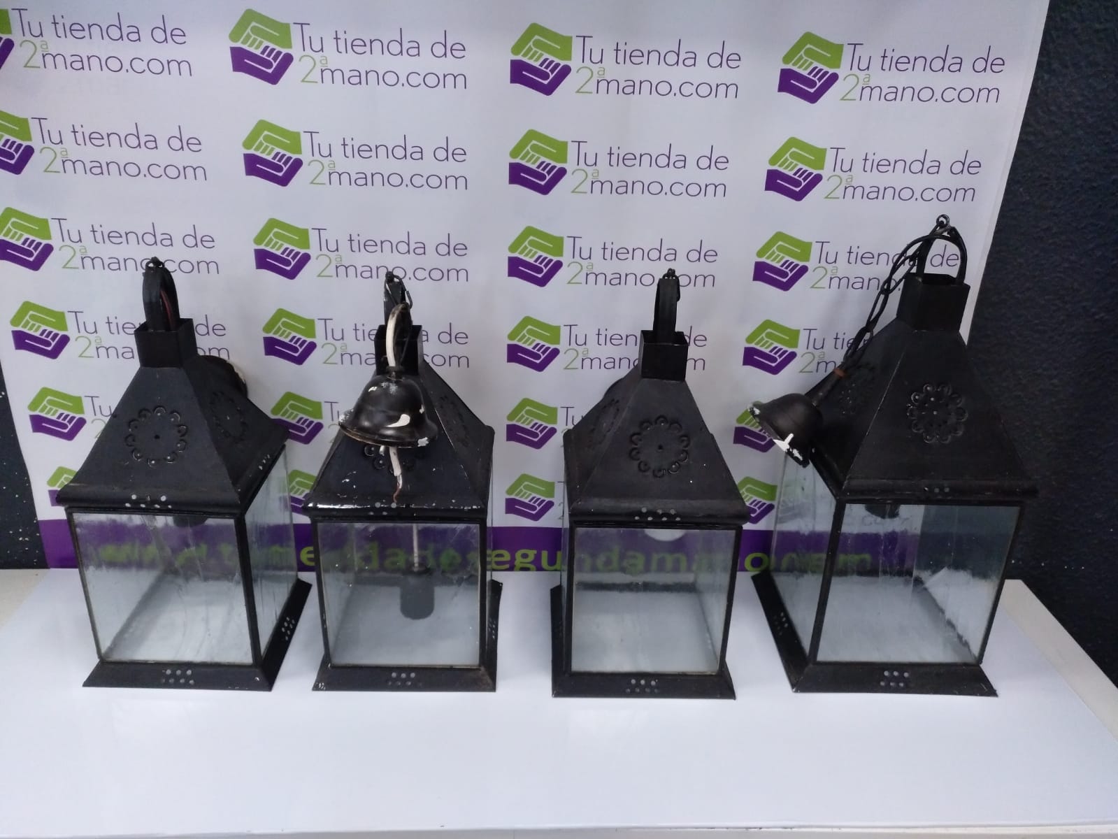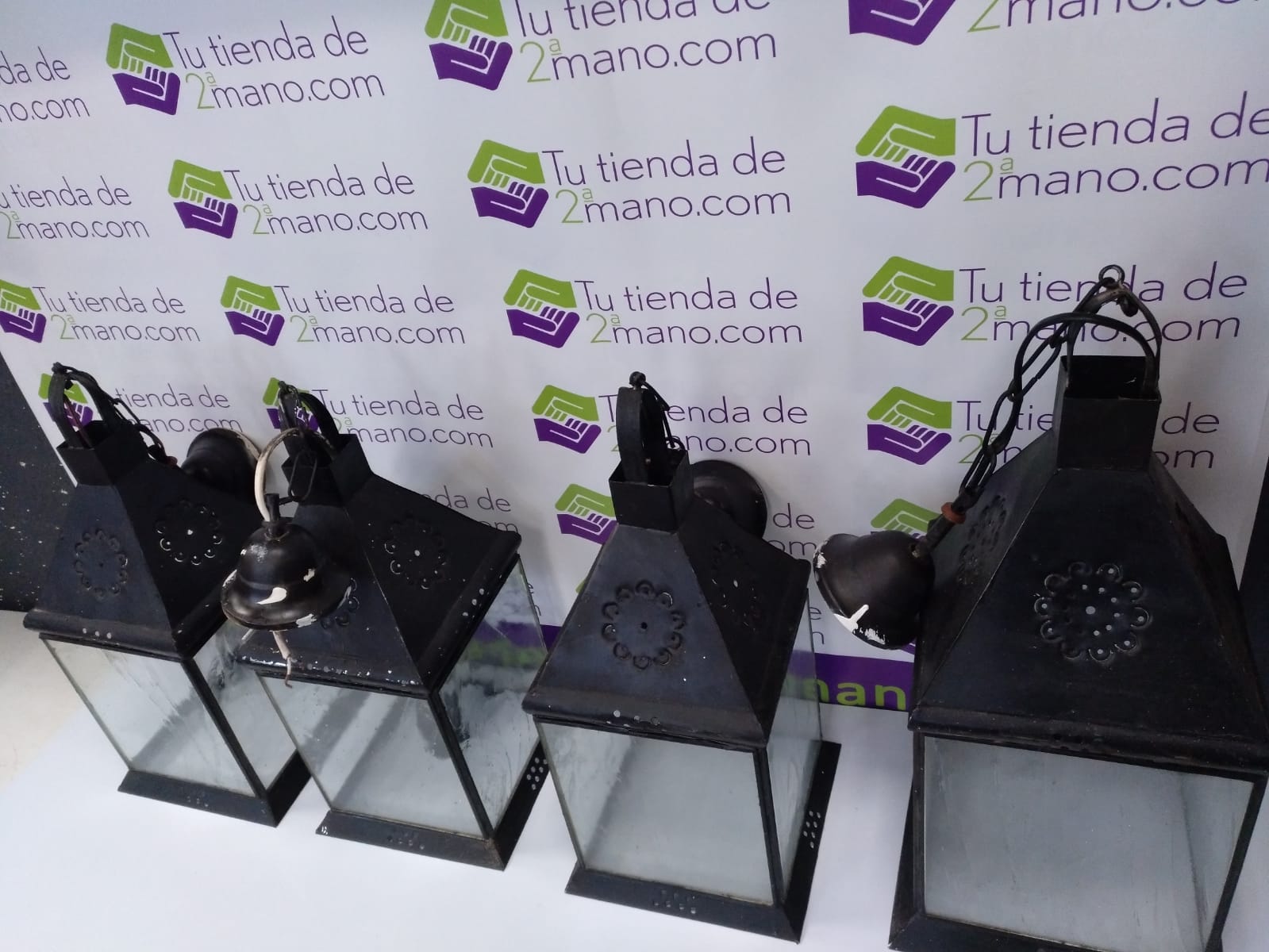 Juego de 4 farolillos metálicos. Color negro. Todos del mismo tamaño, salvo 1 un poco mas grande.