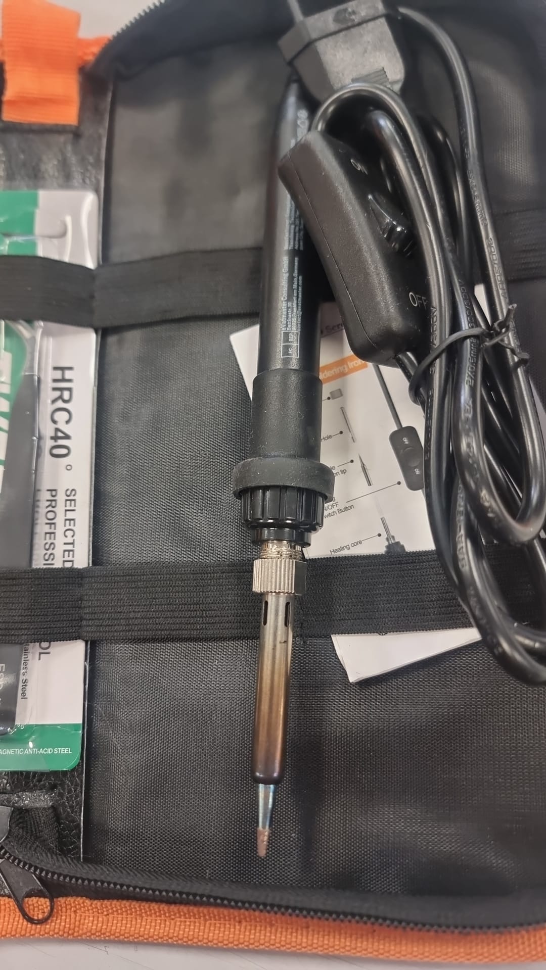 Kit de soldador de estaño Beizkna en color dorado y negro, ideal para trabajos de electrónica. Incluye soldador, desoldador, pinzas y rollo de estaño. Herramientas organizadas en un estuche. Mango del soldador con diseño antideslizante.