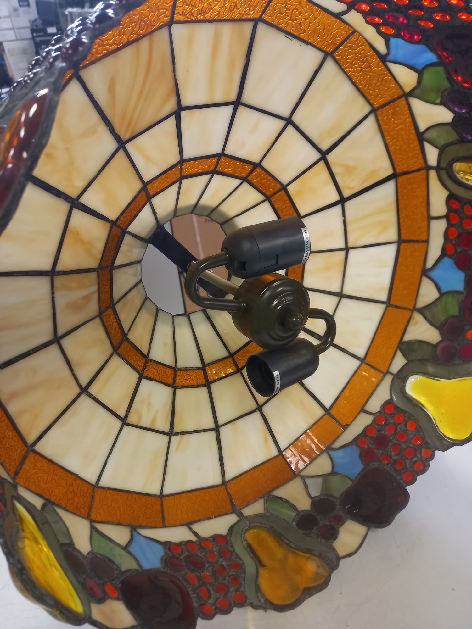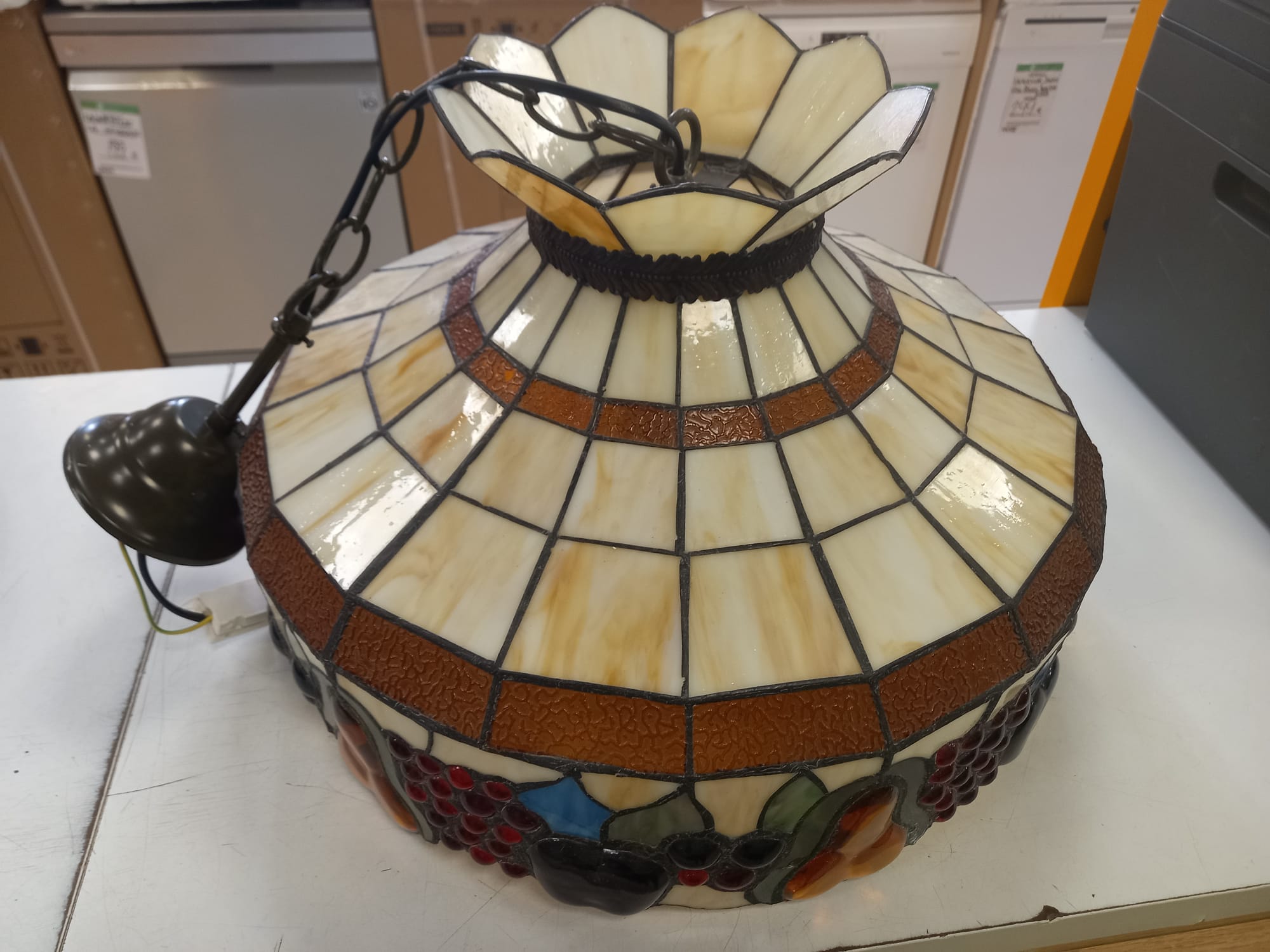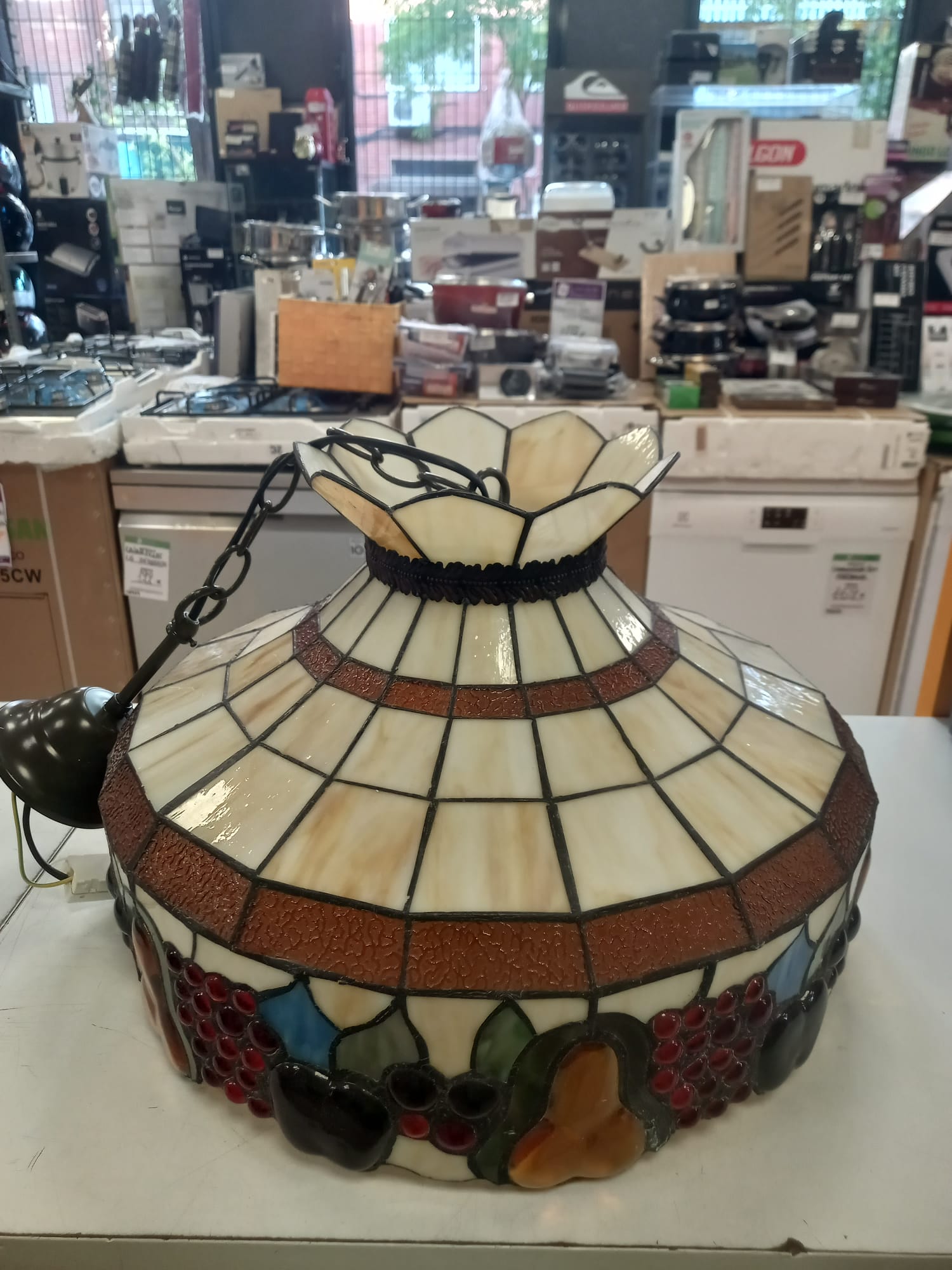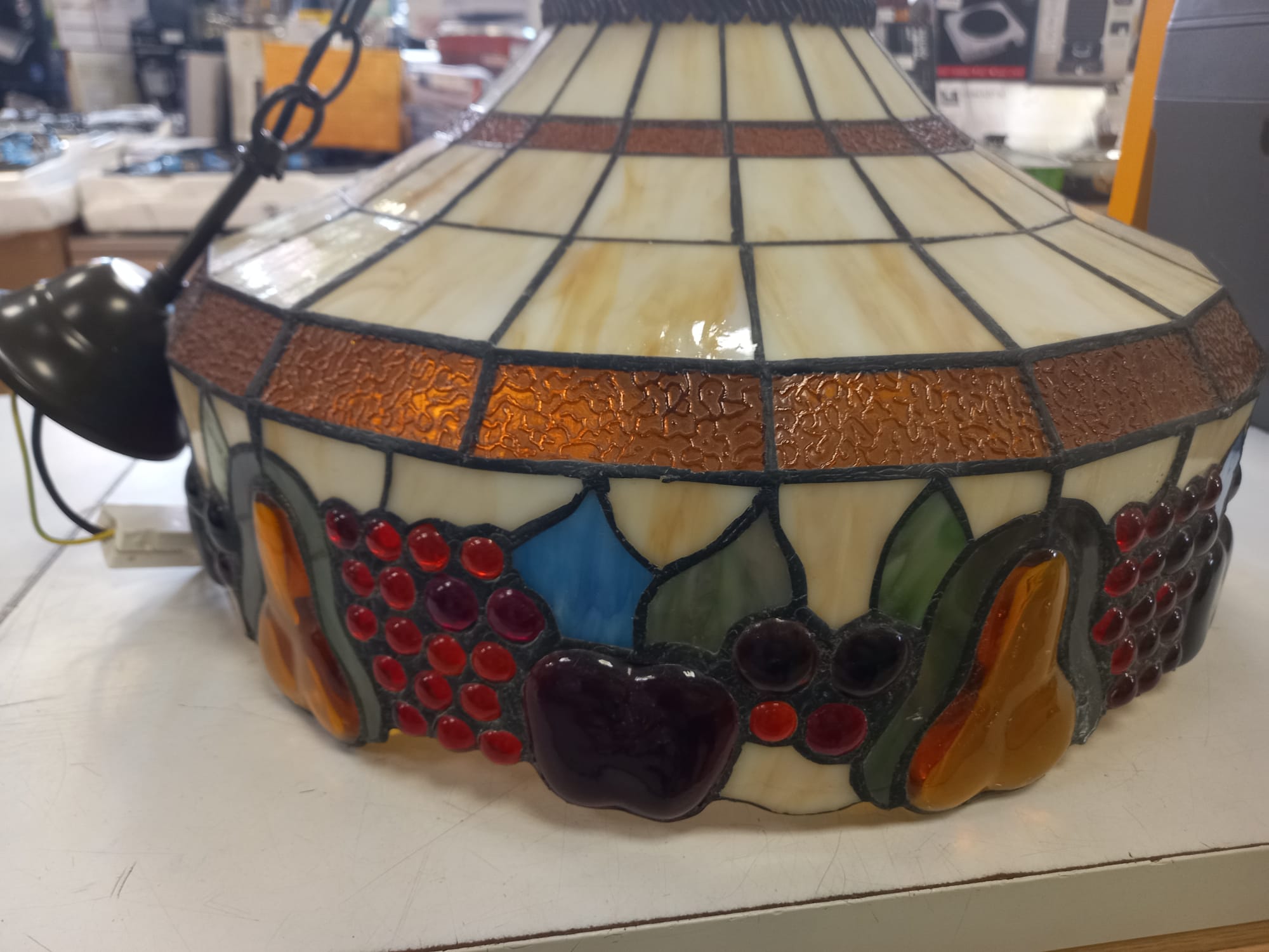 Elegante lámpara de techo con un diseño tipo Tiffany. Su pantalla está elaborada de resina plastica. Diseño con motivos de uvas y hojas. Cadena para colgar incluida. Lámpara Colgante Estilo Tiffany con Pantalla de Cristal Mosaico Frutal. Diámetro de 43cm de lámpara.