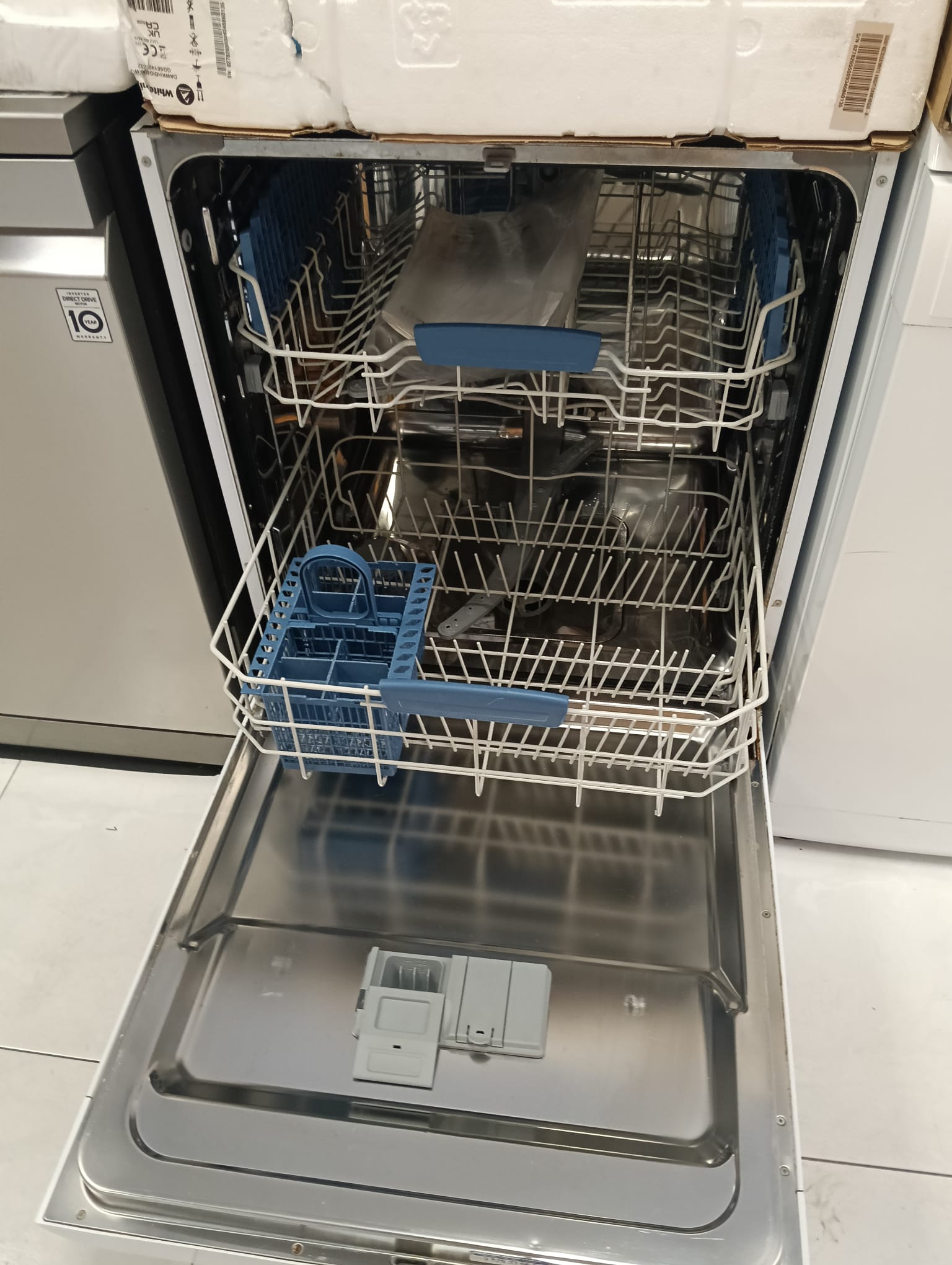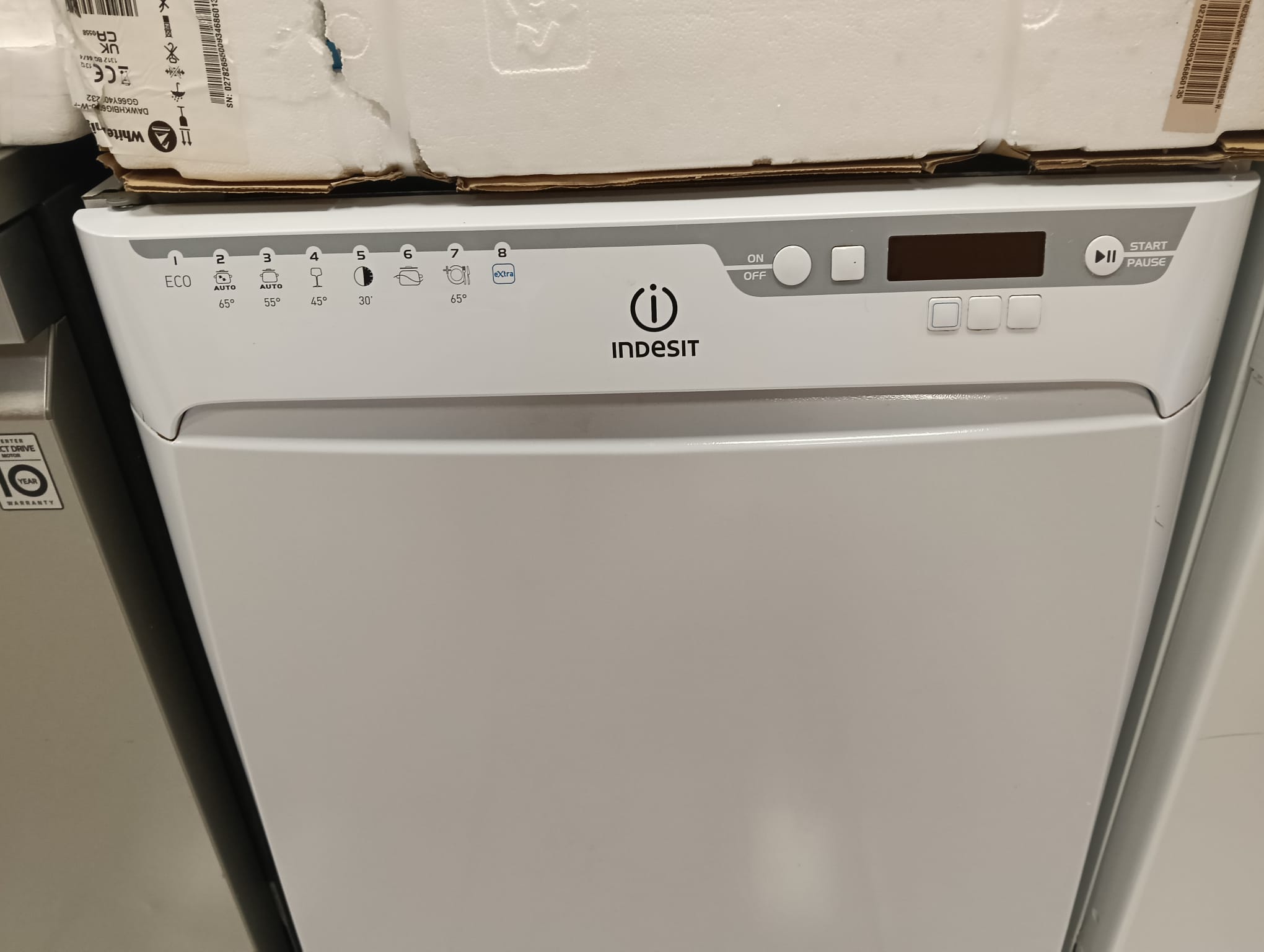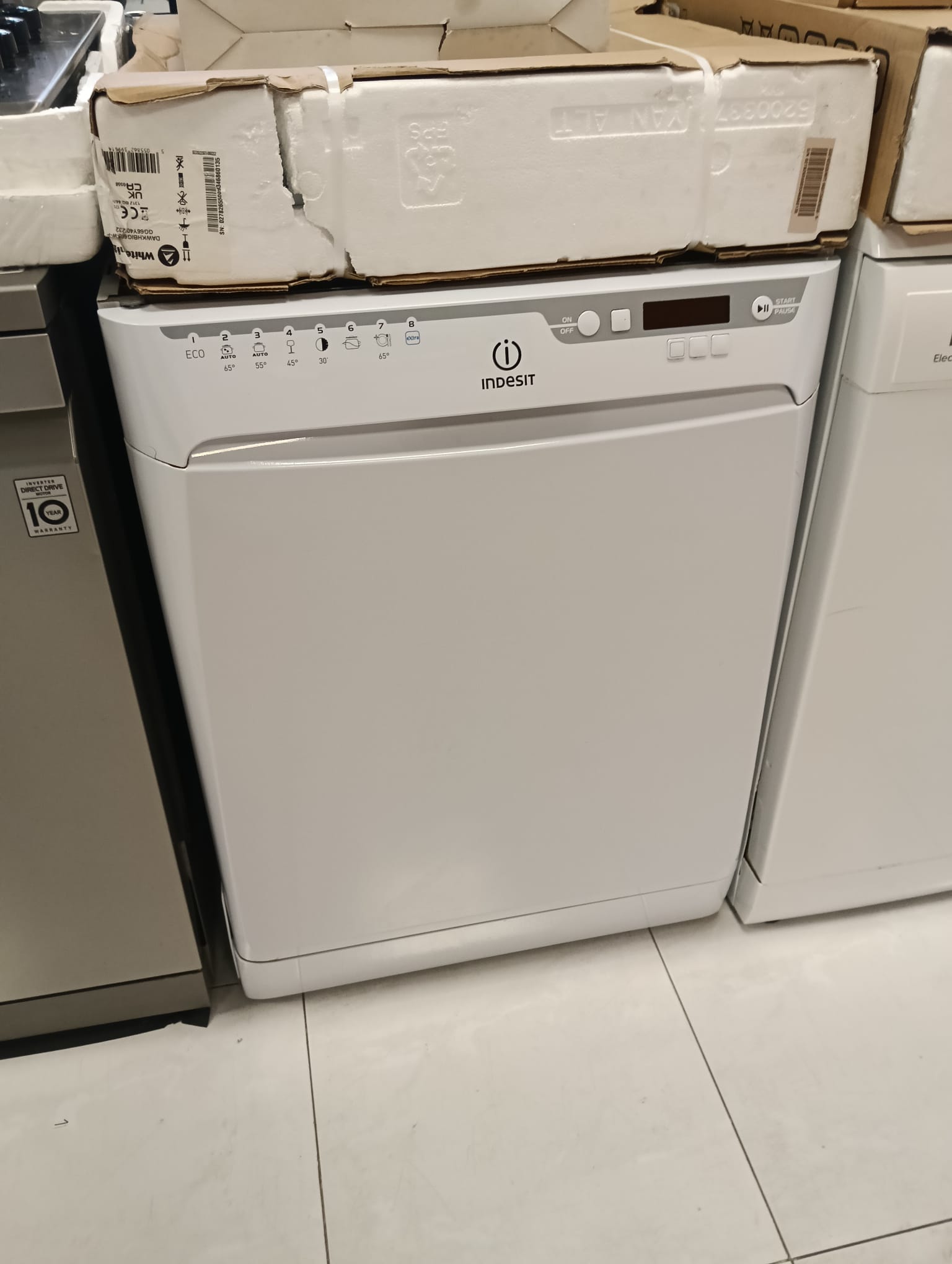 Lavavajillas Indesit de 60cm, modelo DFP 58B1. Color blanco. No tiene tapa superior. Capacidad para 13 servicios. 5 programas de lavado. Clase energética A++. Cesto superior regulable en altura. Indicador de sal y abrillantador.