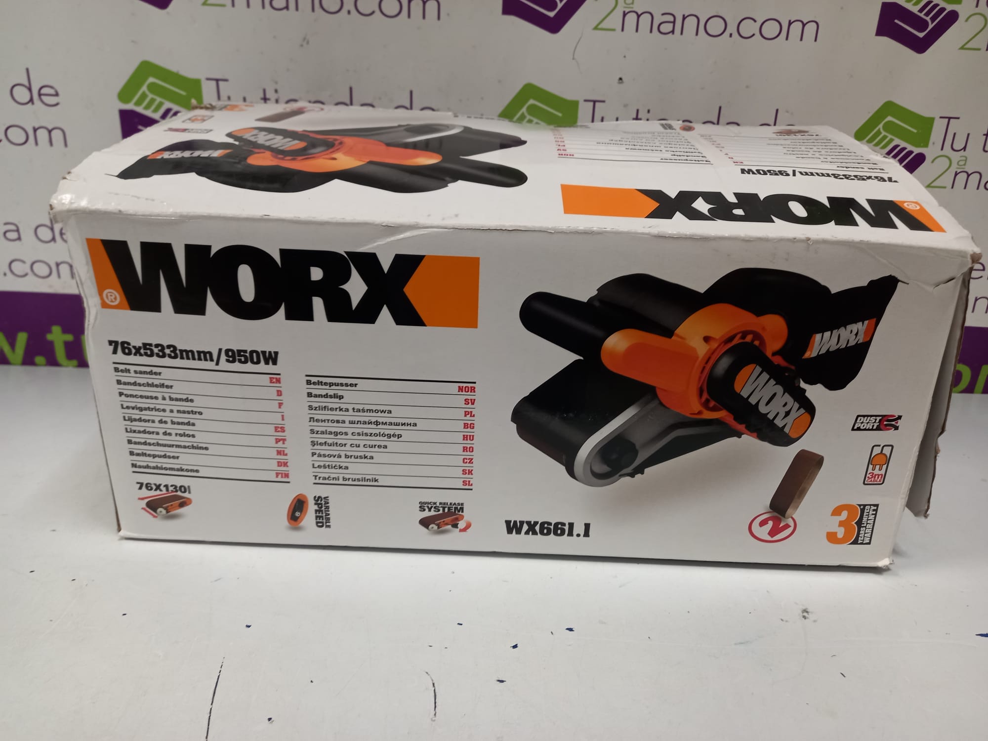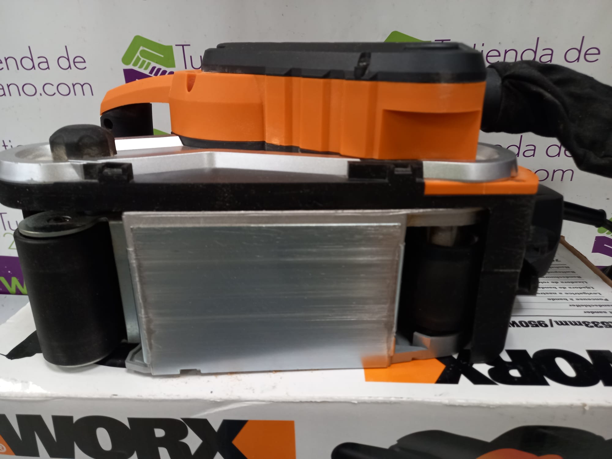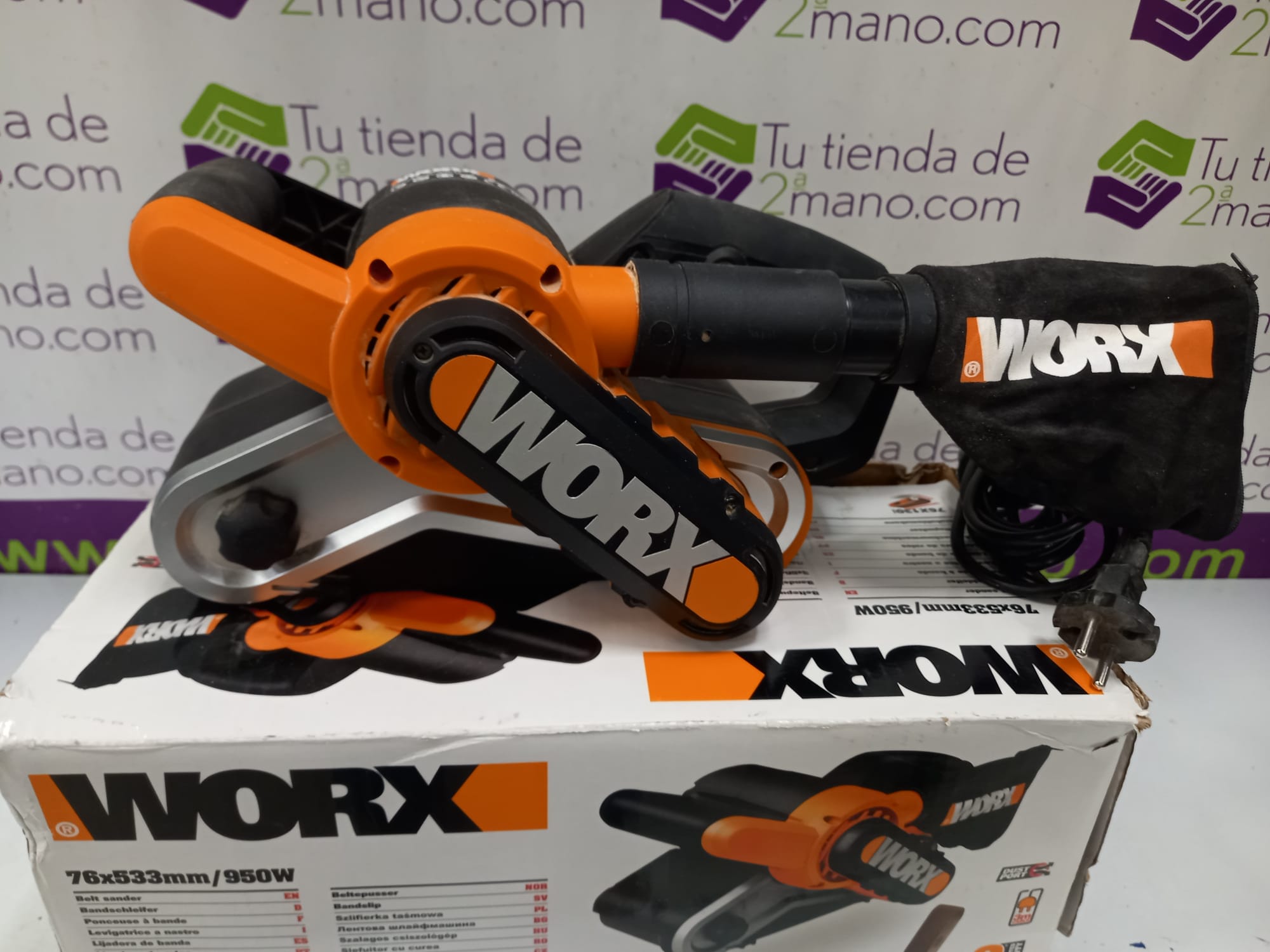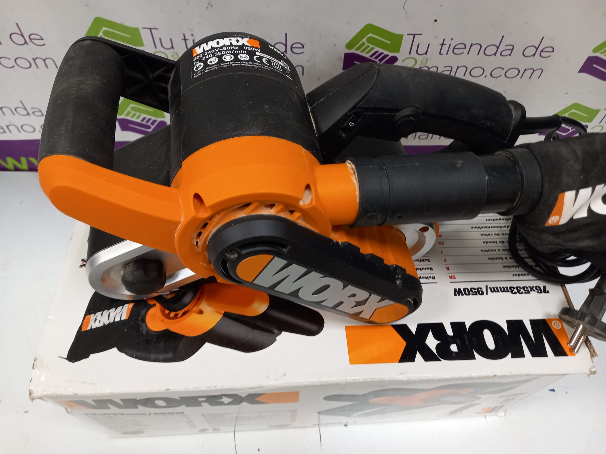 lijadora de banda eléctrica. Rendimiento de 950W y gran superficie de lijado 76 x 130mm con tamaño de banda de hasta 76 x 533mm.