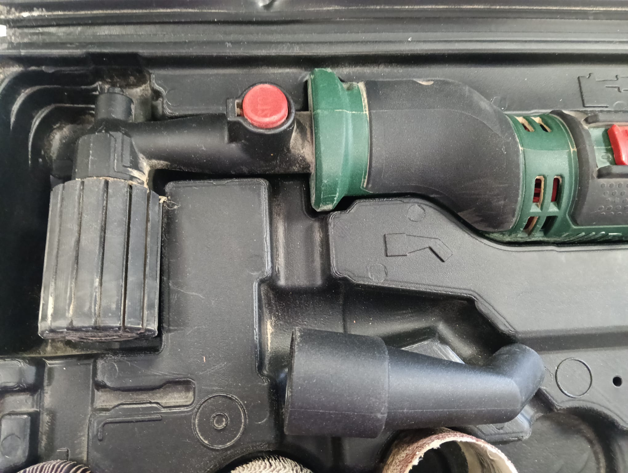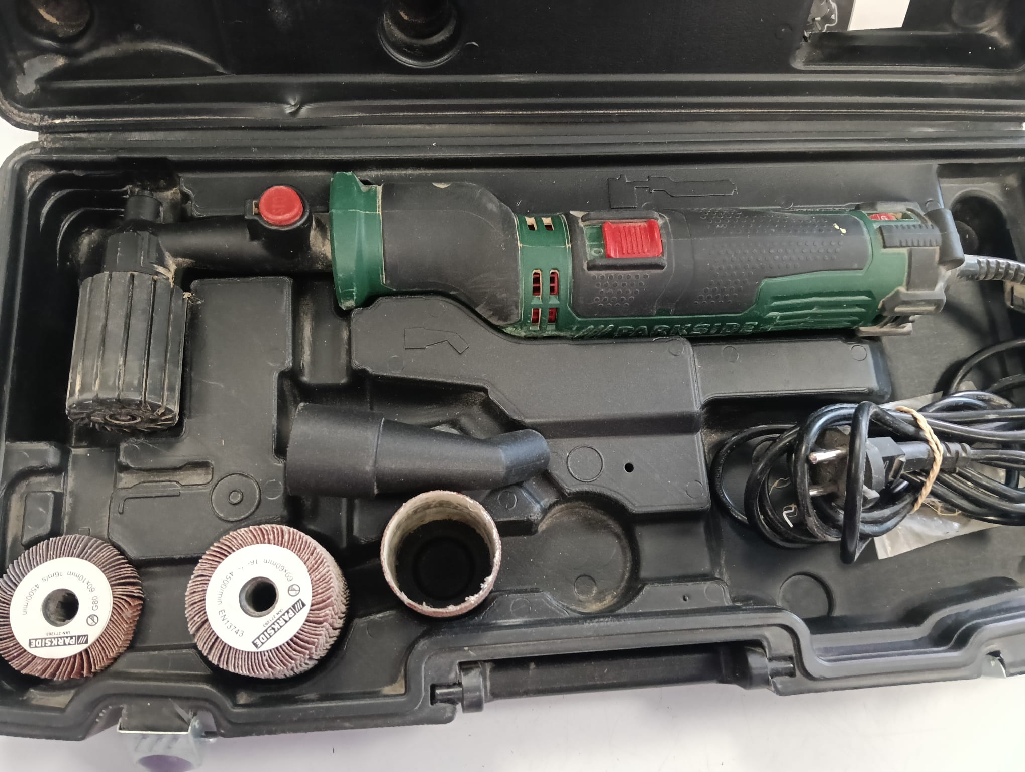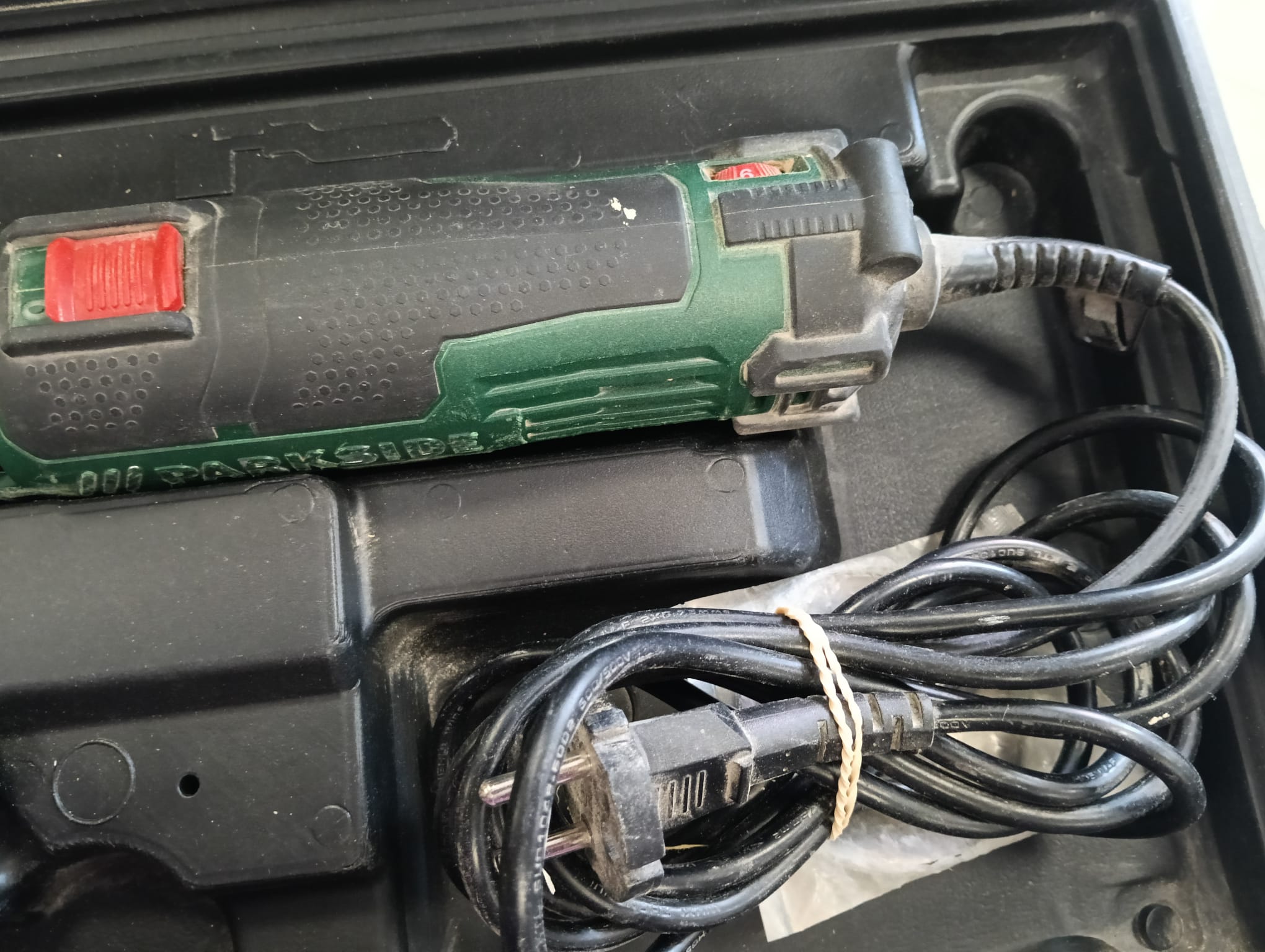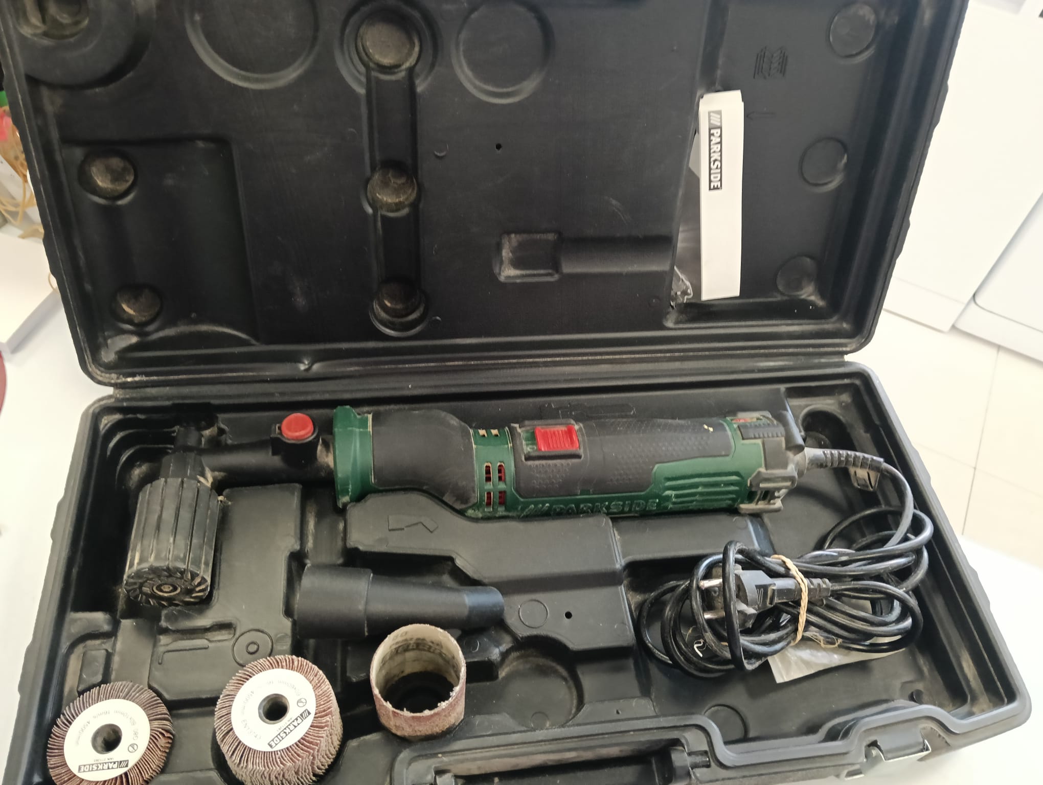 Lijadora de rodillo Parkside PSR 310 A1 en su maletín. Incluye lijadora. Maletín de transporte. Accesorios de lijado.