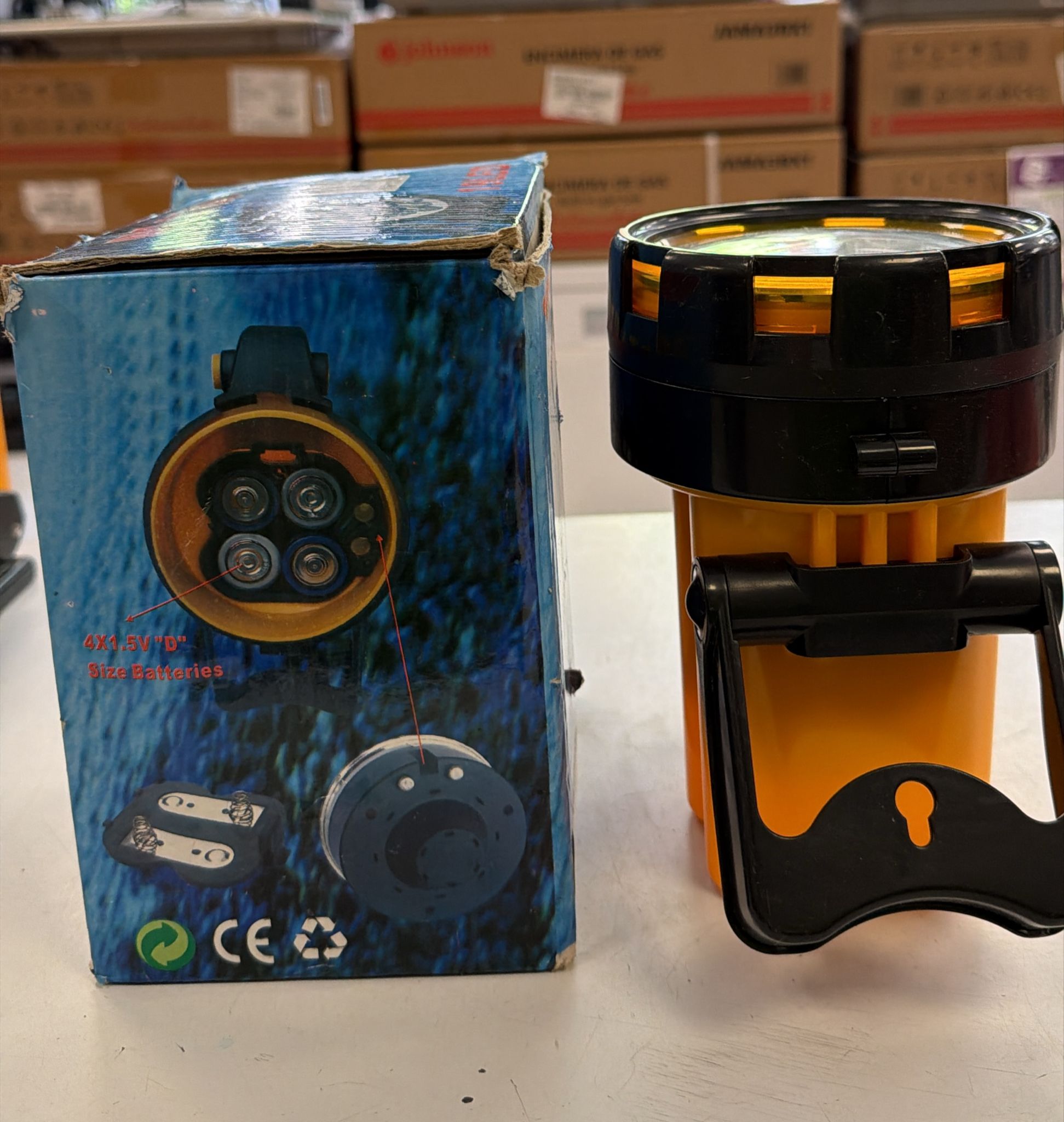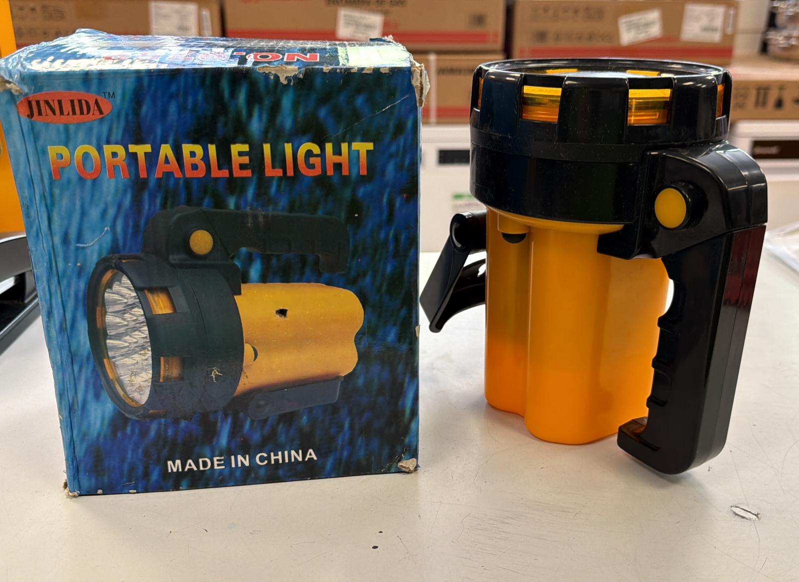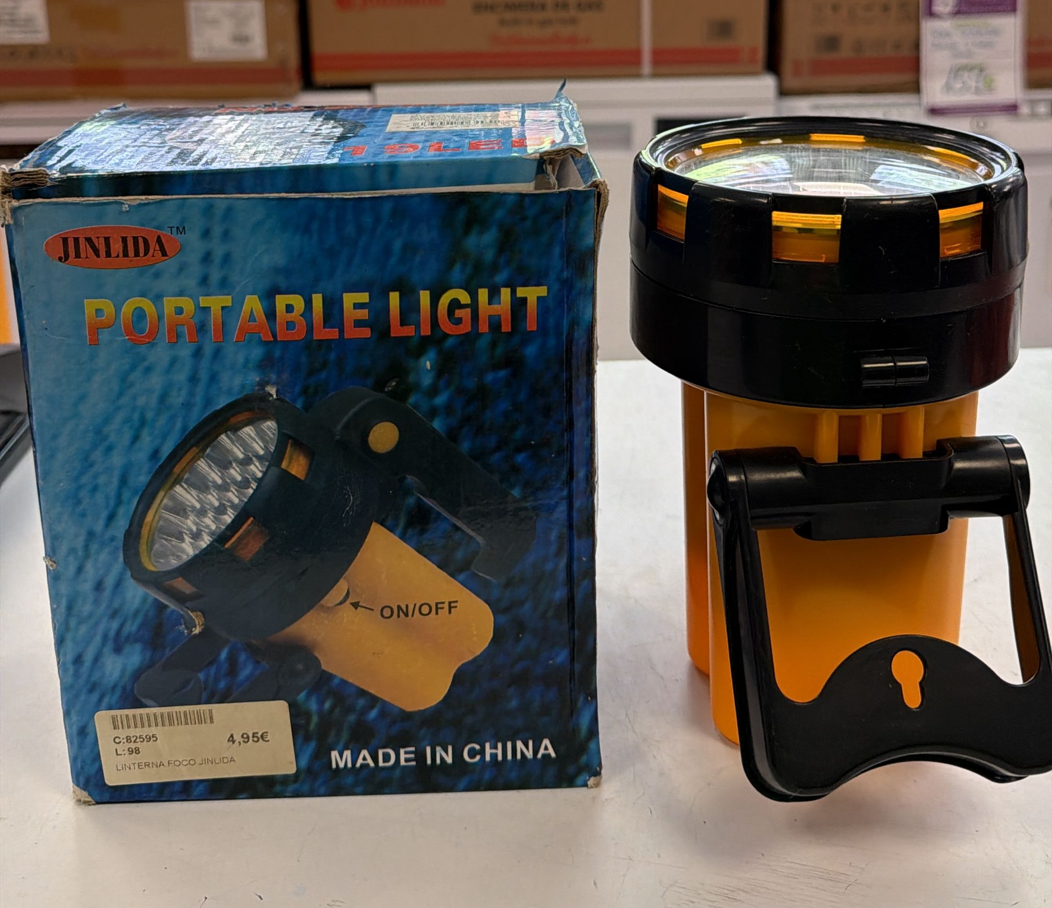 Linterna portátil de la marca Jinlida, ideal para llevar a cualquier parte. Diseño portátil.Color amarillo y negro. Incluye asa para transporte.