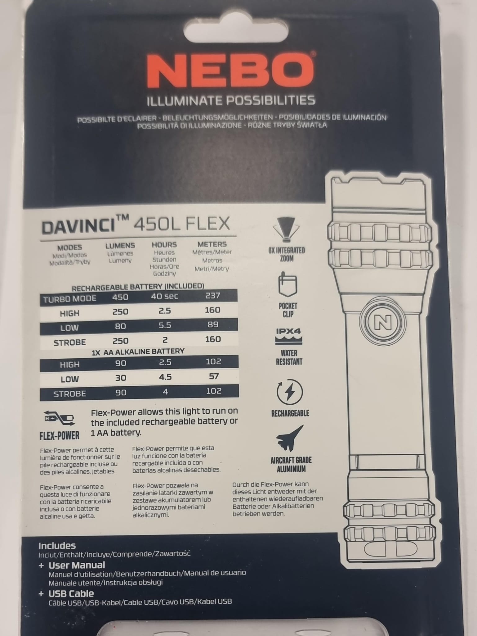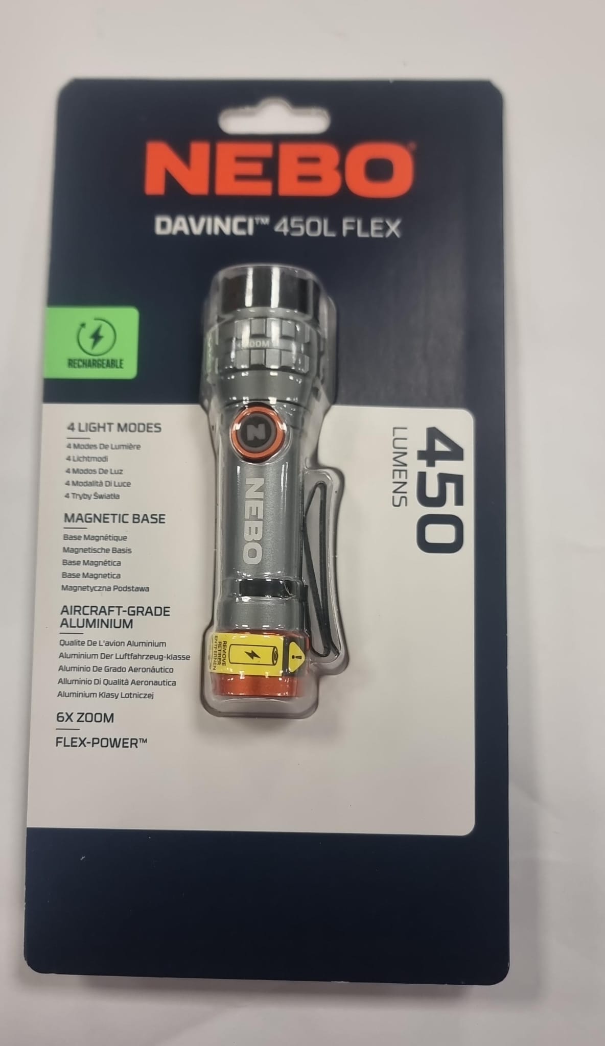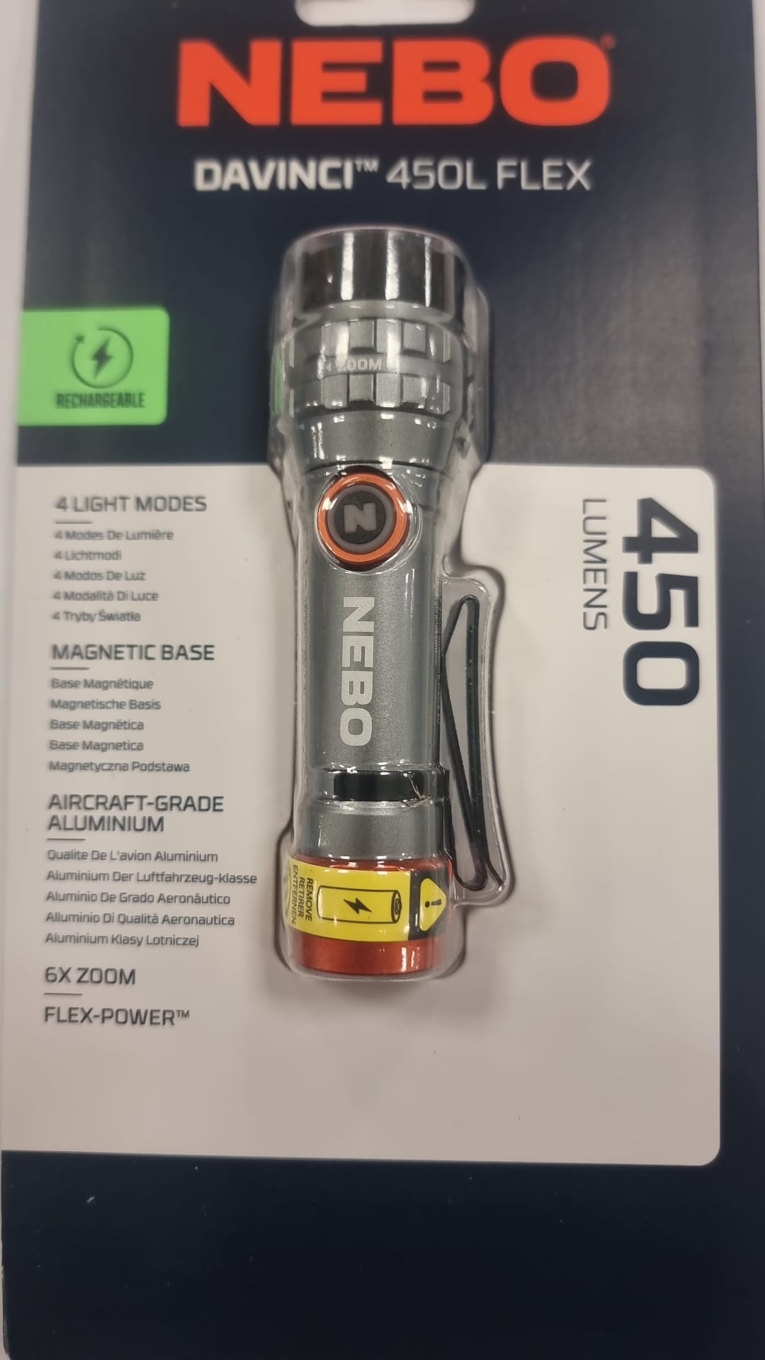 Linterna NEBO DaVinci 450L Flex con 450 lúmenes. 4 modos de luz. Base magnética.Fabricada en aluminio de grado aeronáutico.Zoom 6x.Tecnología Flex-Power?. Recargable.