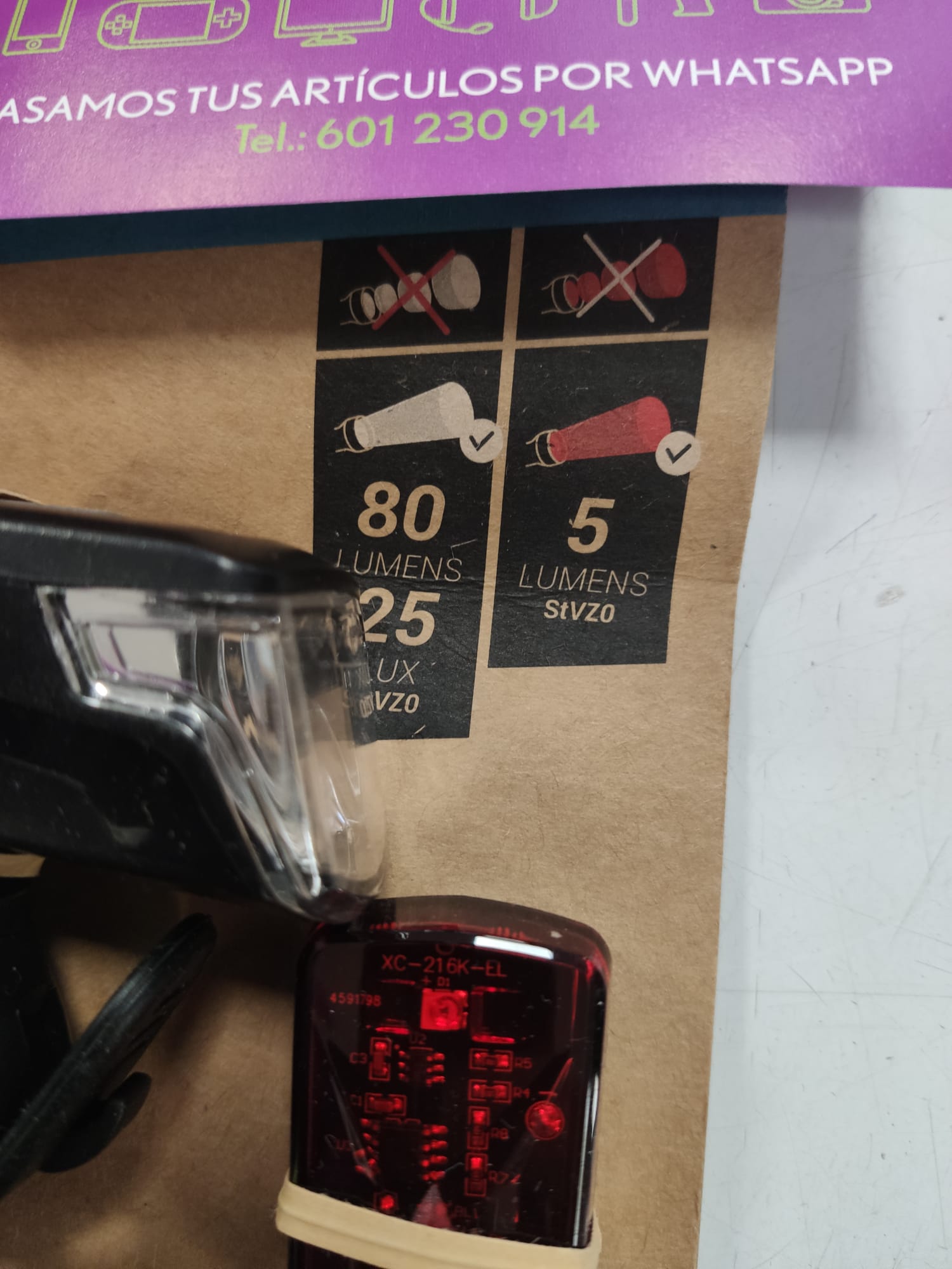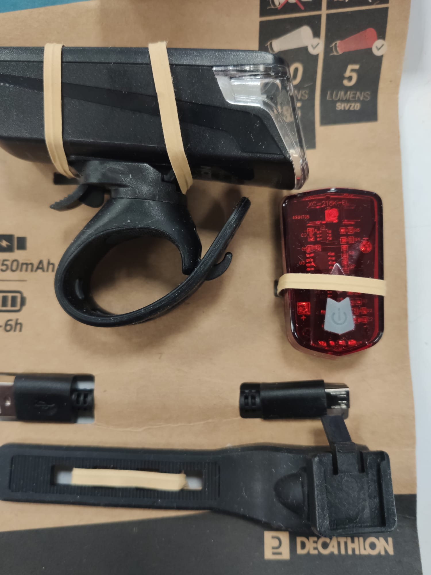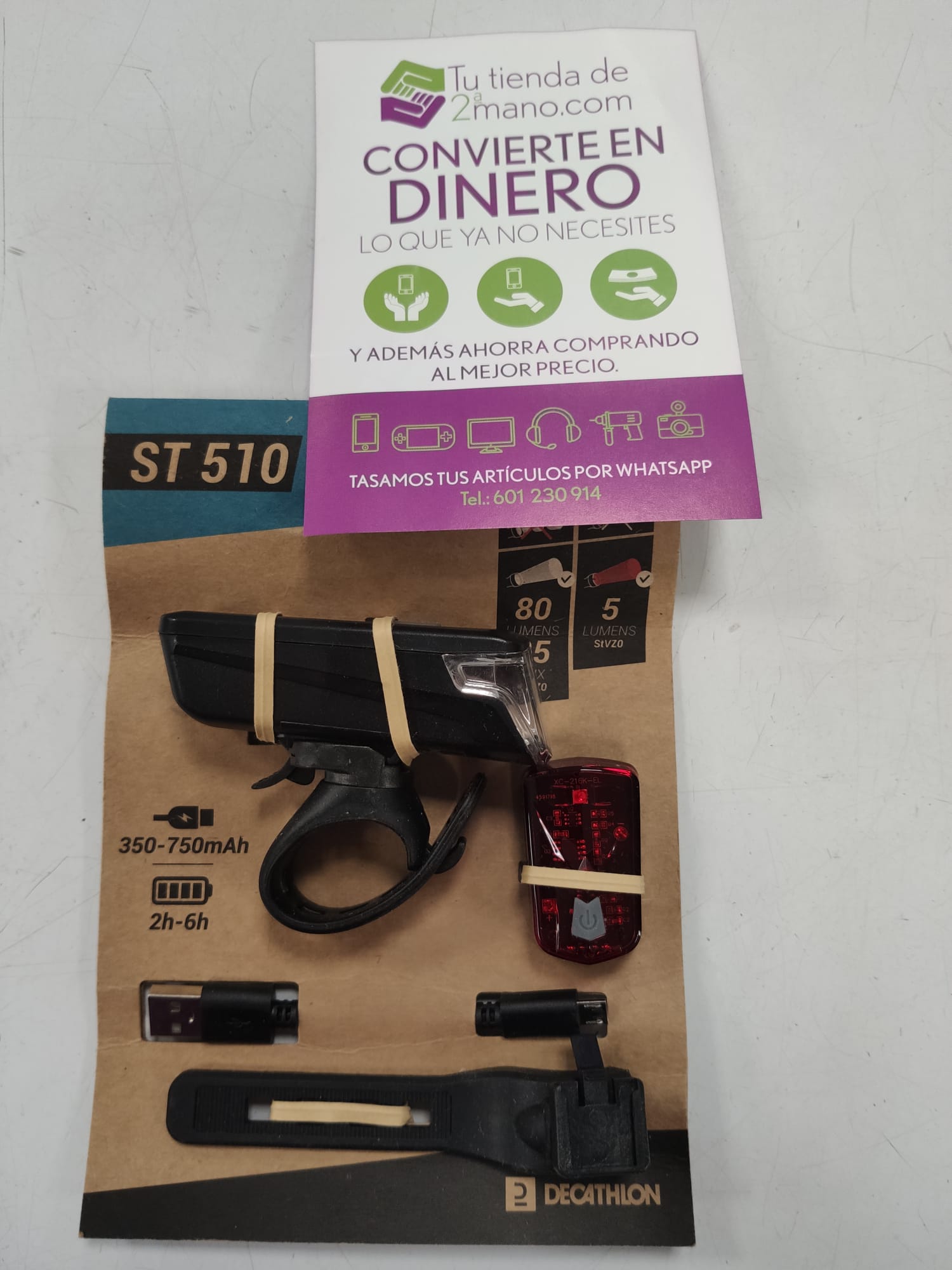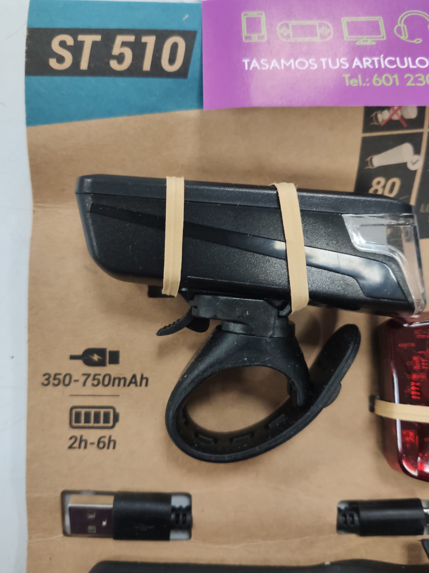 Luces para bicicleta, modelo ST 510. Sin uso. Conjunto de luz delantera y trasera. Carga con USB. Añade agarres para bicicleta en parte delantera y trasera.