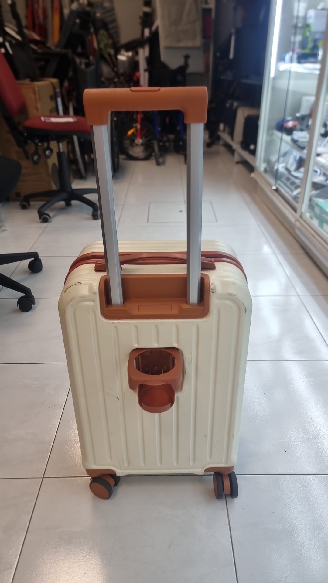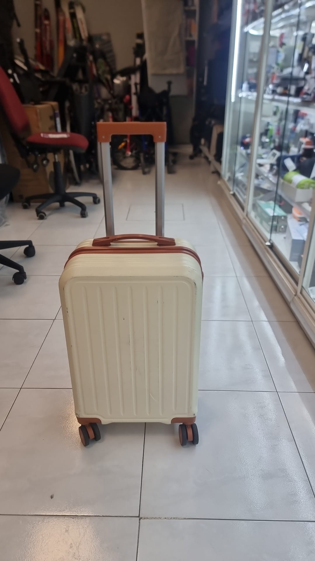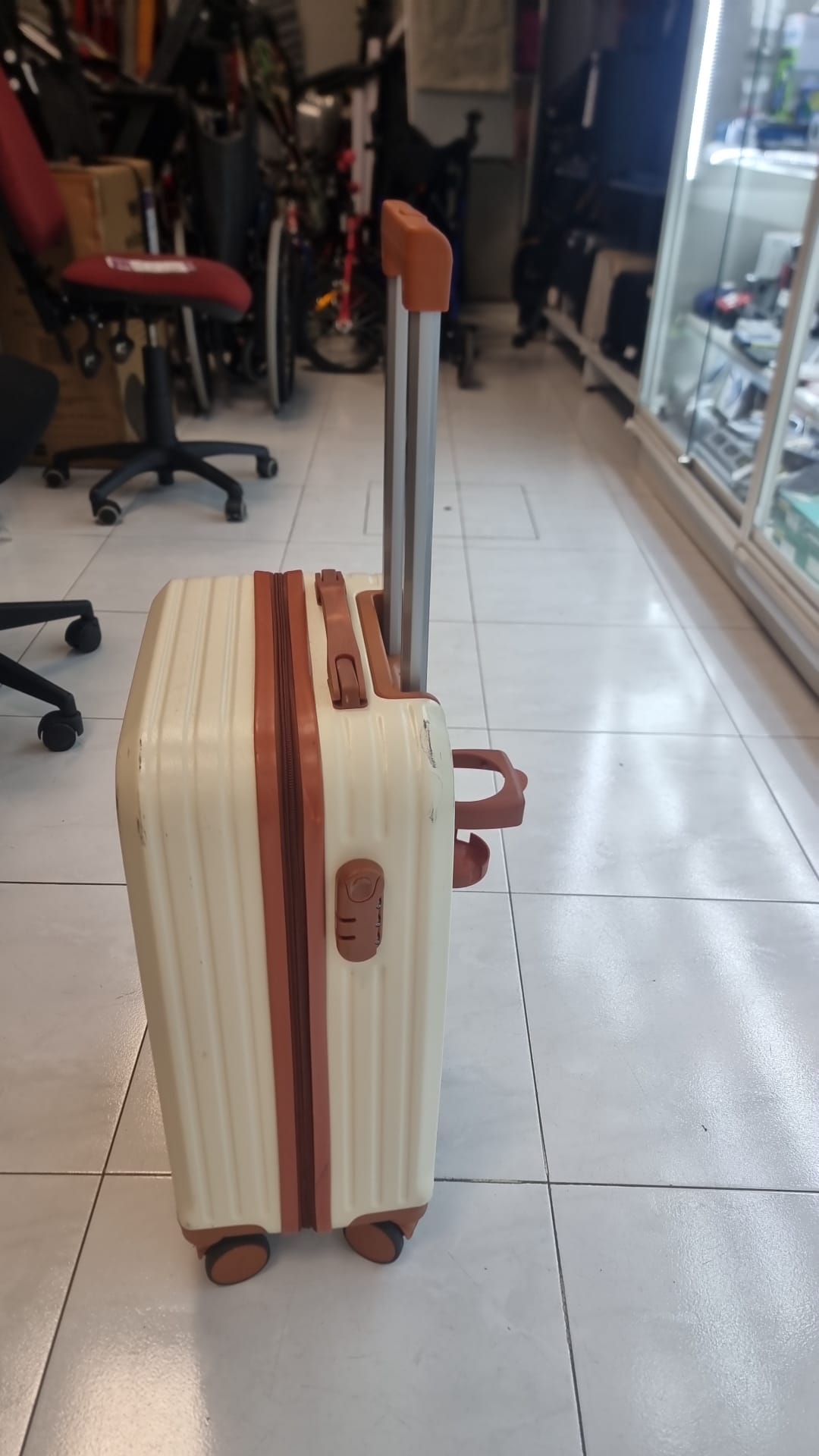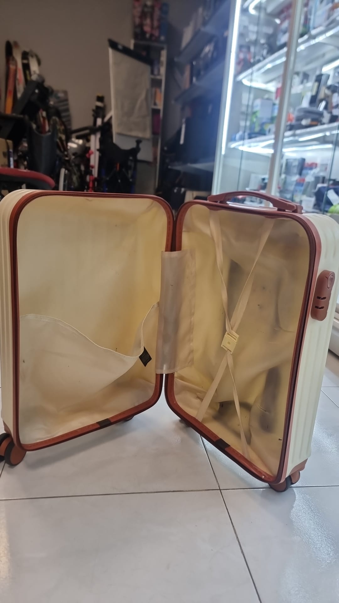 Maleta de cabina con un diseño elegante y práctico.Carcasa rígida ribetes y tirador en color marrón. Ruedas giratorias para facilitar el transporte. Signos visibles de uso. Medidas 57X23X34.