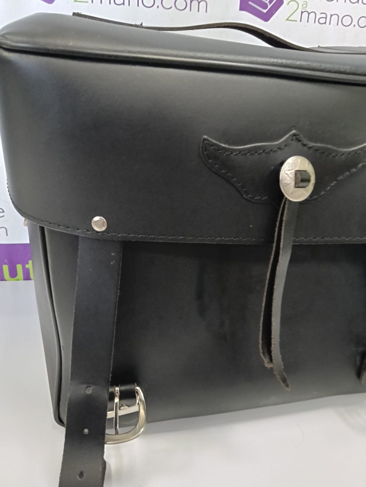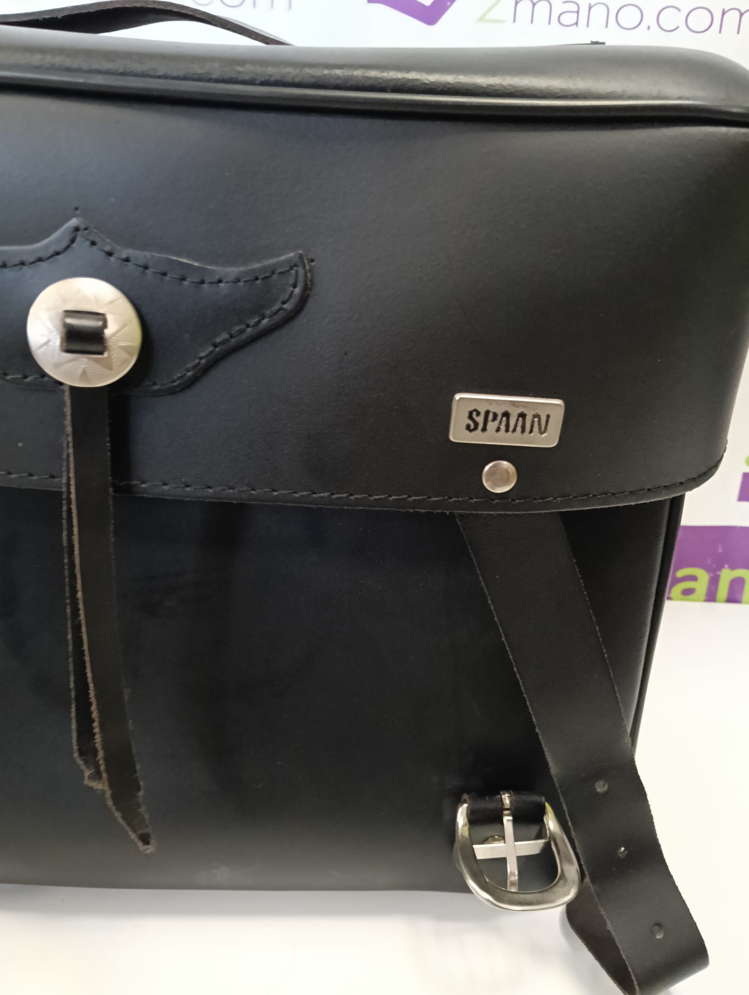 Maleta de respaldo para moto de la marca SPAAN. Fabricada en cuero sintético negro, con un diseño clásico y funcional. Cierre con hebilla decorativa. Correas de sujeción ajustables. Asa superior para transporte. Maleta Respaldo Moto Custom.