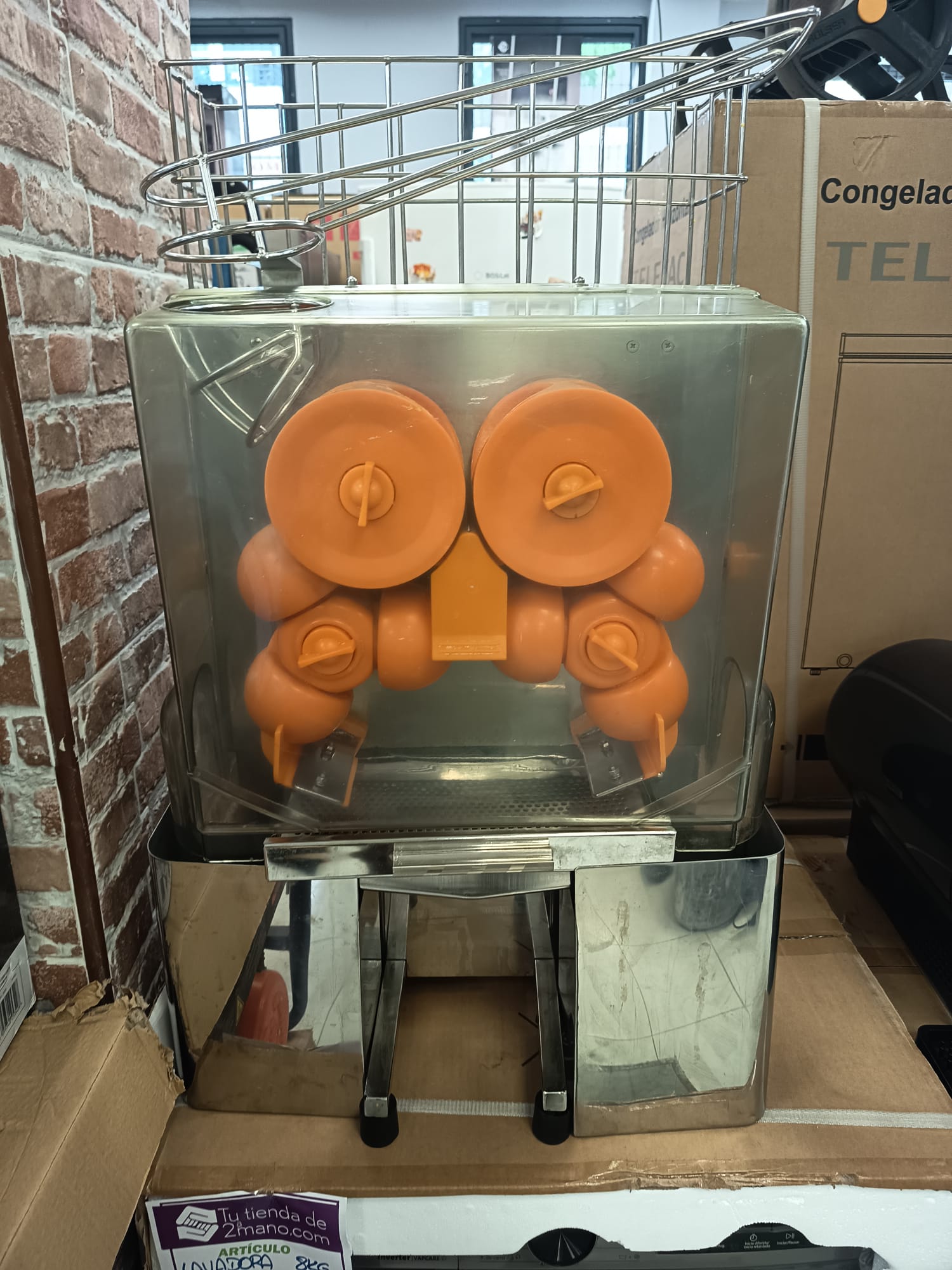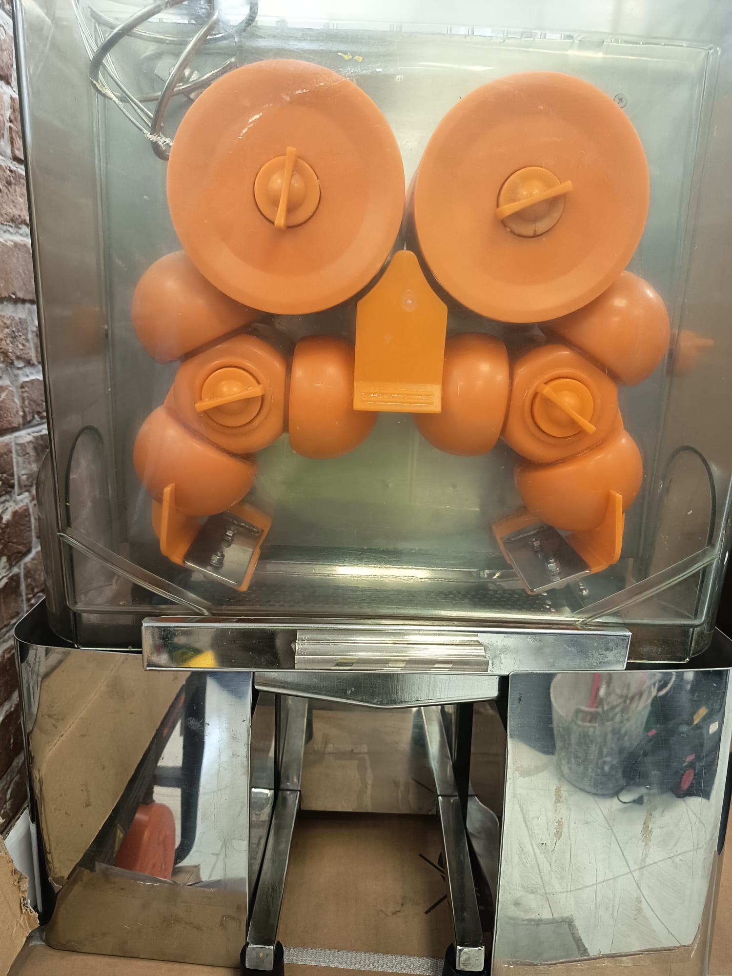 Exprimidor de naranjas Vevor, modelo XC2000E-2X. Máquina automática de hosteleria de acero inoxidable. Potencia de 12w. Exprimidor electrico de naranjas. Peso de 44 kg. Medidas de 50cm ancho x 30cm fondo x 80cm alto.
