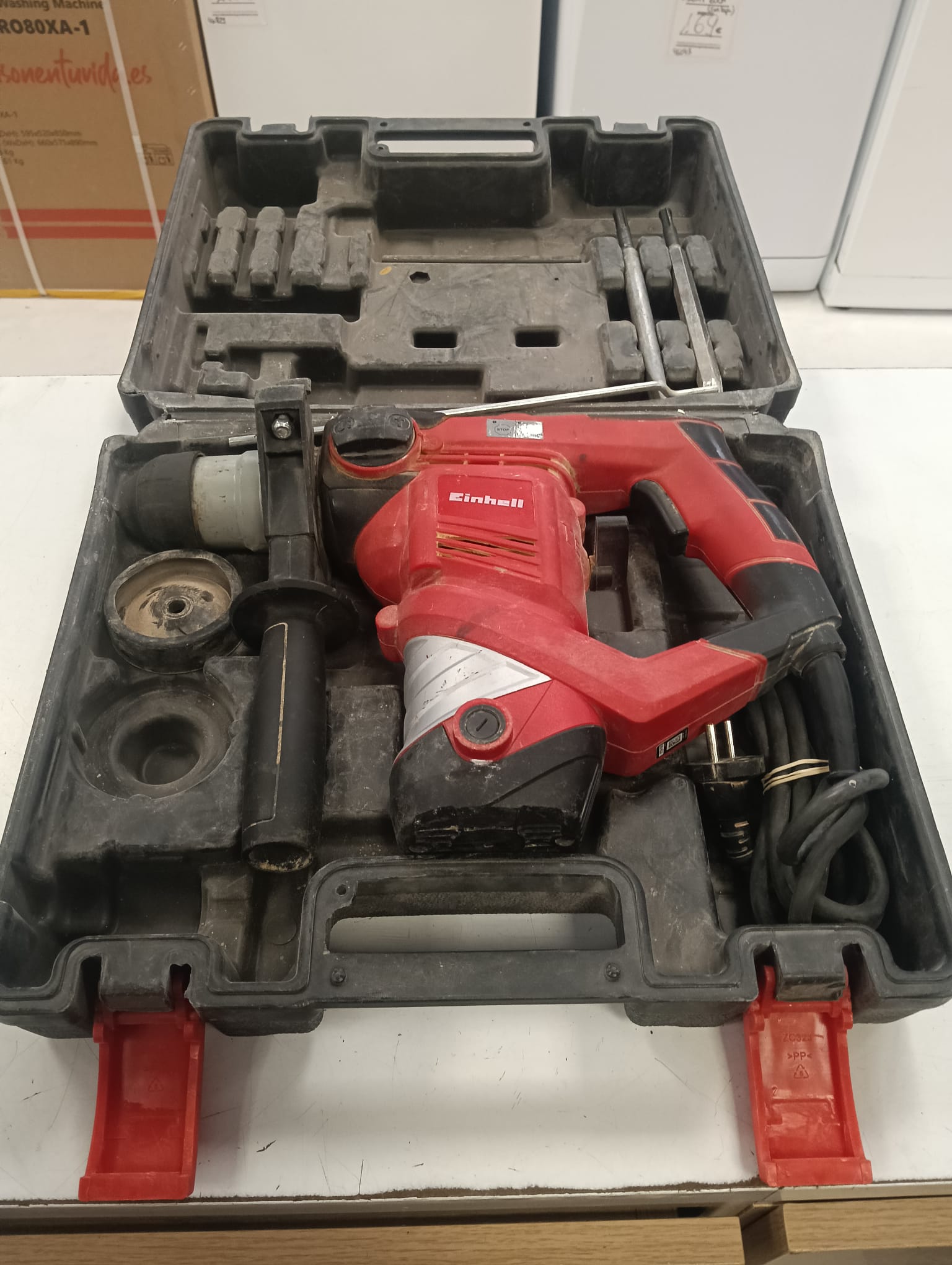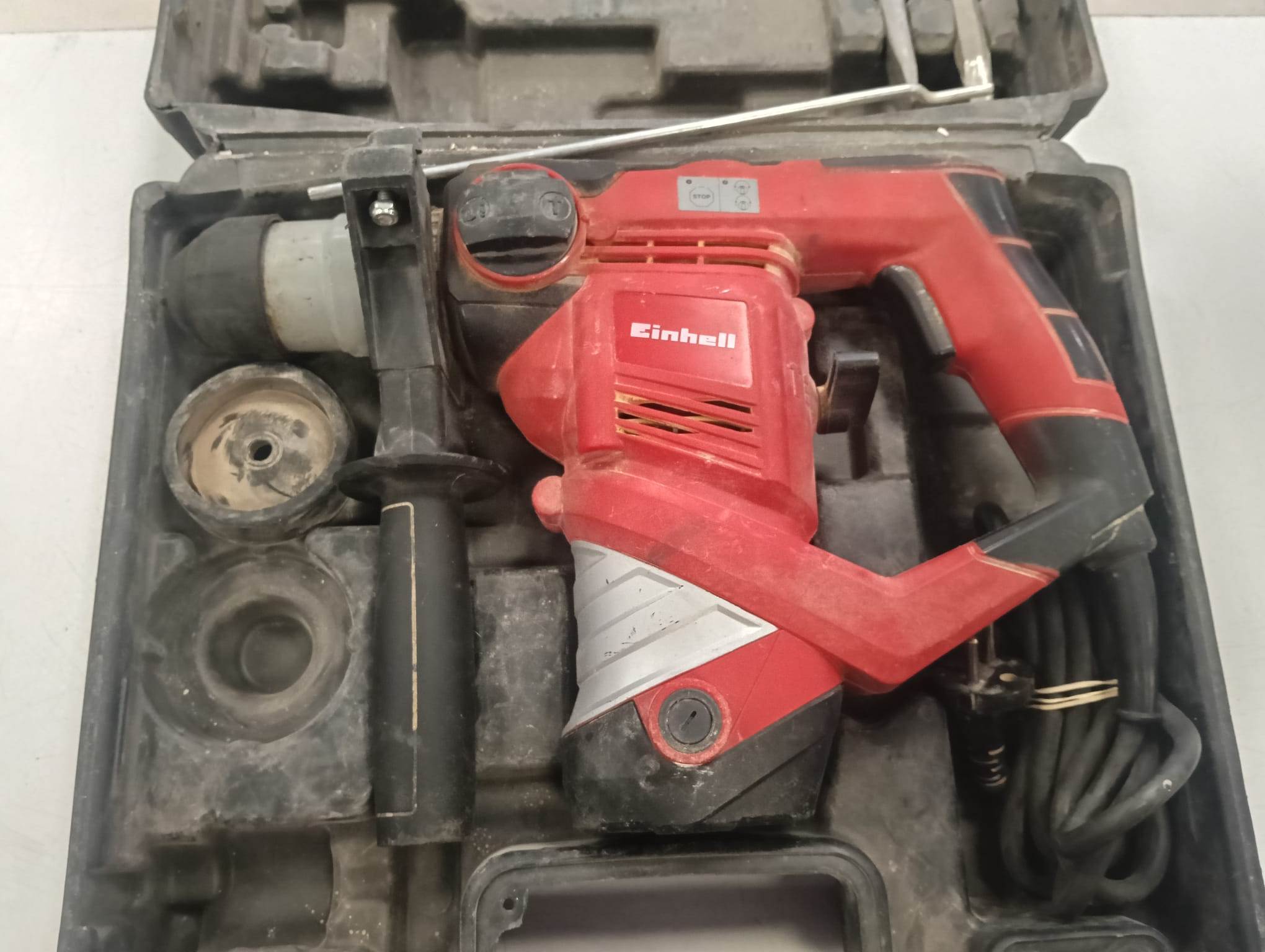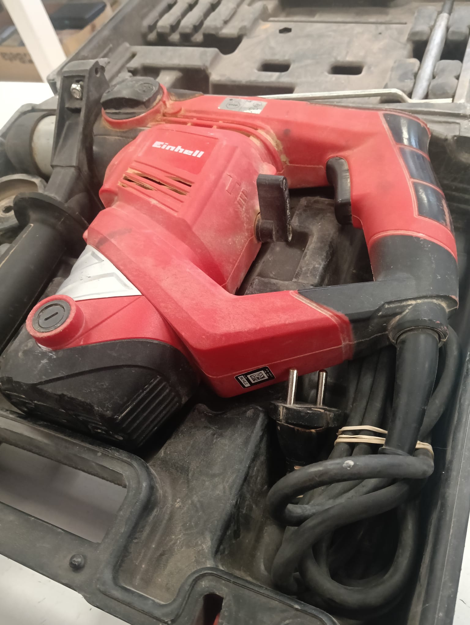 Martillo perforador Einhell TC-RH900 en su maletín.Incluye maletín de transporte. Mango auxiliar.Tope de profundidad. tres funciones integradas de taladrado, taladrado con percusión y cincelado con fijación, el potente ayudante tiene una potencia de 900 vatios y una tasa de impacto de hasta 4.000 golpes por minuto.