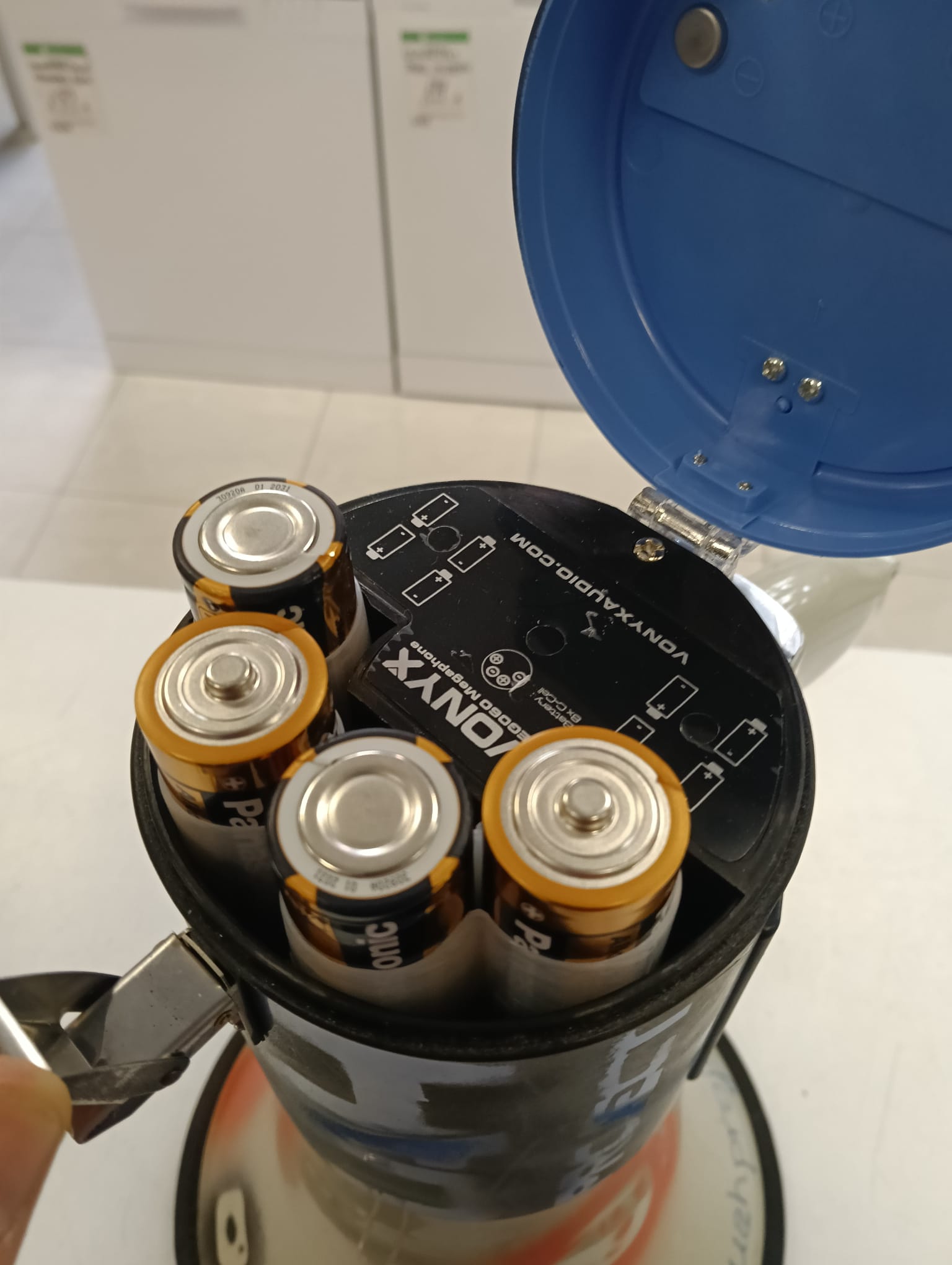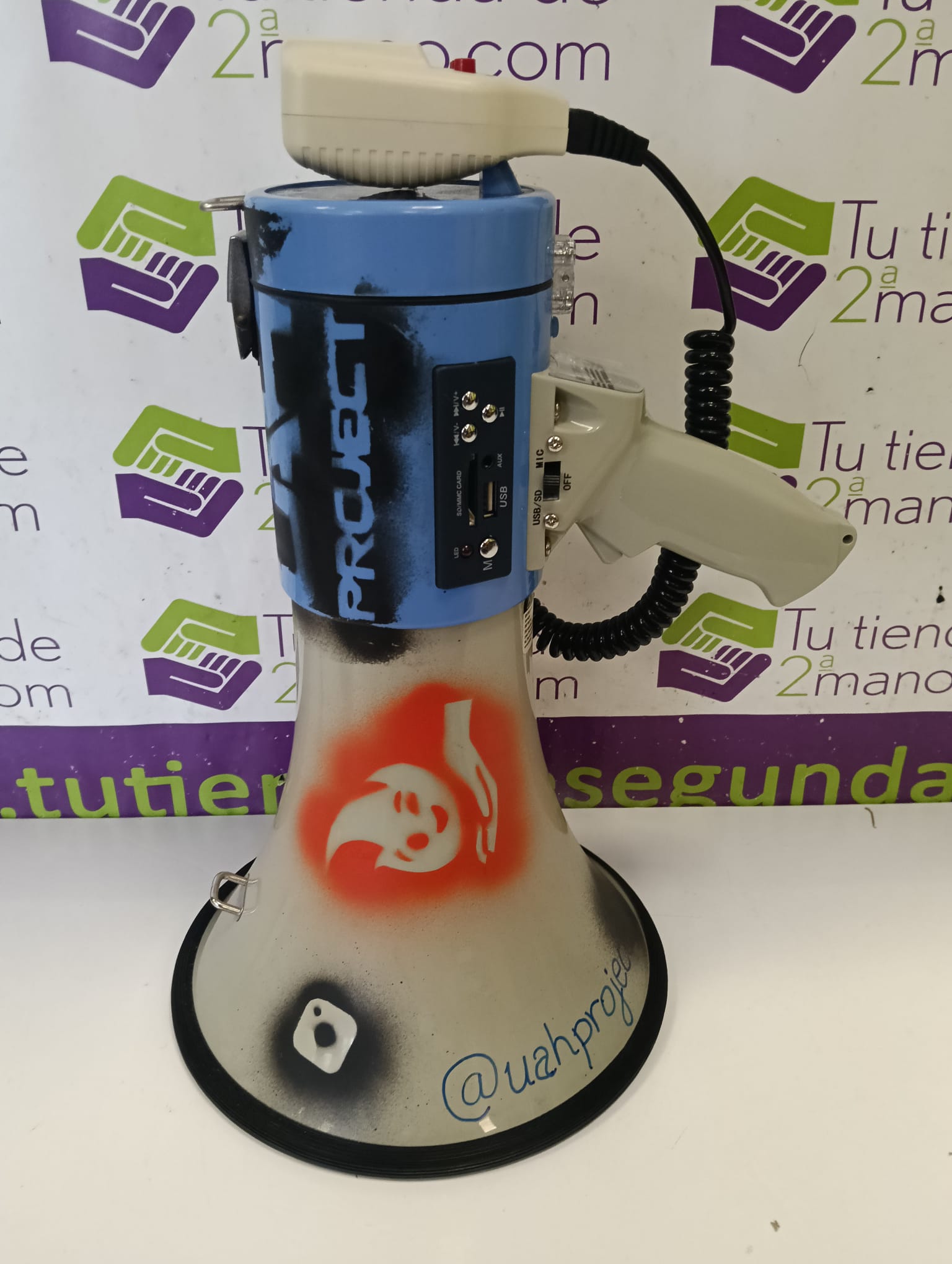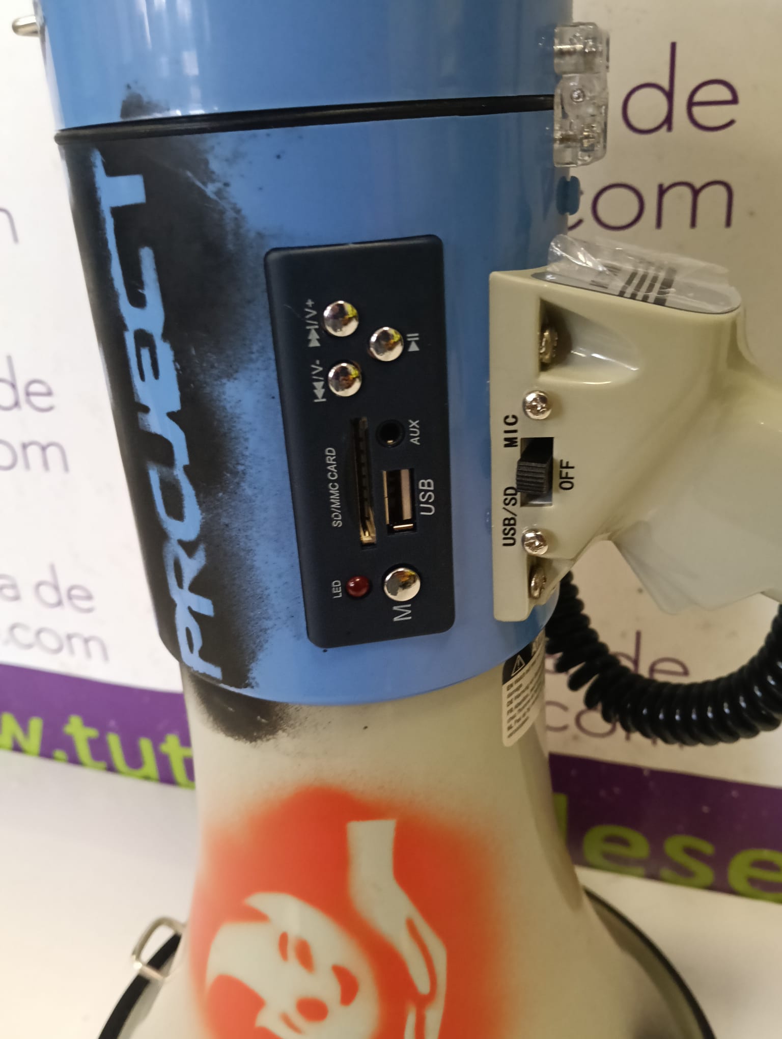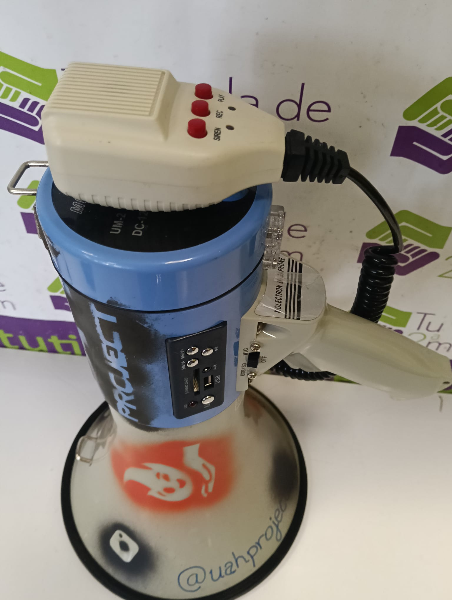 Megáfono con diseño moderno y funcionalidades adicionales. Ideal para eventos o comunicaciones.Puerto USB para reproducción de audio.Ranura para tarjeta SD.Asa ergonómica para un agarre cómodo. Diseño en color azul y gris con detalles gráficos.