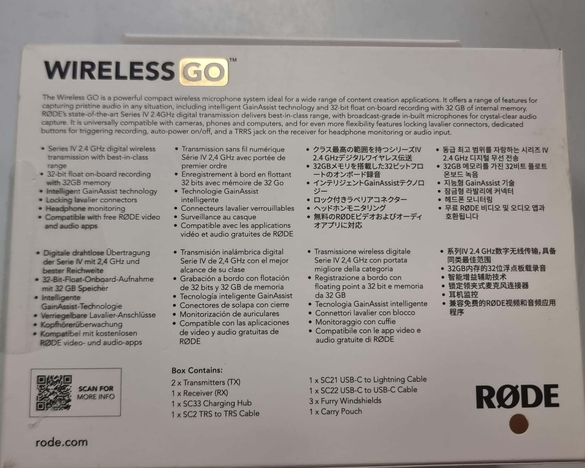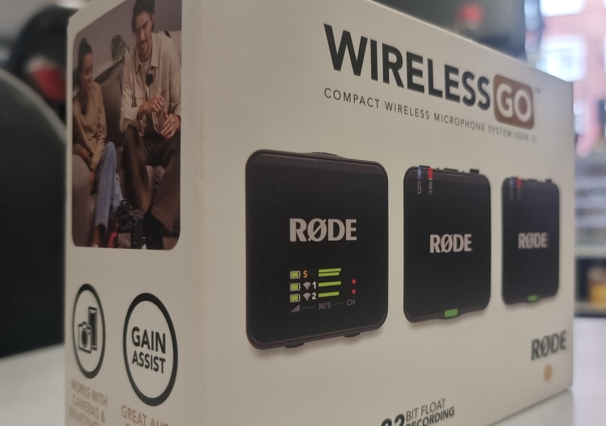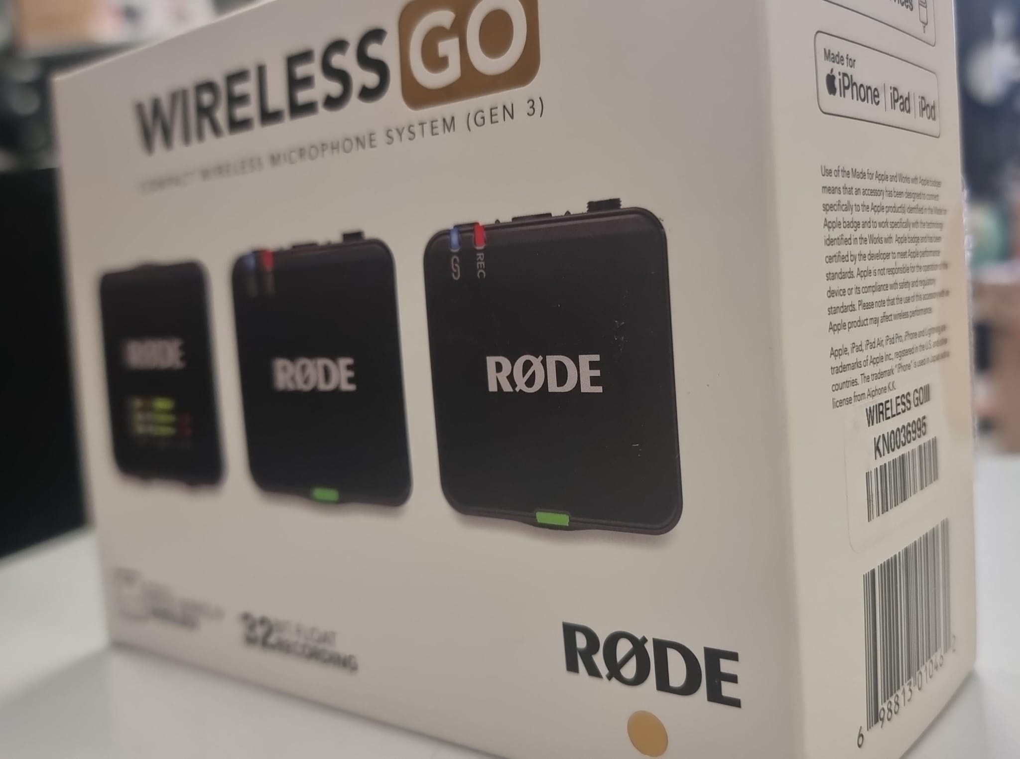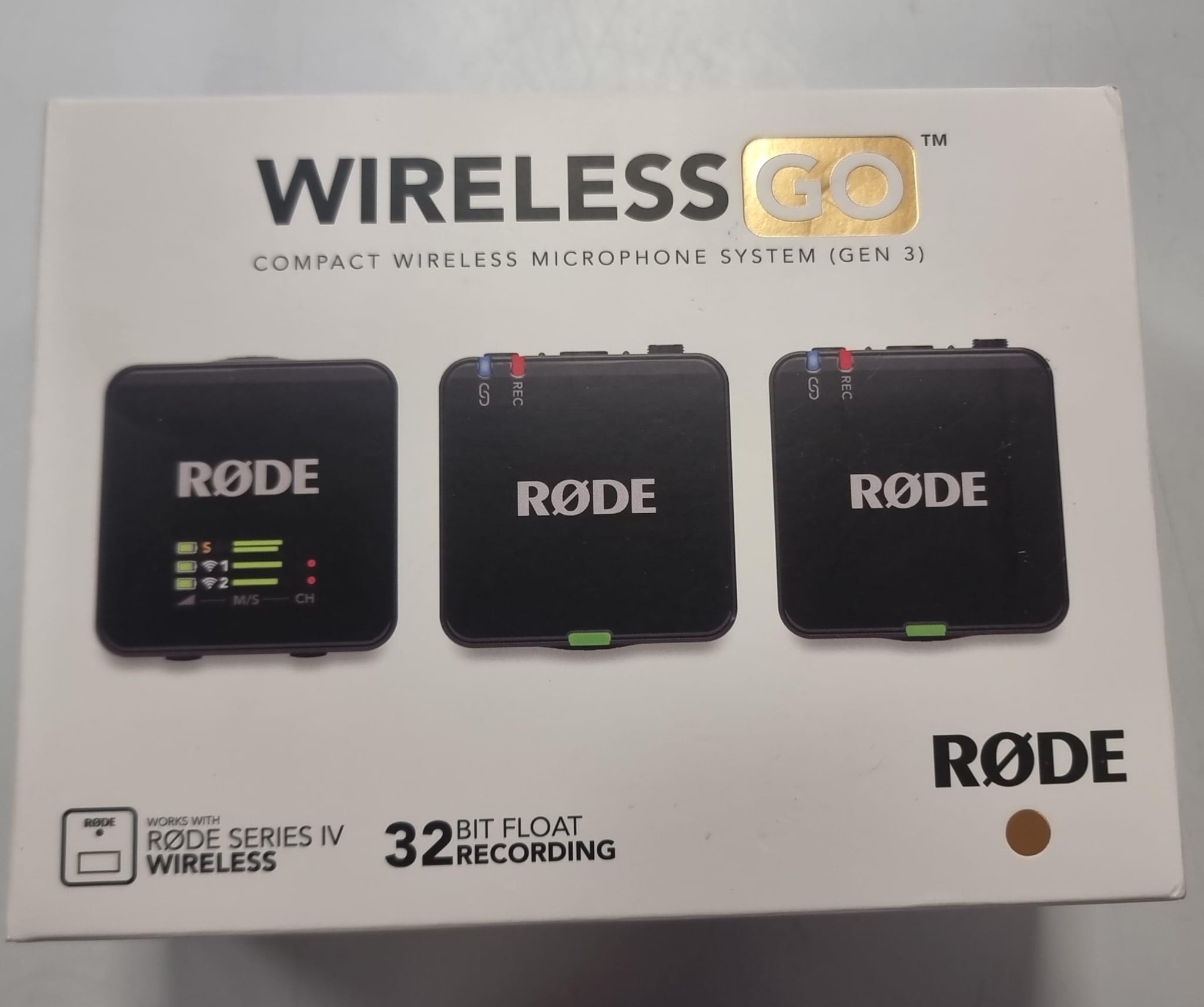Sistema de micrófono inalámbrico compacto Rode Wireless GO de tercera generación. Incluye transmisor y receptor. Tecnología de 32 bits float recording.