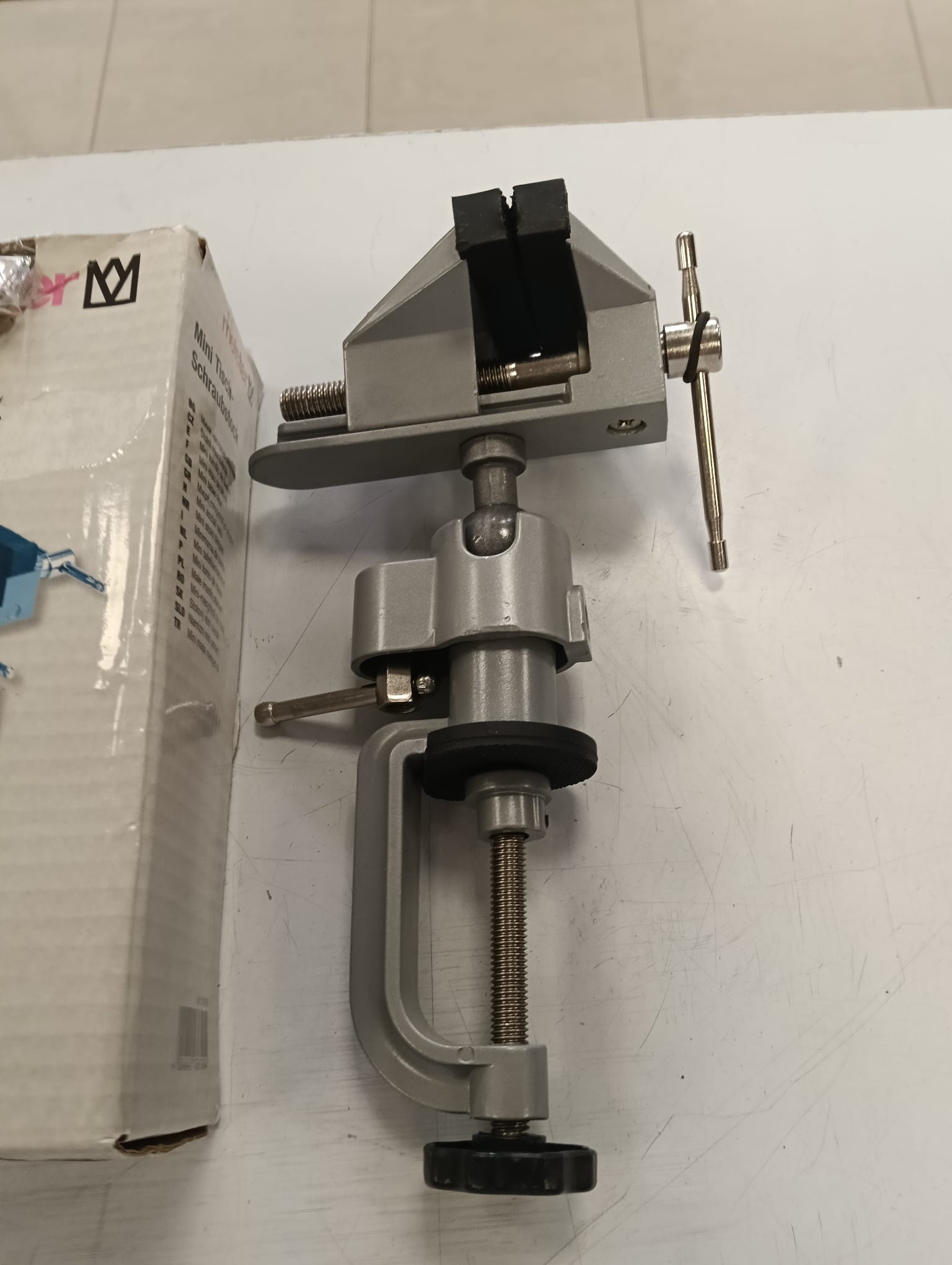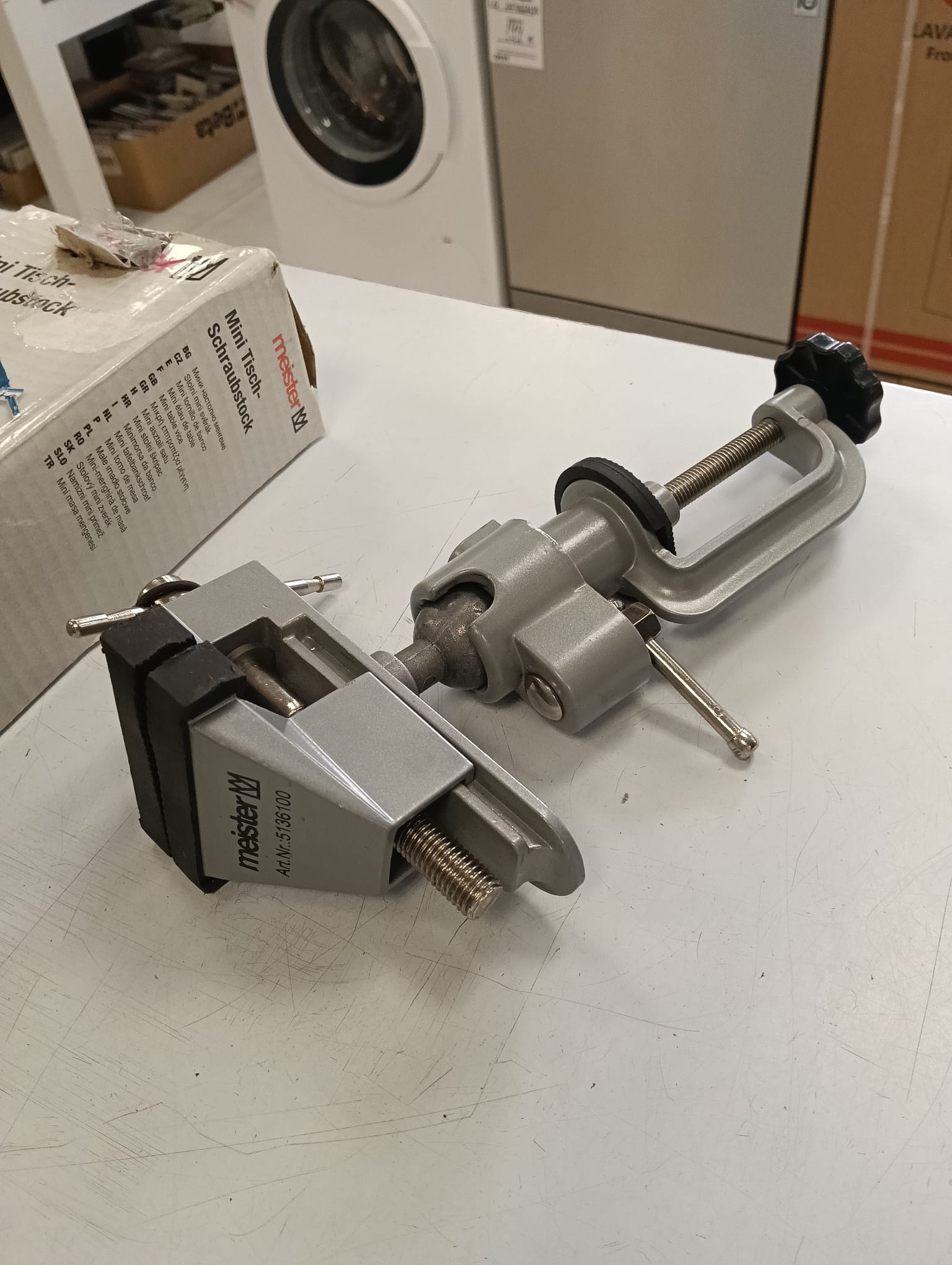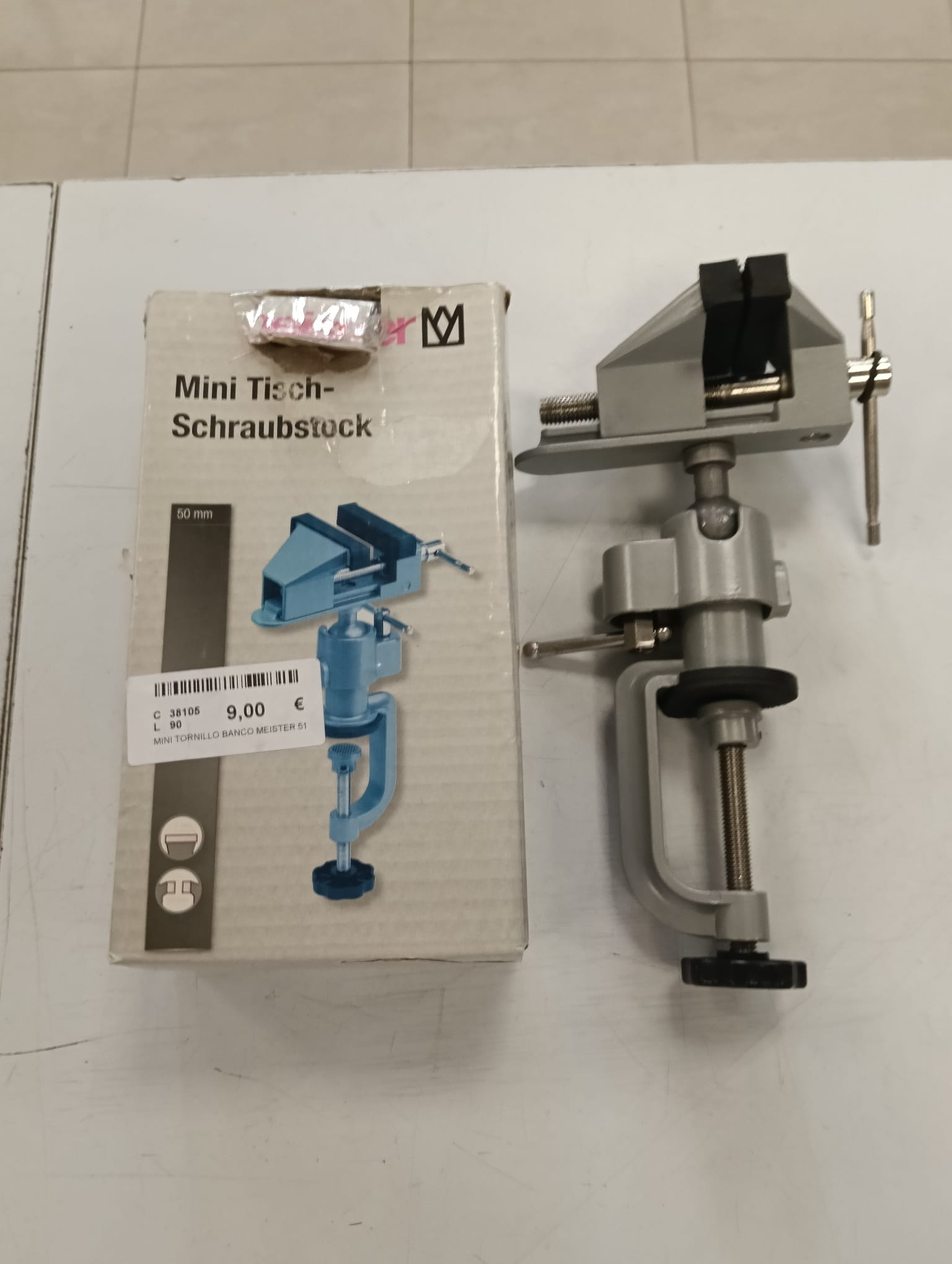 Mini tornillo de banco de la marca Meister, modelo 51. Color gris y azul. Apertura de 50 mm.