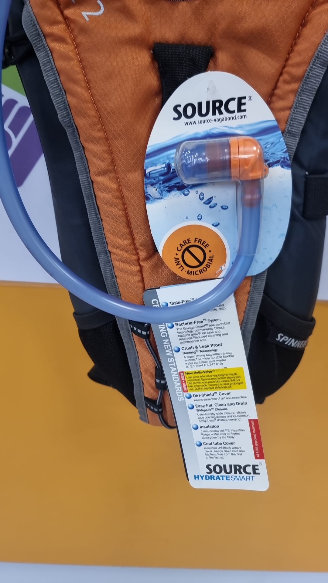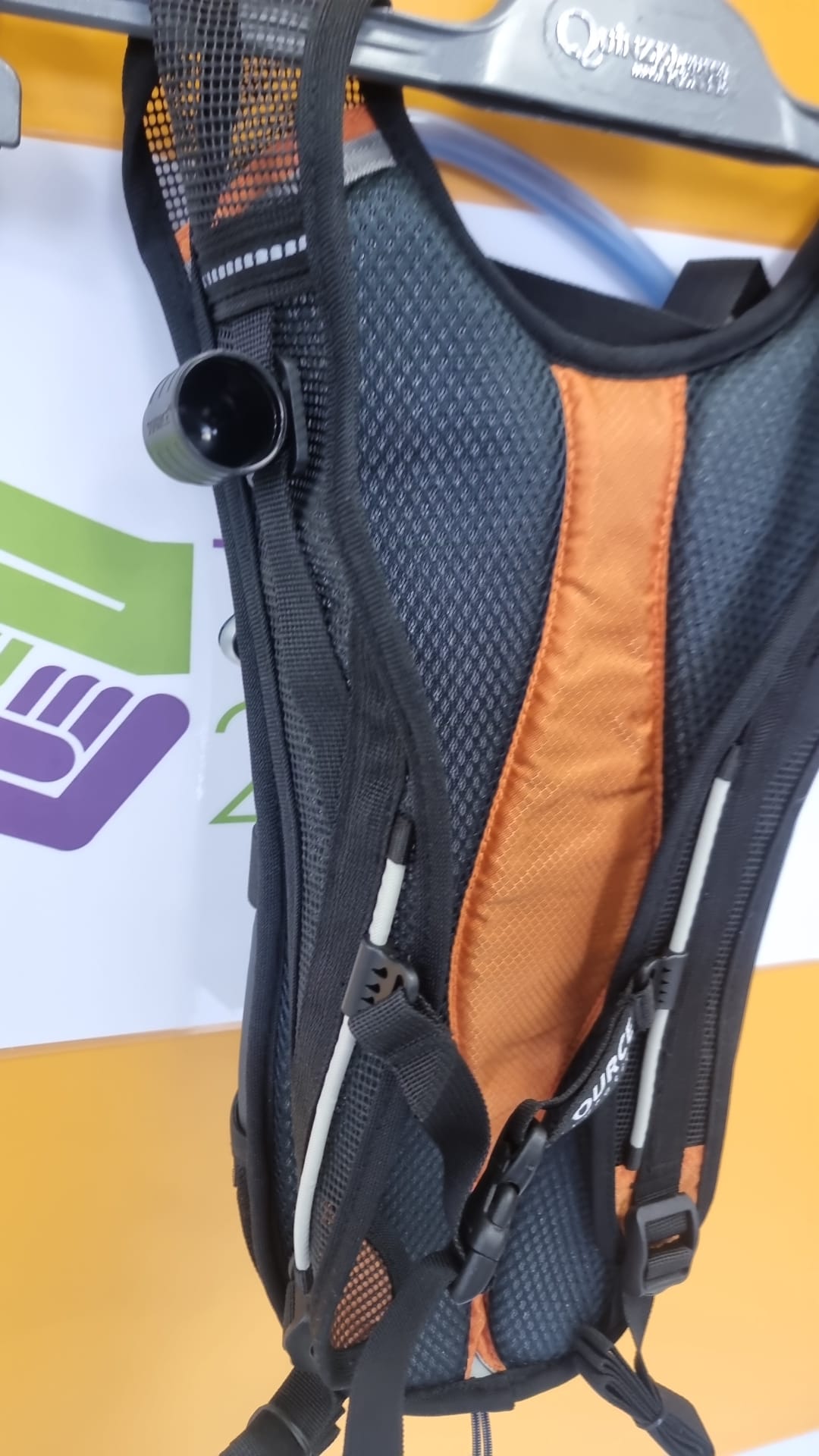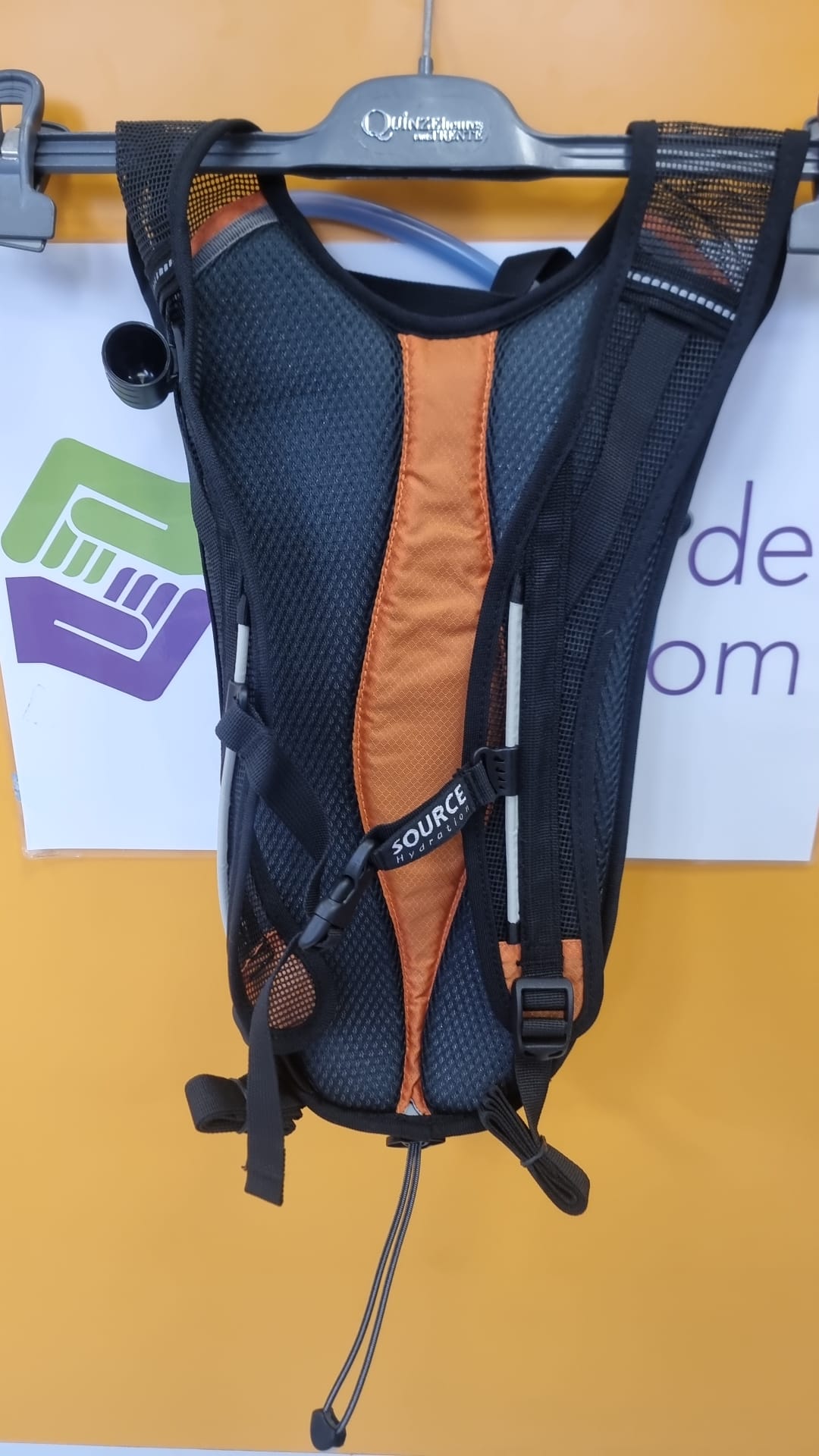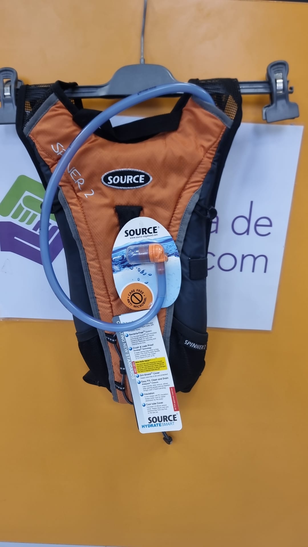 Mochila de hidratación SOURCE con capacidad de 2 litros, nueva a estrenar de color naranja. Fabricada en nylon 70D de alta resistencia. Tubo protegido con neopreno anti rayos IR.