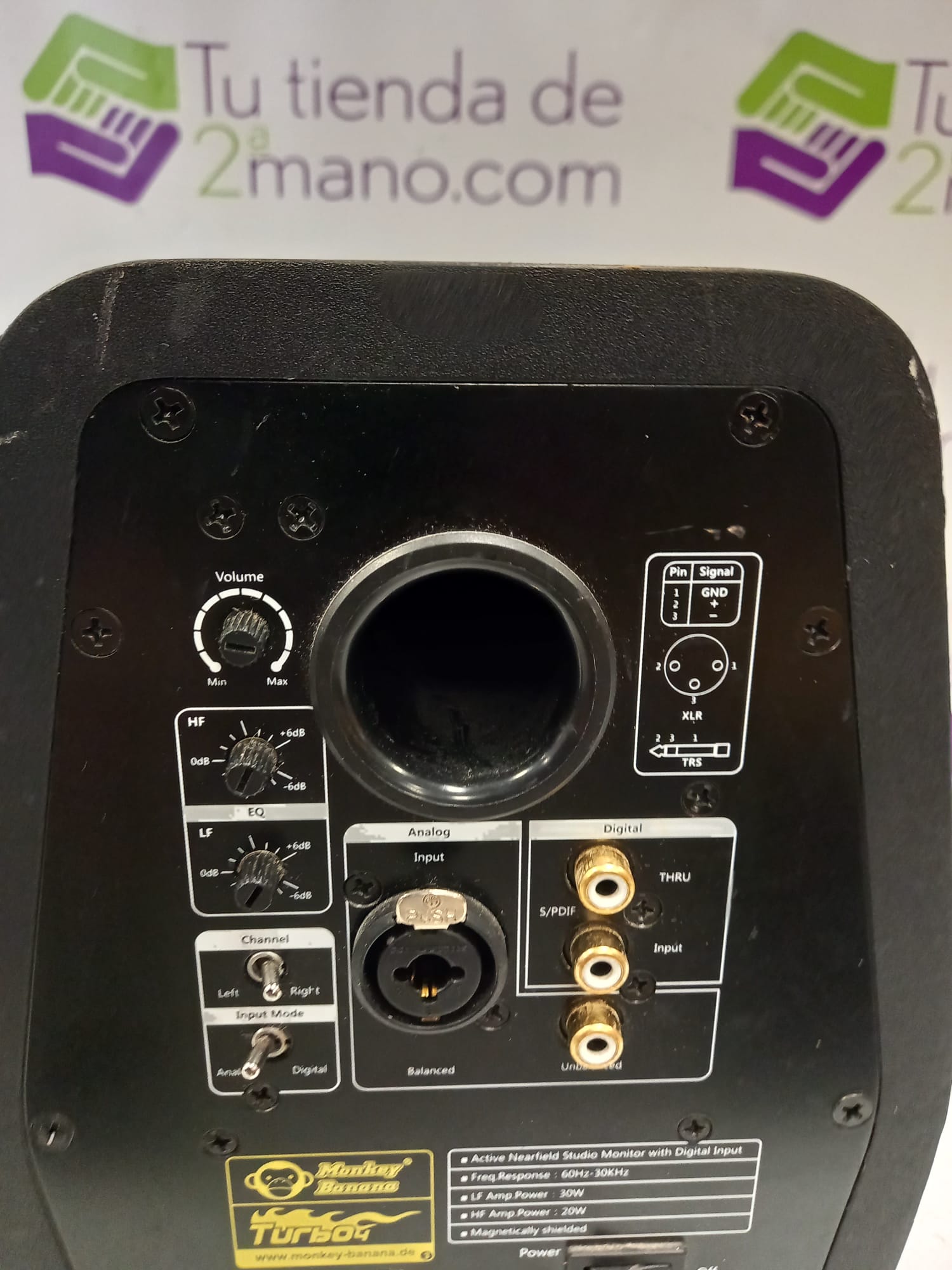 Monitor marca MONKEY BANANA modelo TURBO 4. Dimensión bafle de graves (pulgadas): 4. Dimensión de driver de agudos (pulgadas): 1. 50W. Rango de frecuencia: 60 - 30000Hz. Entradas análogas: 3-Pole XLR, RCA, jack TRS. Anchura (mm): 173. profundidad (mm): 195. altura (mm): 245.