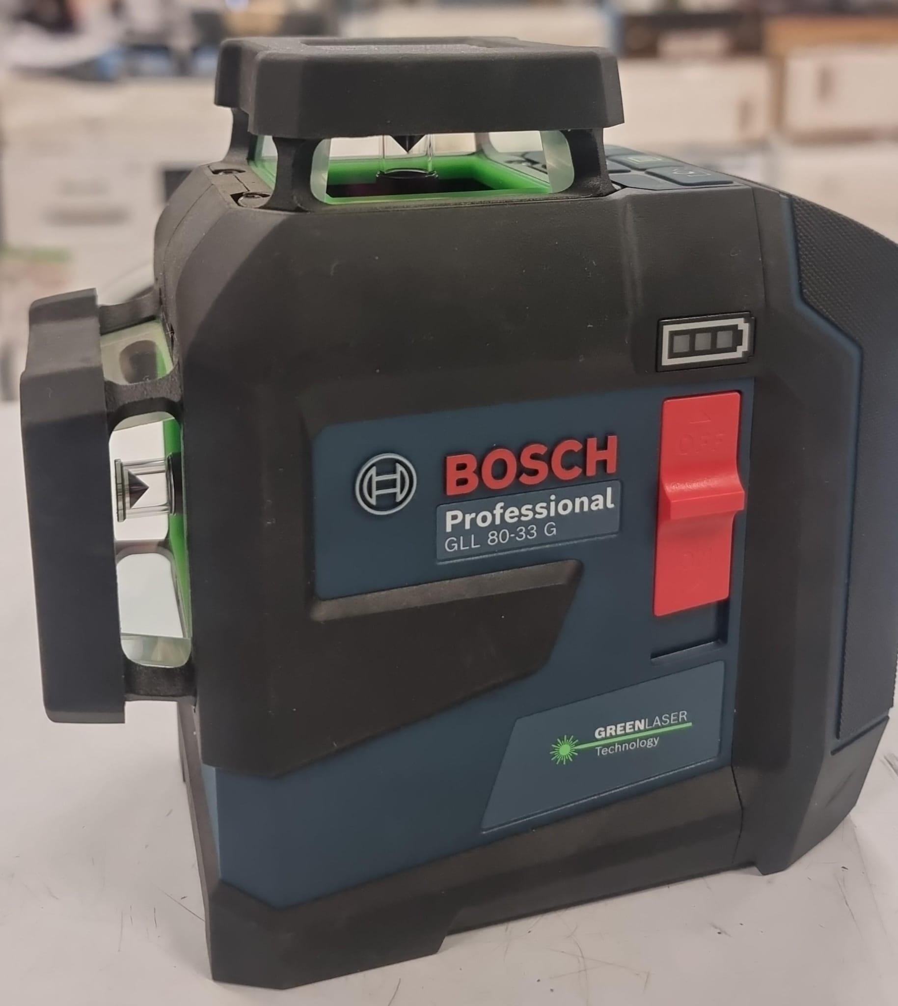 Nivel láser Bosch Professional GLL 80-33 G con tecnología Green Laser. Diseño robusto y compacto. Indicador de batería. Botón de encendido/apagado rojo.