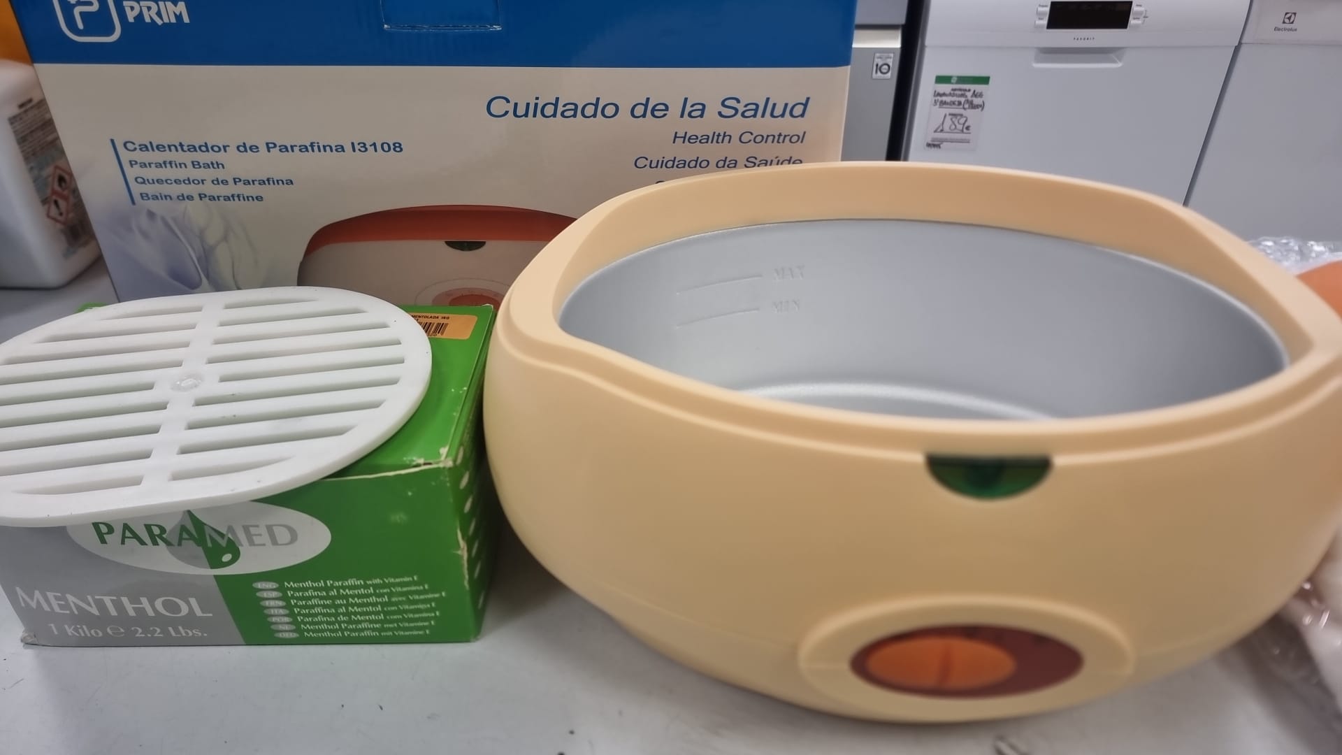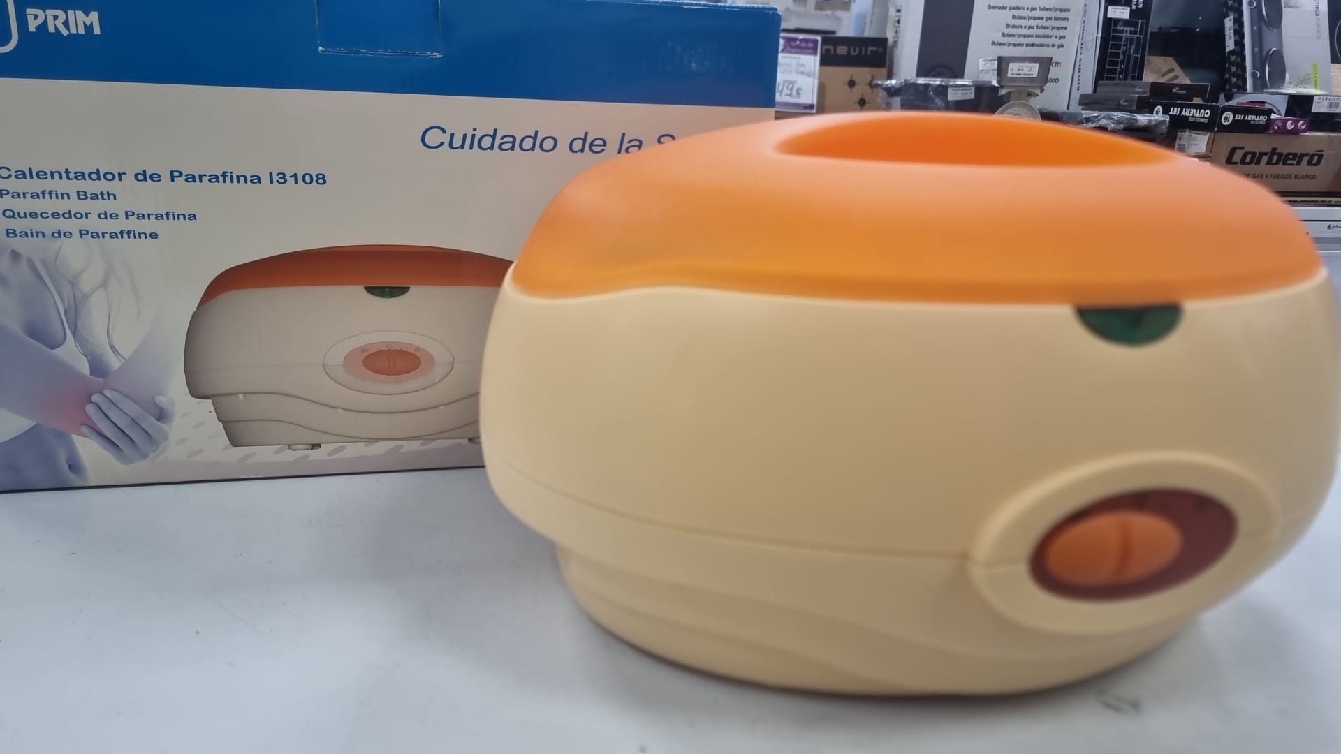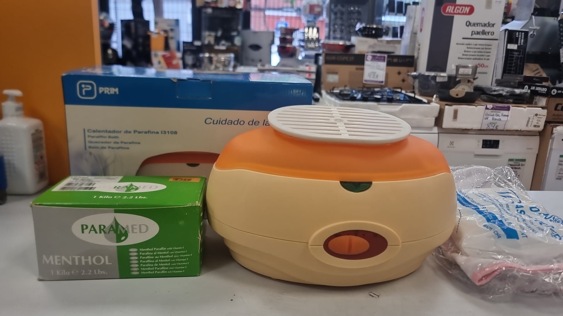 Se vende calentador de parafina Prim I3108 junto con un paquete de parafina de mentol.Calentador de parafina Prim I3108.1 Kilo de parafina de mentol con vitamina E.