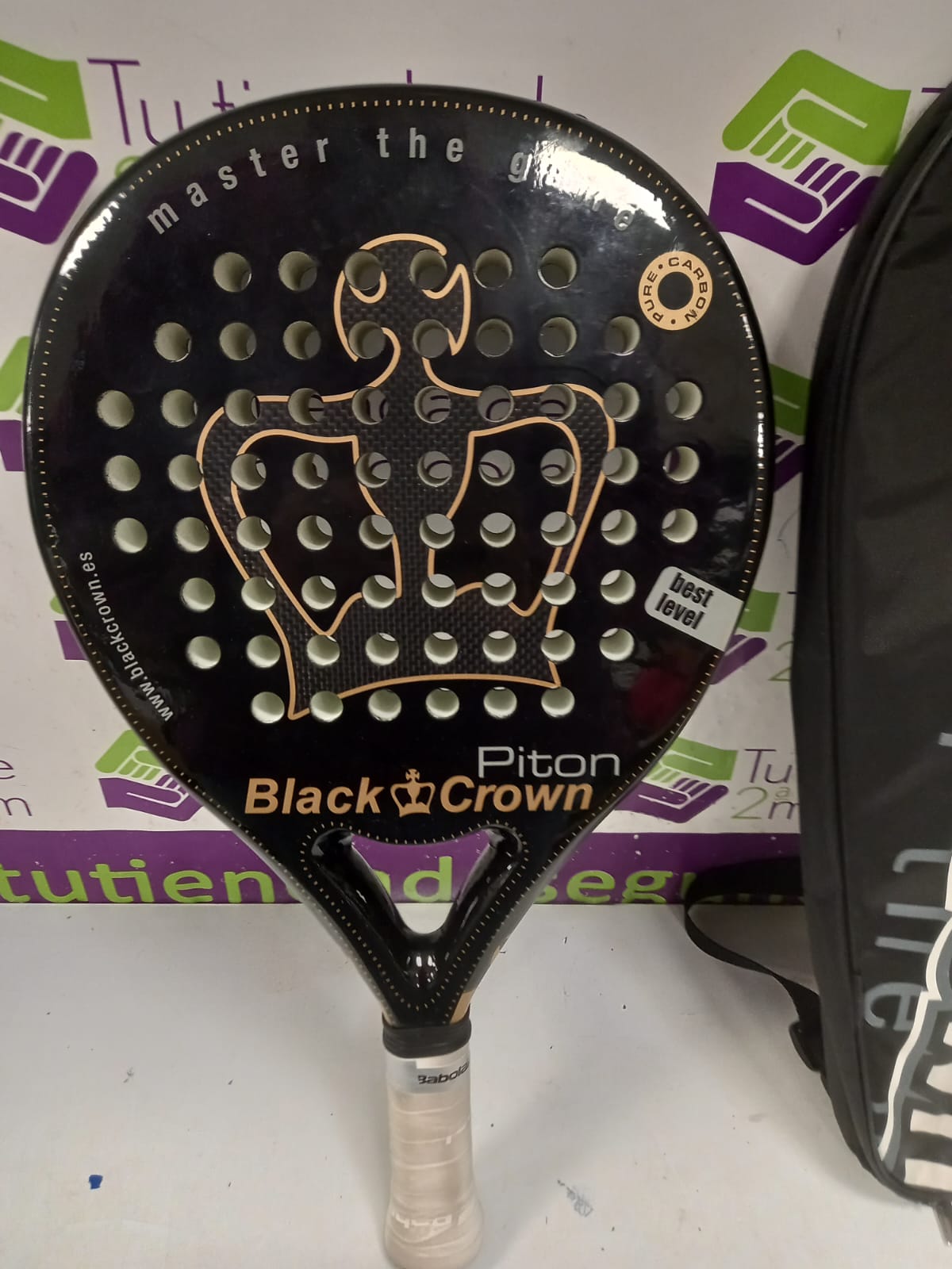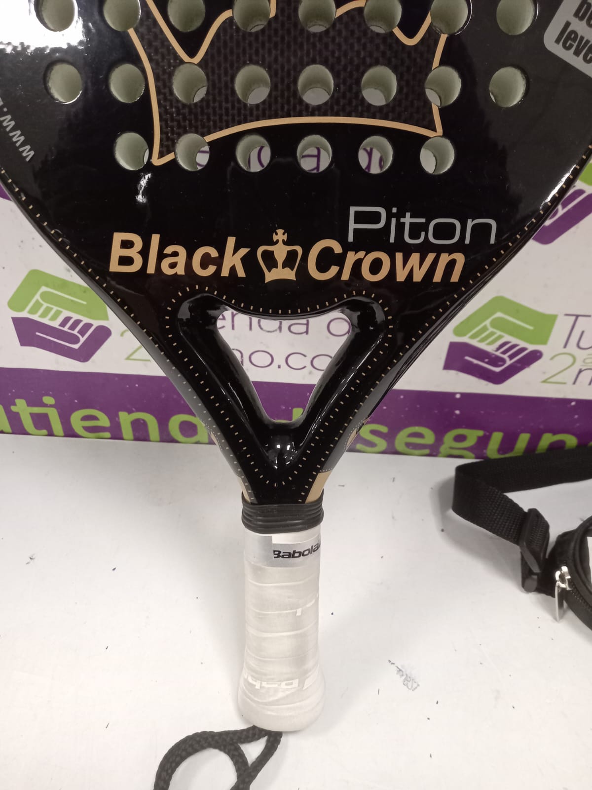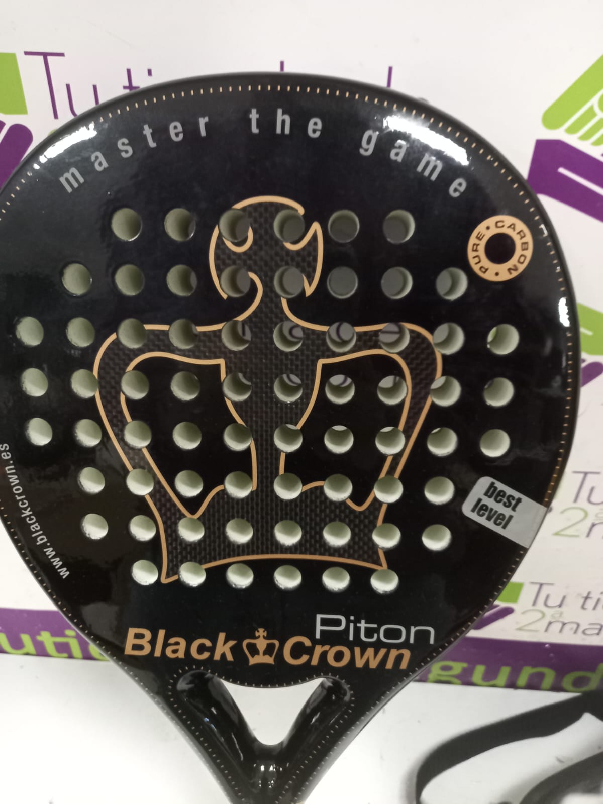 Pala Pádel Black Crown Piton Núcleo exterior: 2 capas de fibra de vidrio reforzado de alta durabilidad + 1 capa de fibra de carbono reticulado y reforzado. Núcleo interior: Goma EVA de alta densidad de dureza media. Nivel: avanzado. Potencia: 95%. Control: 100%. Peso 365 a 375 grs. Marco 38 mm. perfil constante.