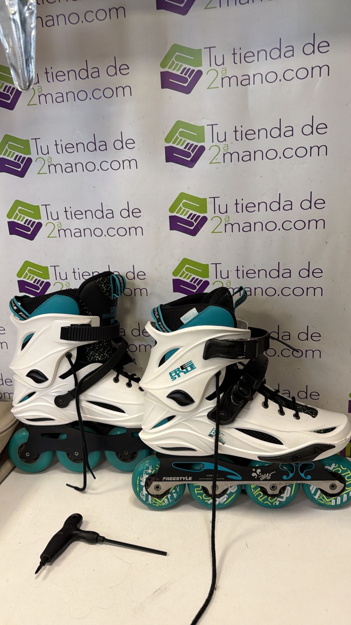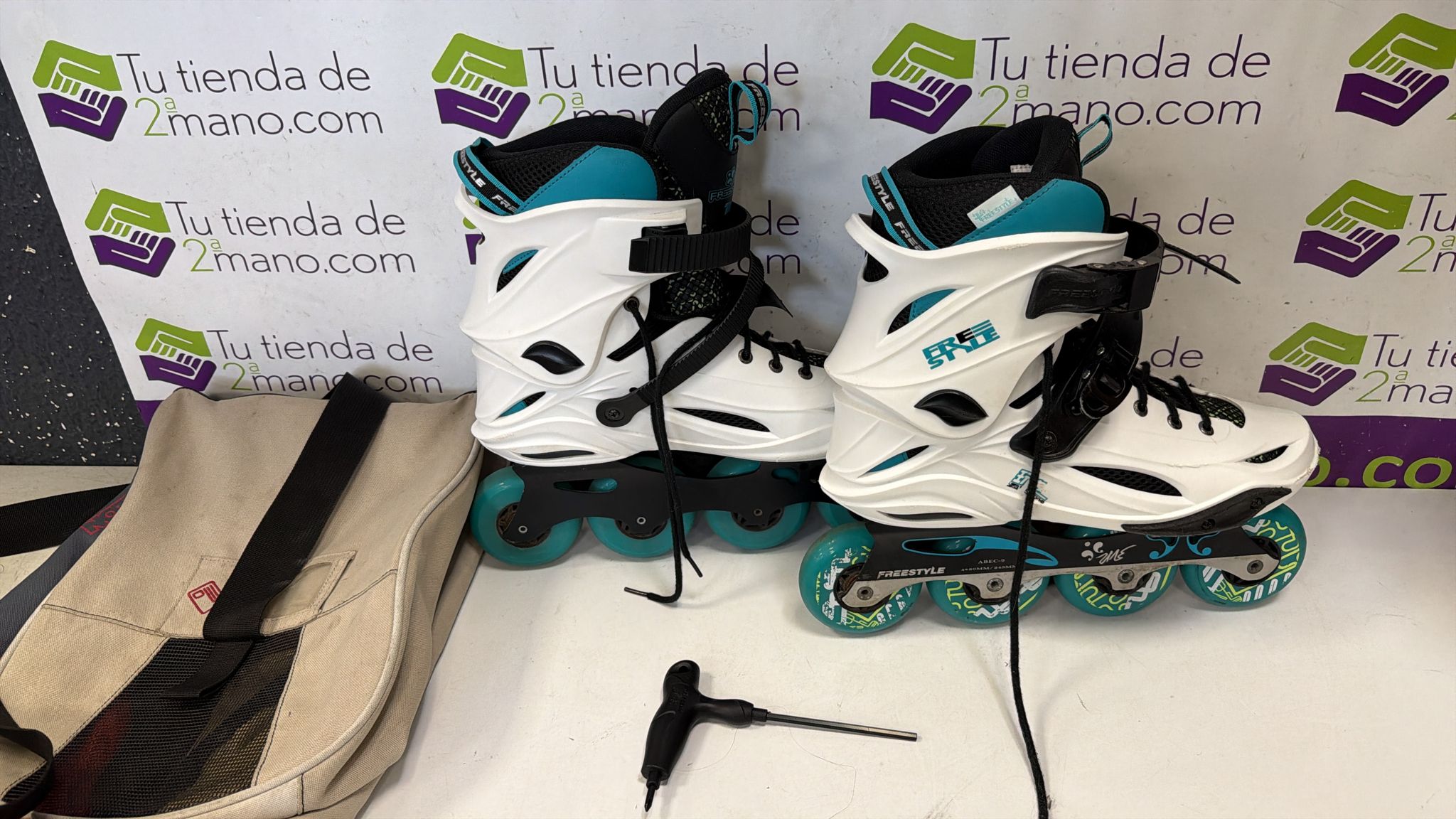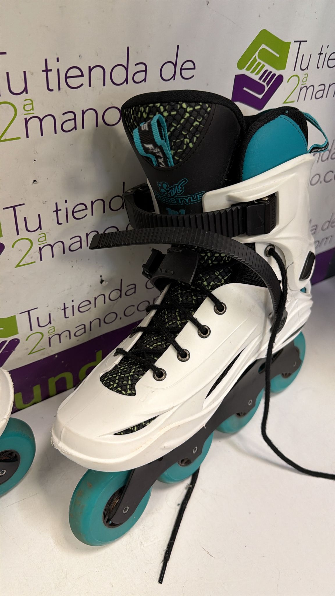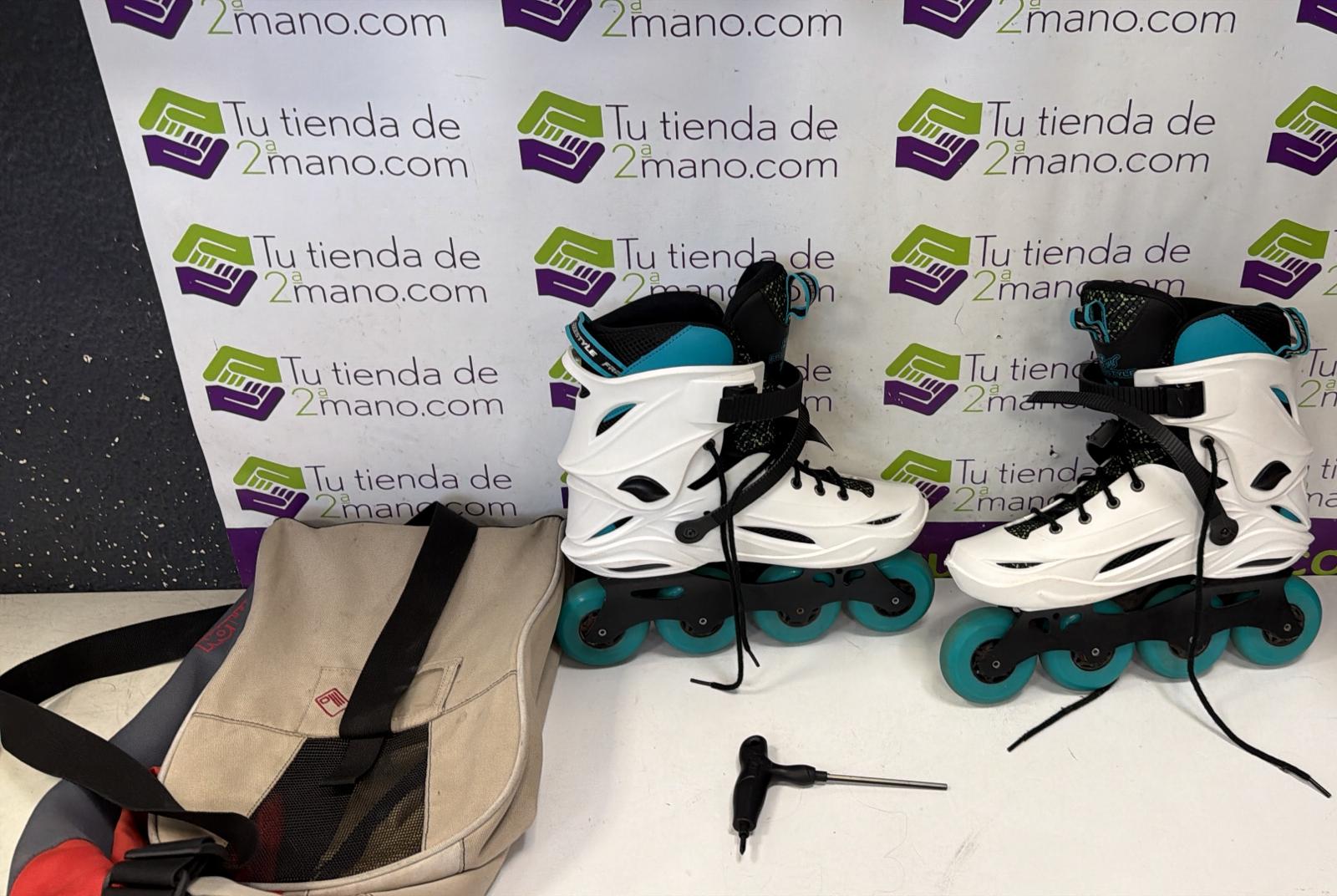 Patines en línea para freestyle, modelo M1 con rodamientos ABEC-9.Color blanco y turquesa.Cierre de velcro y hebilla.Ruedas de color turquesa.