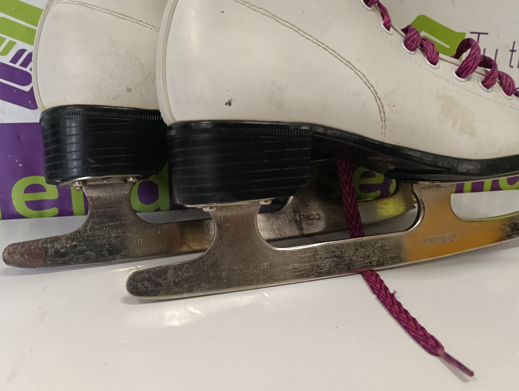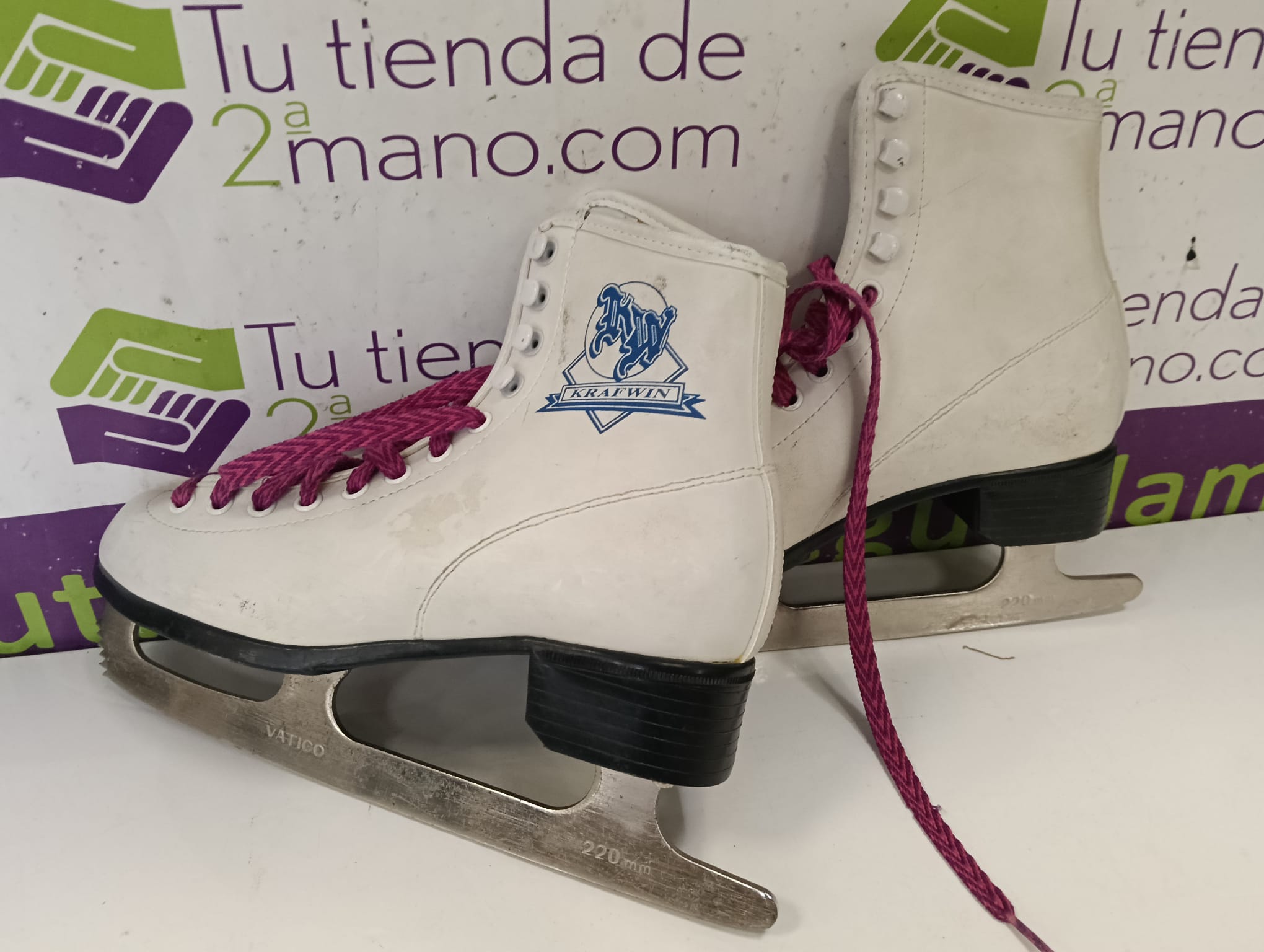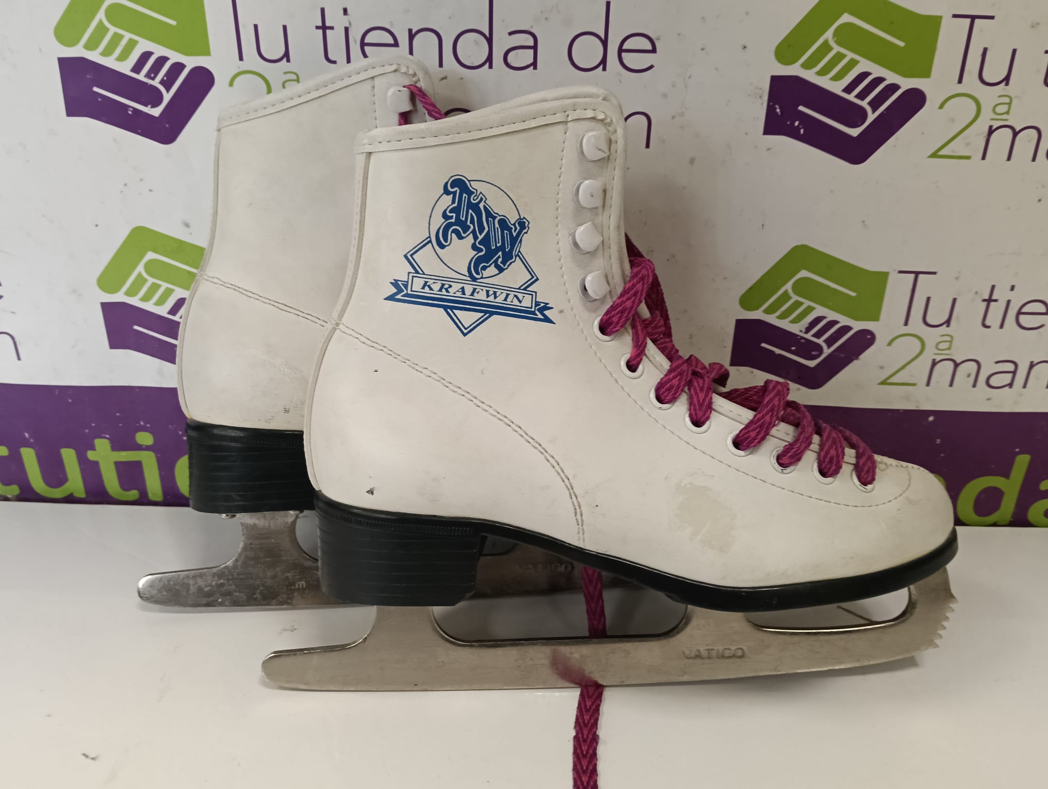 Patines de hielo blancos de la marca Krafwin. Talla 35.Cordones rosas. Cuchillas metálicas.