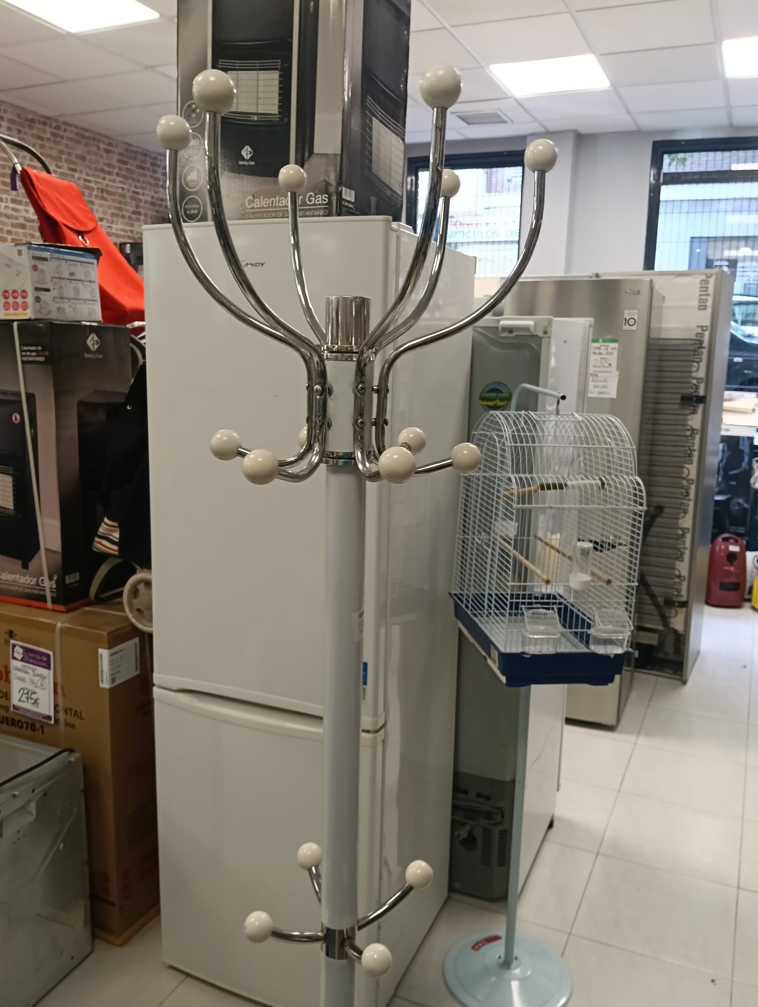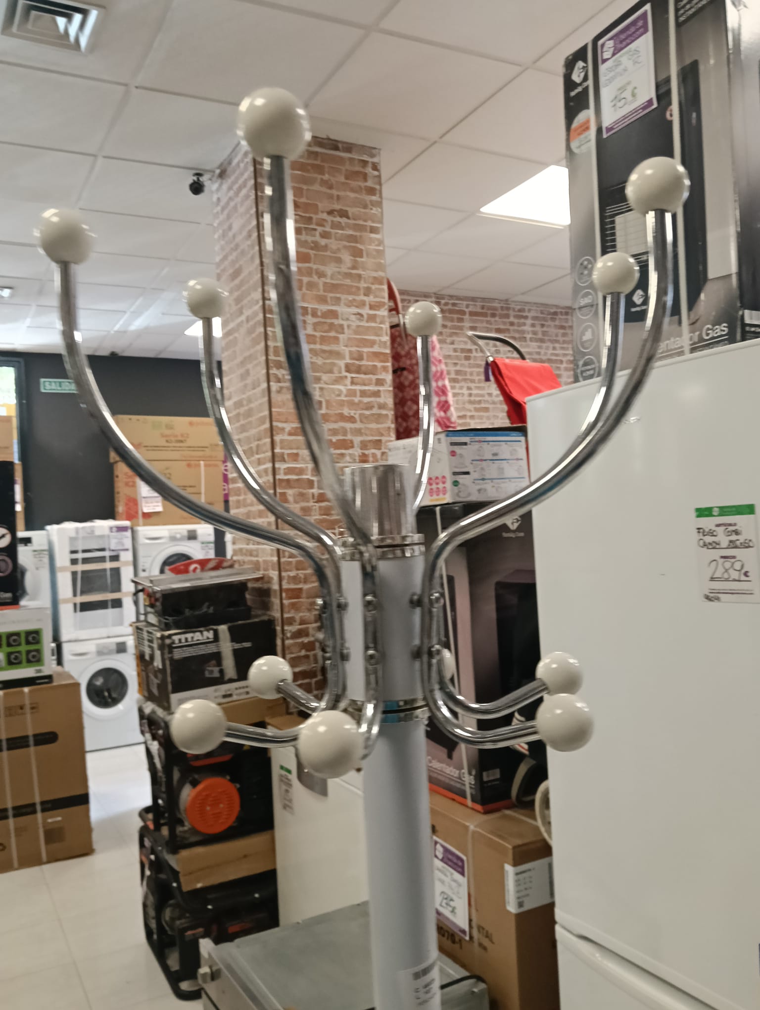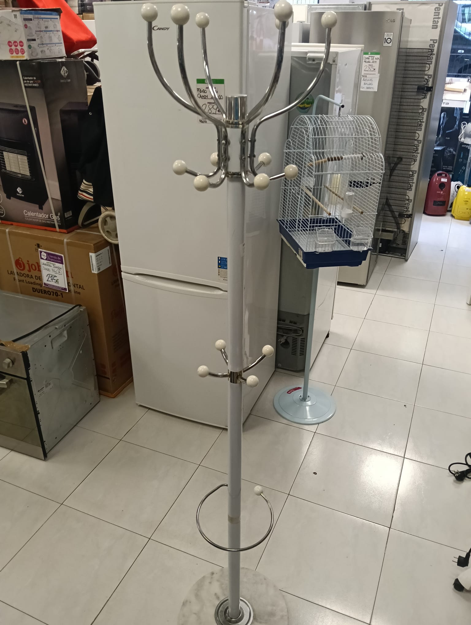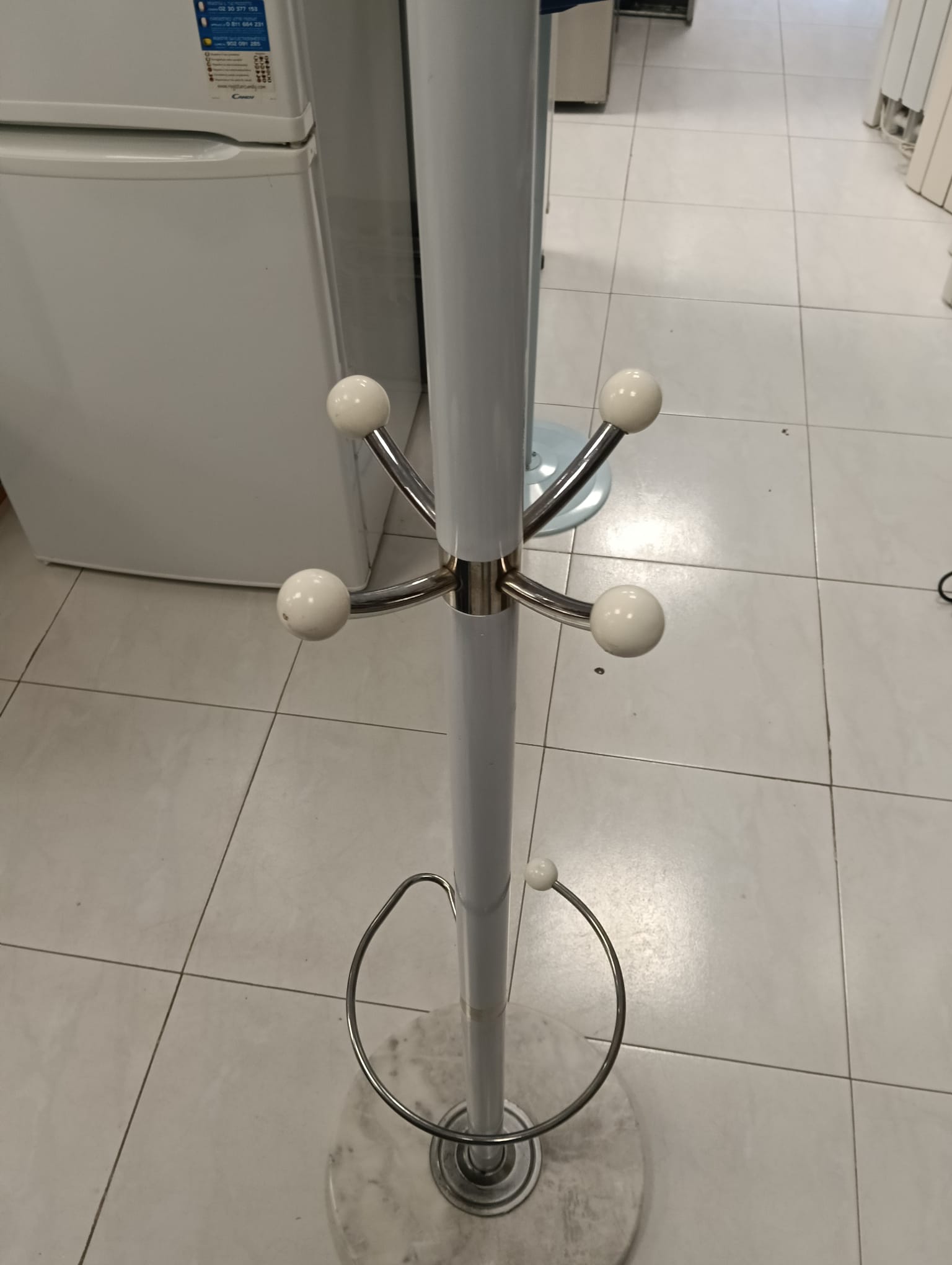 Perchero paraguero de pie. Color blanco. Base circular. 2 SUJECIONES DE LAS PERCHAS SUELTAS. 6 perchas por 3 alturas.