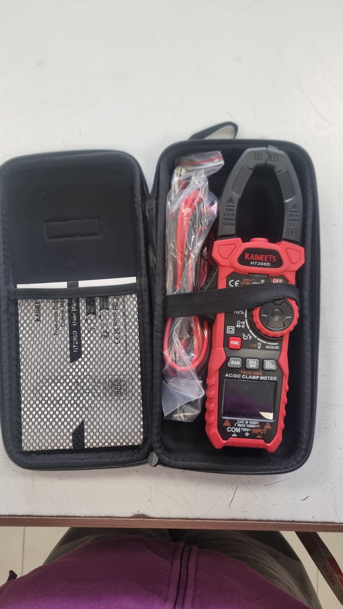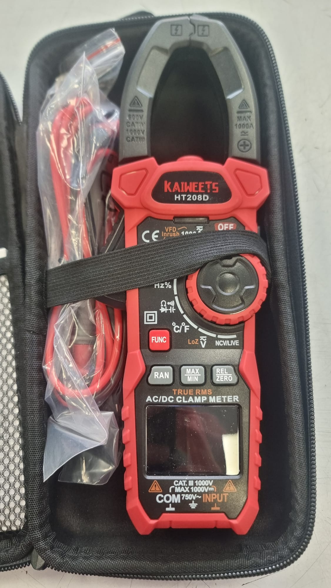 Pinza amperimétrica de la marca Kaiweets, ideal para mediciones eléctricas.- Incluye funda protectora. Diseño compacto y portátil. Pinza Amperímetro digital puede medir con precisión en 1000A corriente en CA/CC, 750V /1000V tension en AC/DC.