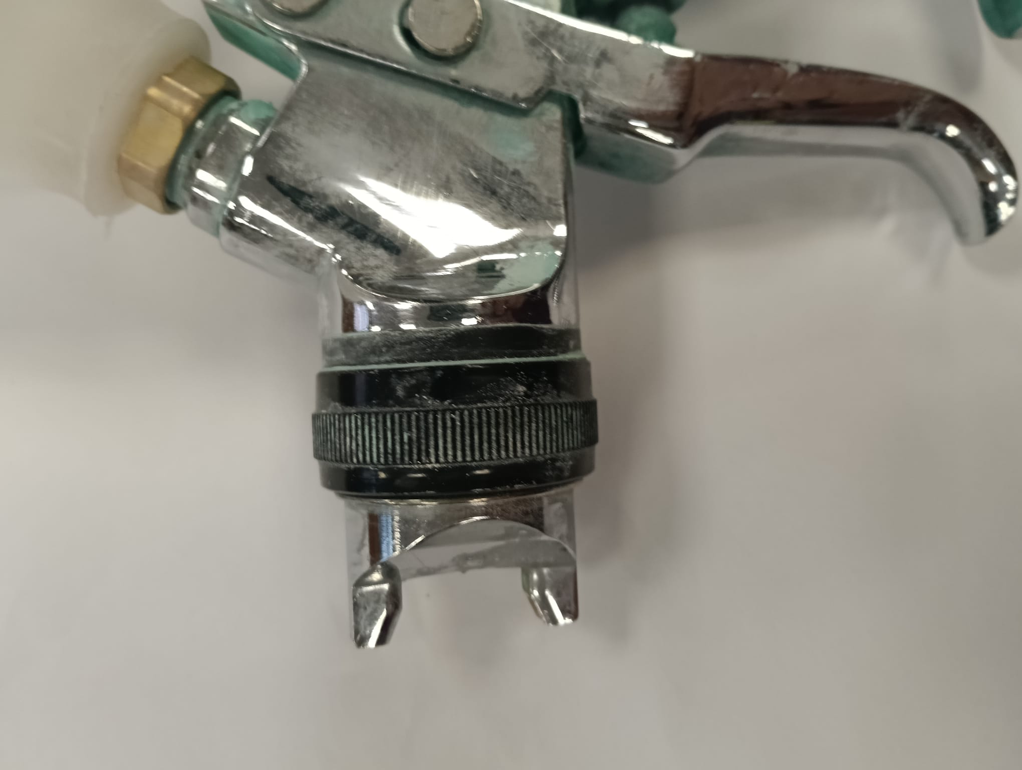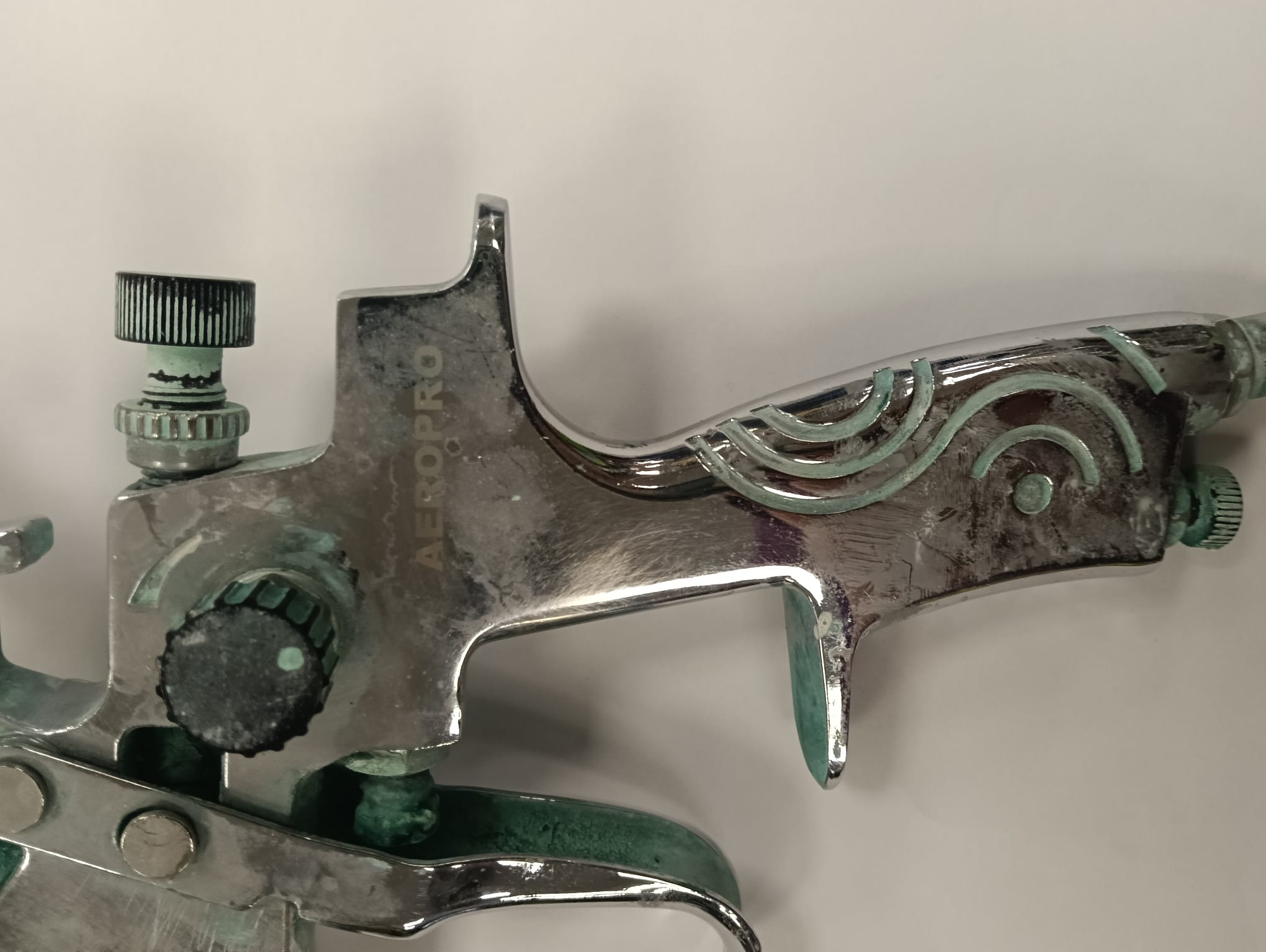 Pistola de pintura de la marca Aeropro, con depósito. Cuerpo metálico cromado. Depósito de plástico blanco.