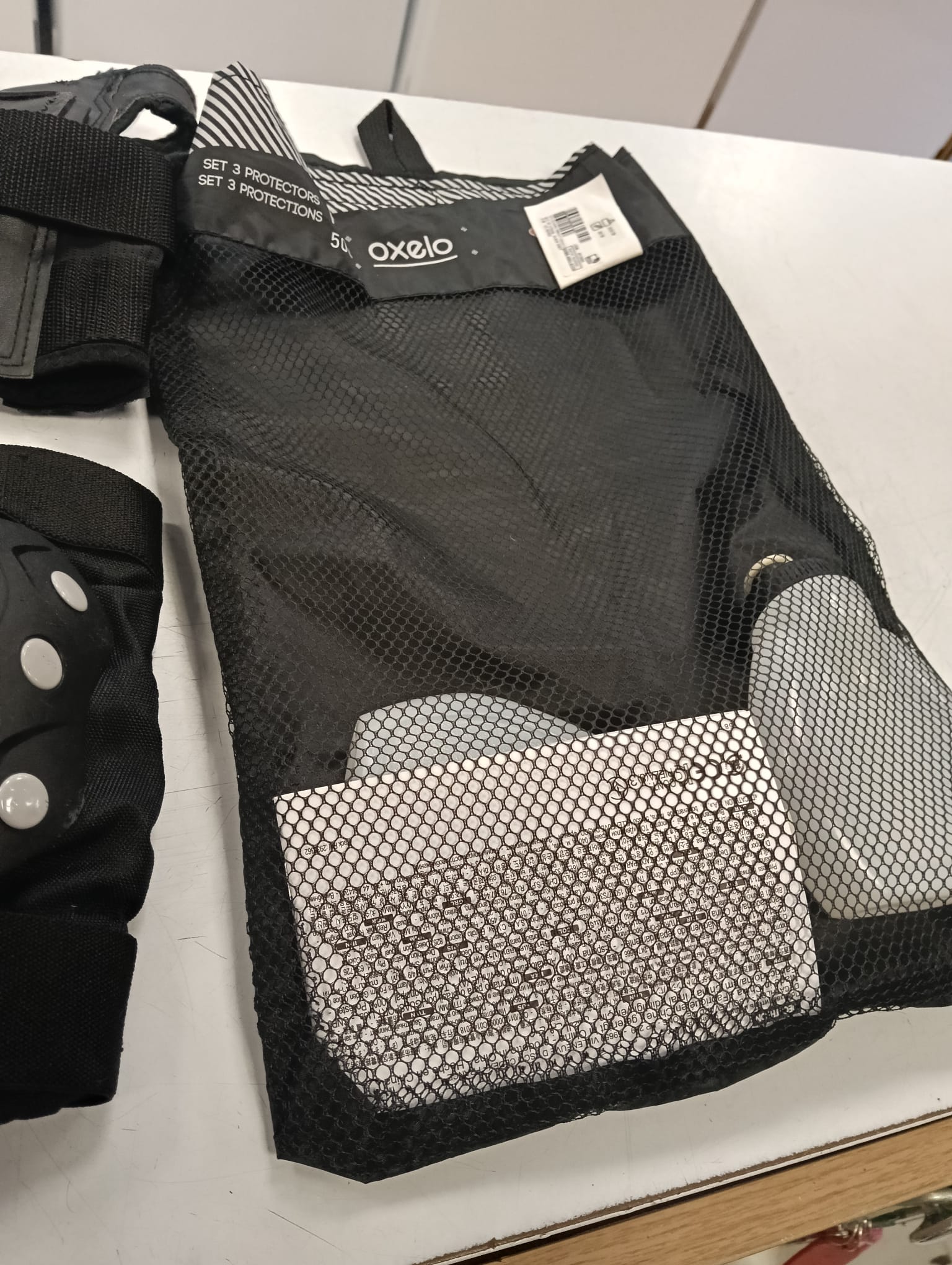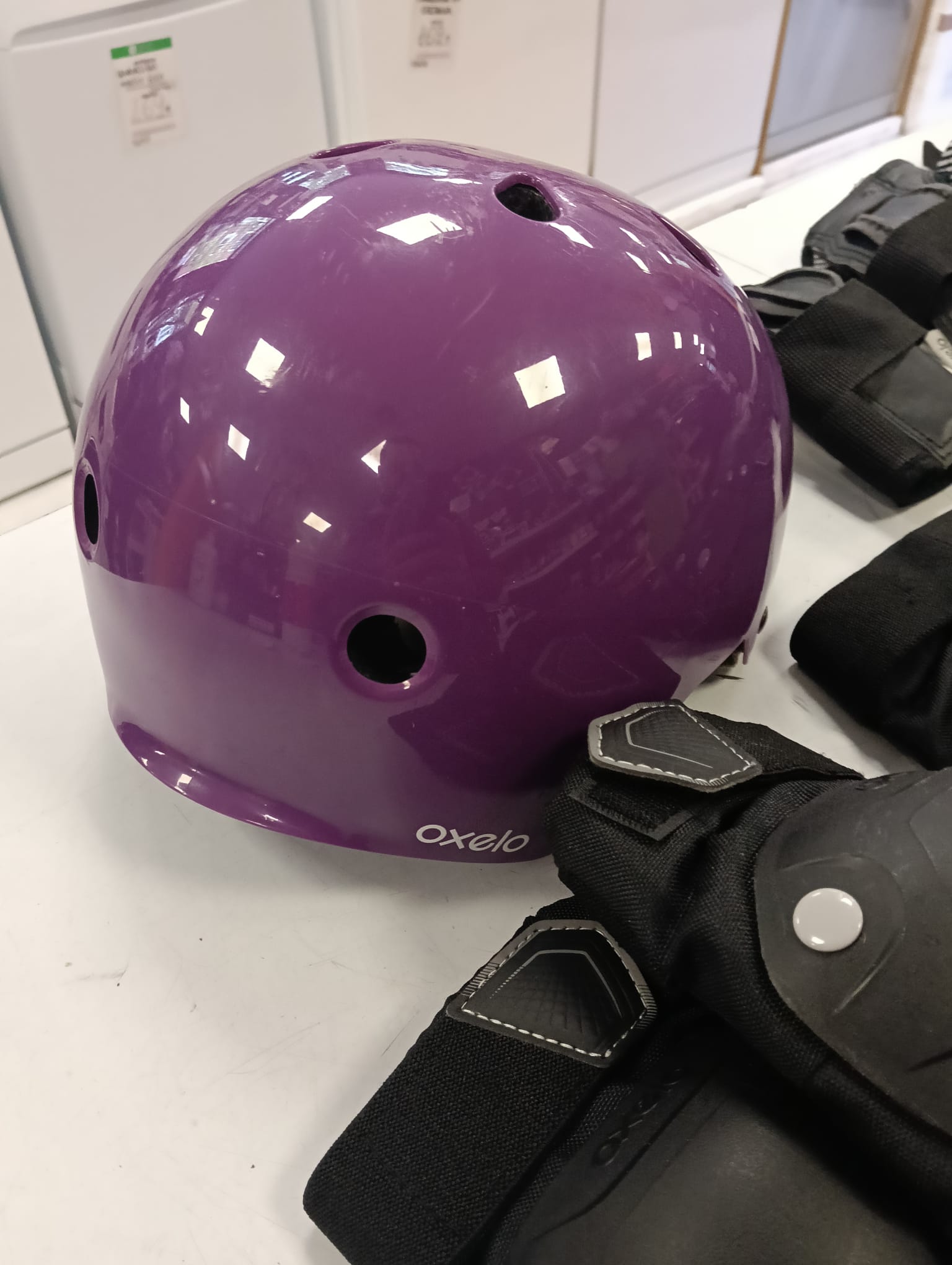 Set de protecciones para patinaje o ciclismo infantil. Incluye casco y protectores para rodillas, codos y muñecas. Casco morado con ventilación. Protectores negros para rodillas y codos. Protectores negros para muñecas. Bolsa de malla para transporte.