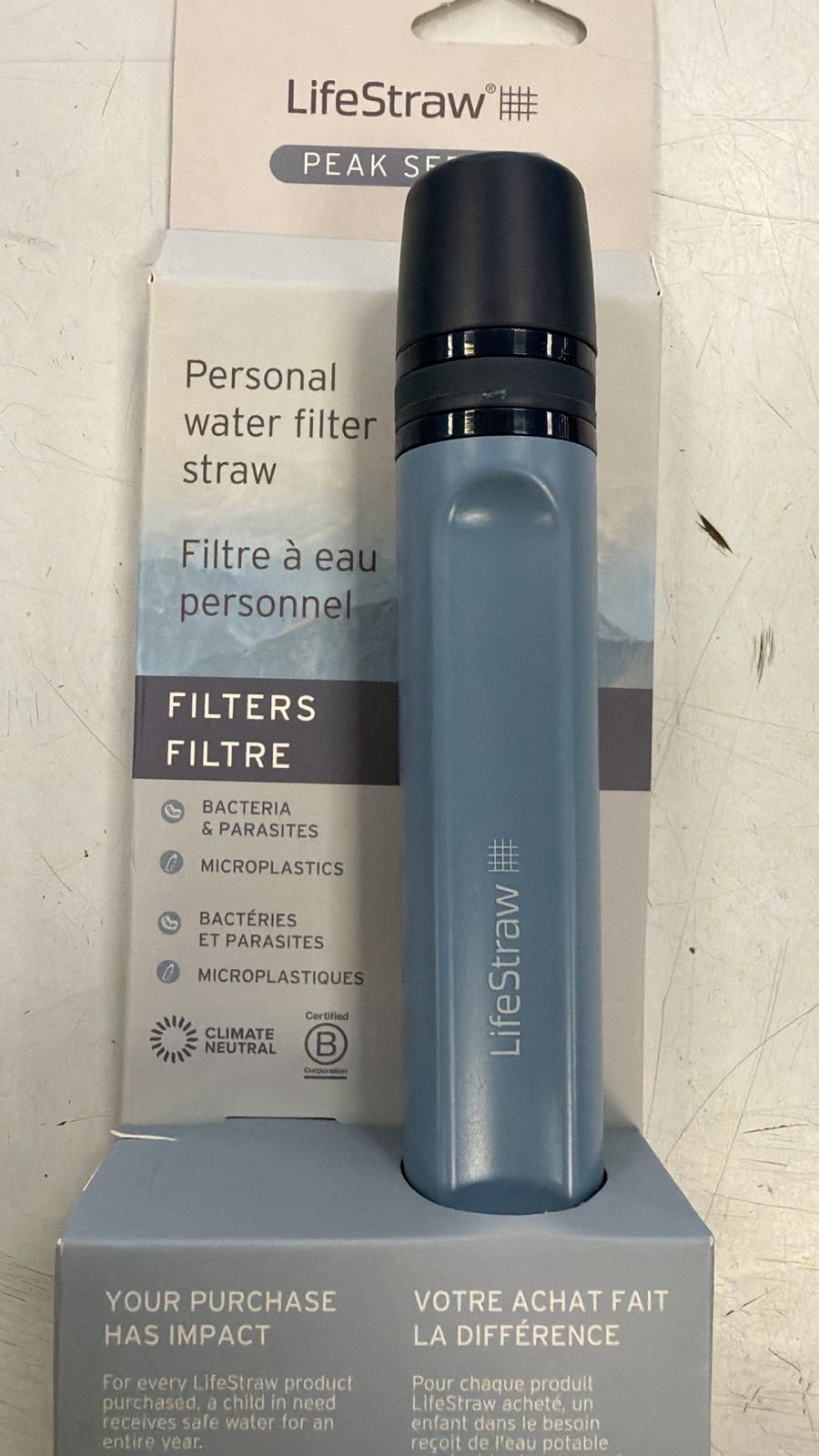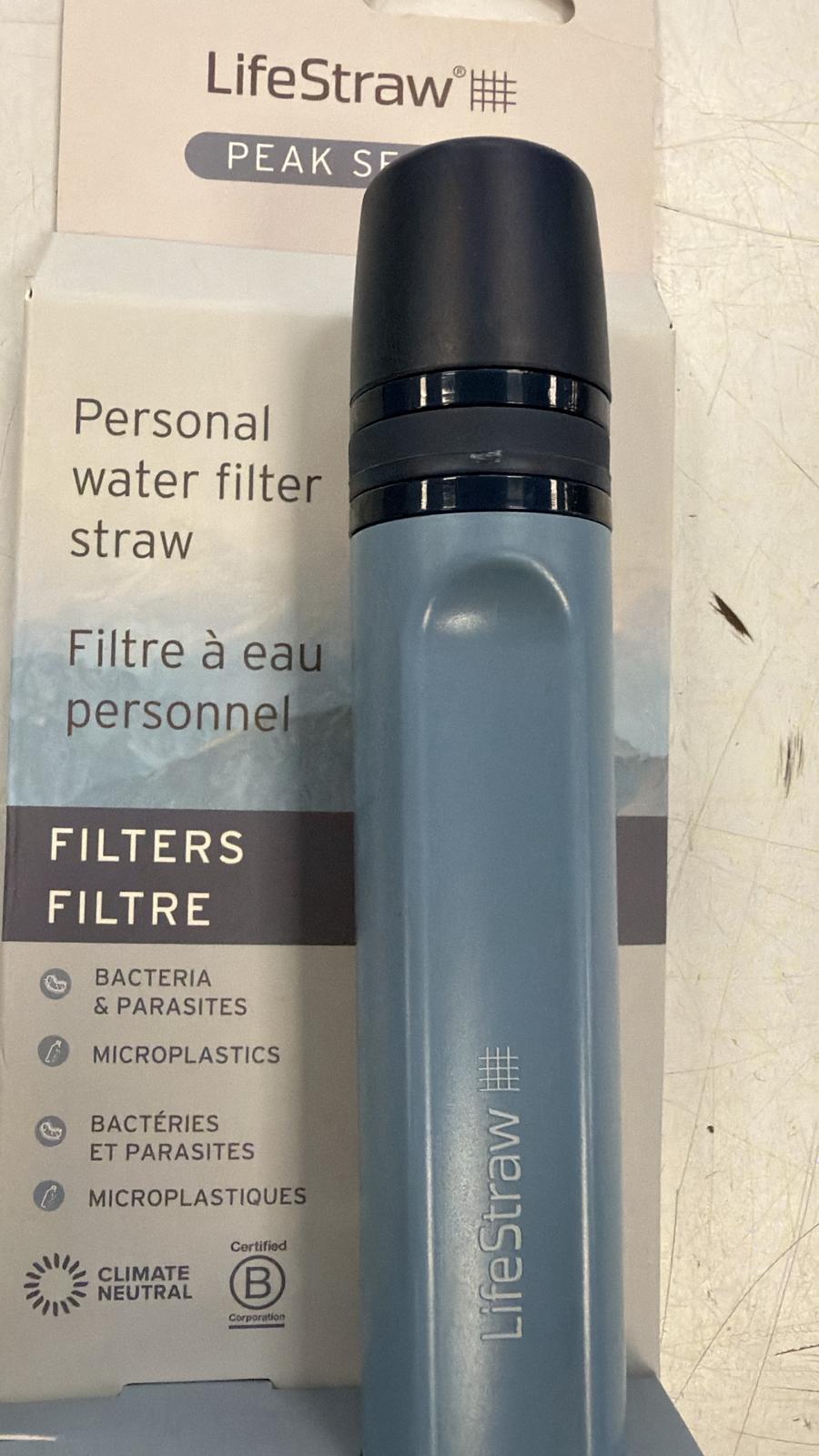 Filtro de agua personal LifeStraw modelo Peak en color azul. Diseñado para filtrar bacterias y parásitos, así como microplásticos. Filtra bacterias y parásitos. Elimina microplásticos.Certificado Climate Neutral. Certificado B Corp.