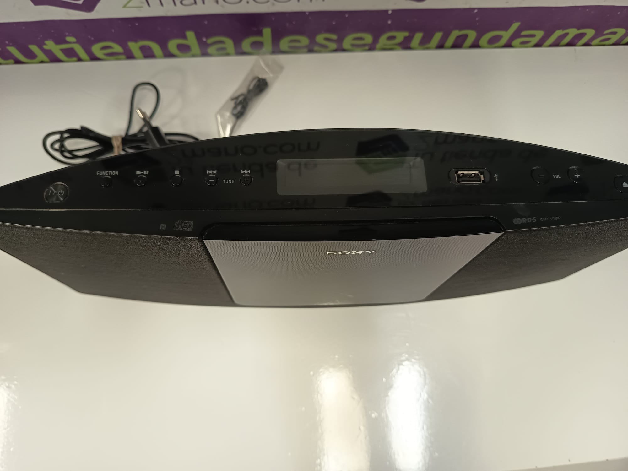 Sistema de audio compacto con radio, CD y conexión USB. Diseño moderno en color negro y gris. Compatible con dispositivos USB para reproducir música.