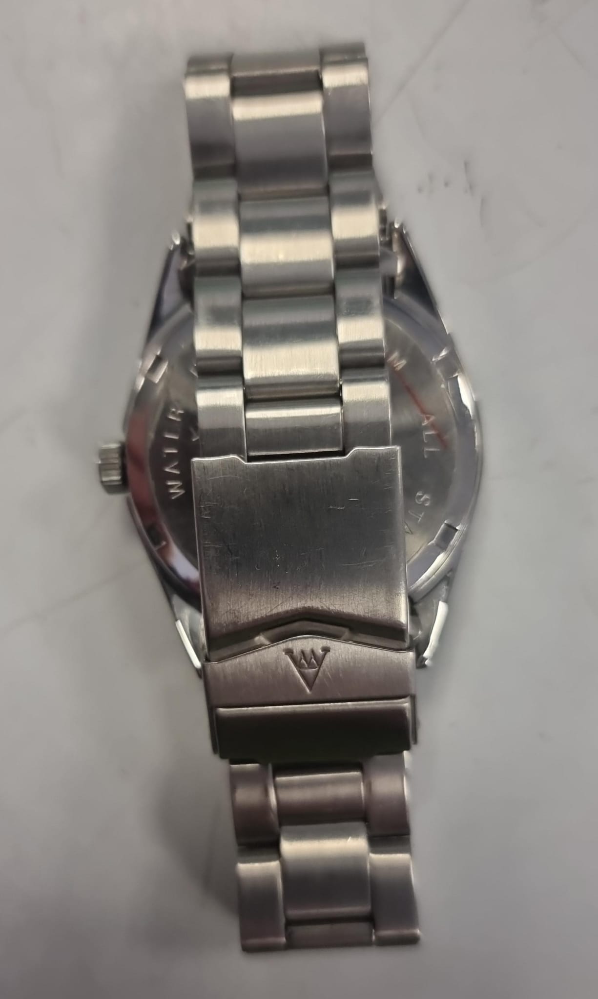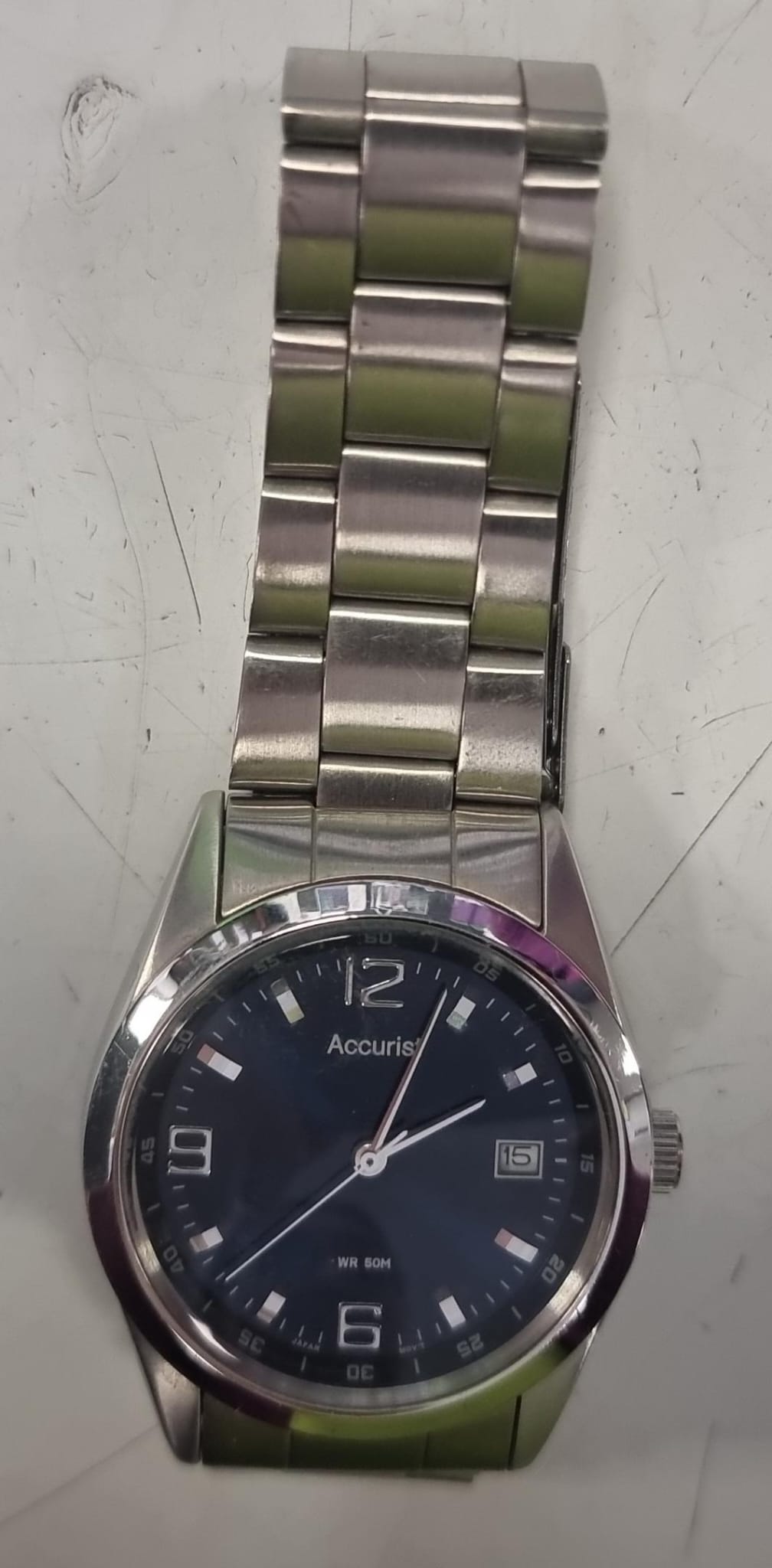 Reloj de pulsera Accurist con una esfera azul y detalles plateados.Correa de eslabones de acero inoxidable.Indicador de fecha en la esfera.Resistencia al agua WR 50M.