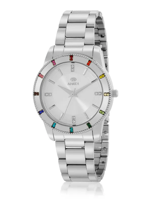 RELOJ MAREA SEÑORA B41371/1. Producto nuevo. Caja de acero inoxidable de 36 mm. Brazalete malla milanesa de acero. Bisel con pedrería arco iris. Esfera plateada con índices de pedrería. Tres agujas. Movimiento japonés.