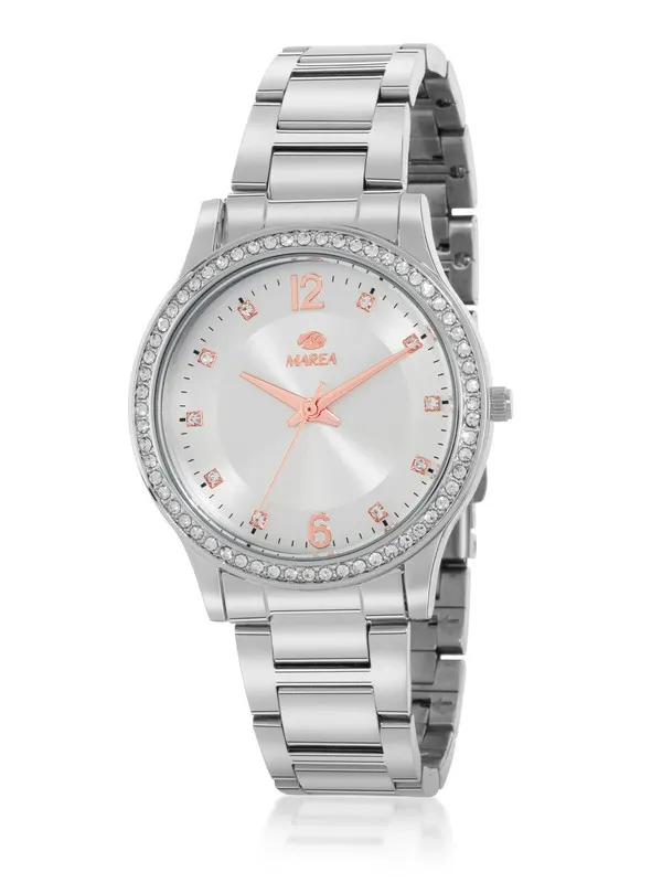 RELOJ MAREA SEÑORA B41372/1. Producto nuevo. Caja de acero de 36mm. Bisel con circonitas. Brazalete de acero. Cierre desplegable. Esfera blanca. Cristal mineral. Movimiento quartz.