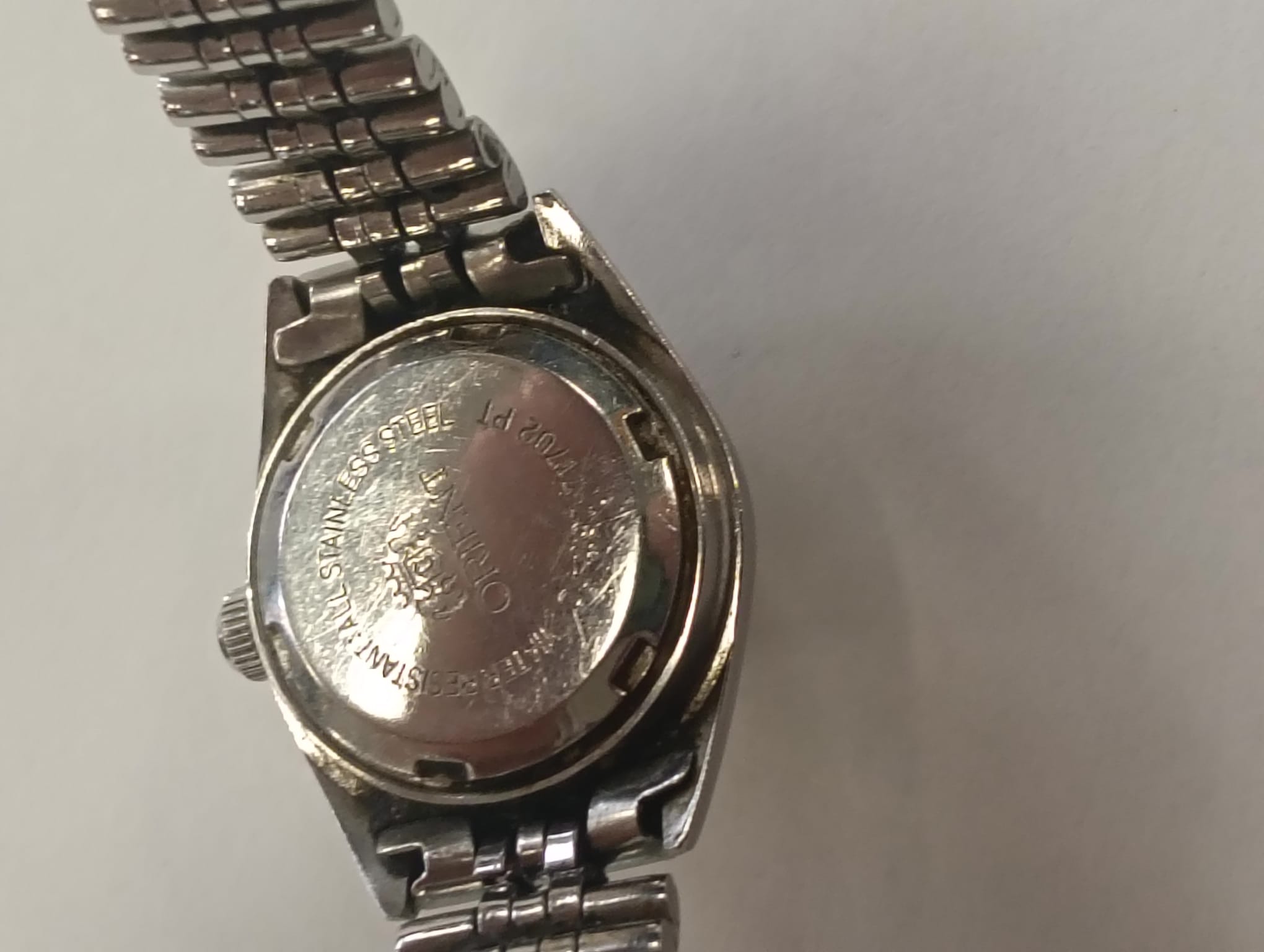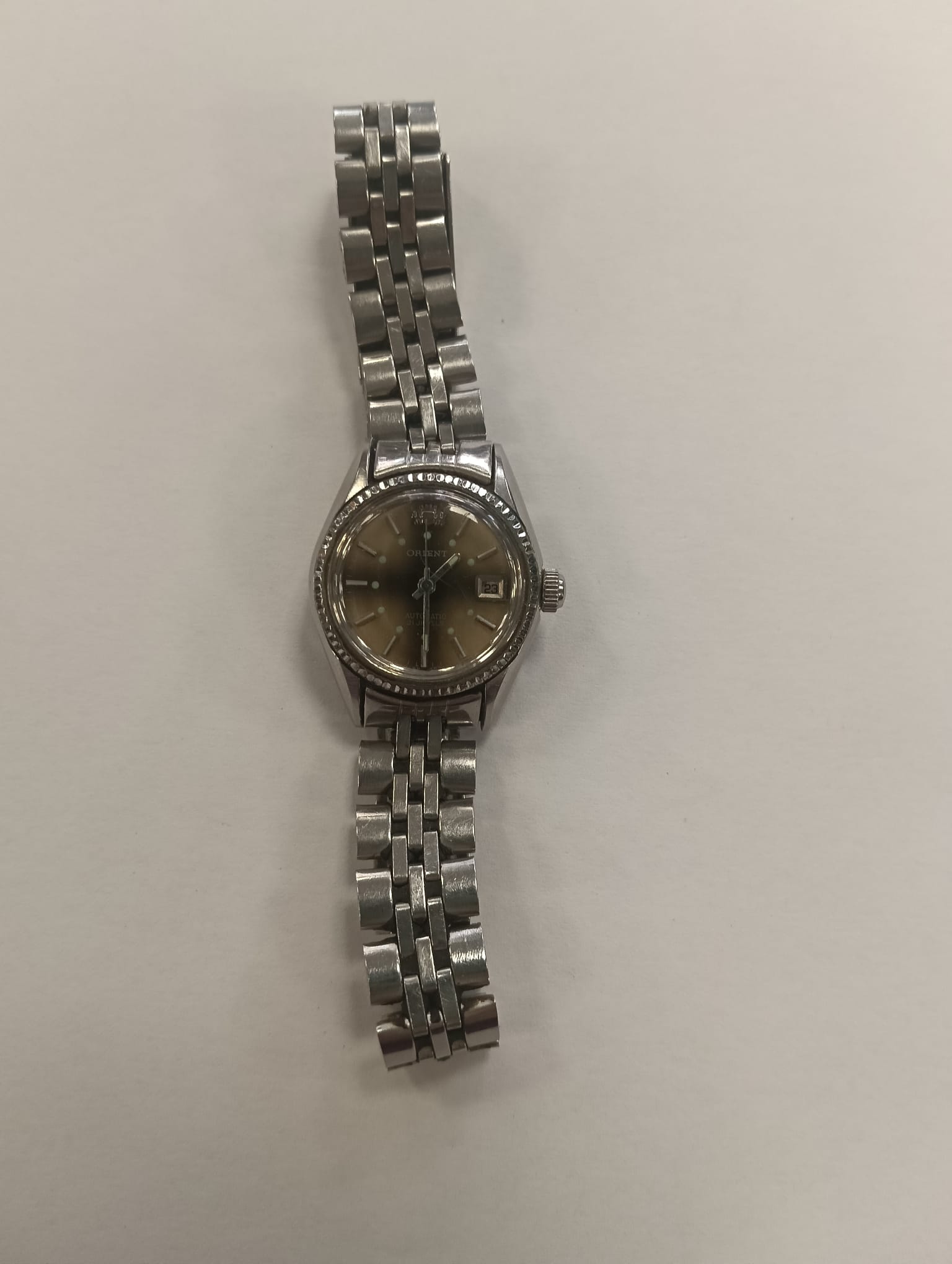 Reloj de pulsera automático para mujer de la marca Orient. Esfera en tonos dorados y plateados. Brazalete metálico. Diseño clásico y elegante.