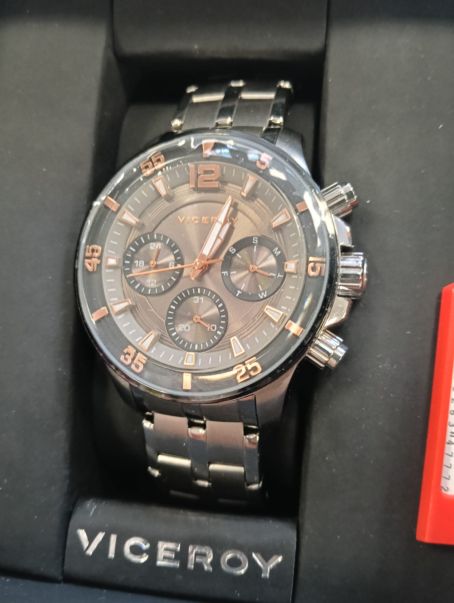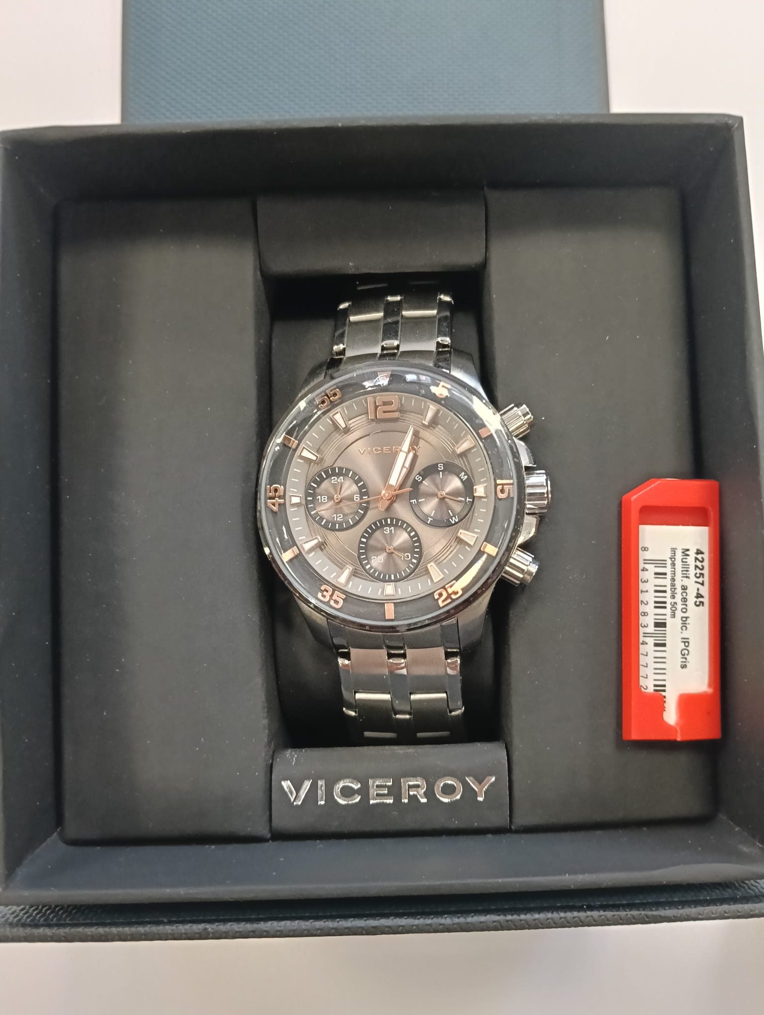Reloj Viceroy para caballero, modelo 42257. Maquinaria de cuarzo analógica con Cronógrafo. Cristal mineral. Caja de Acero con P.V.D. Brazalete de Acero.