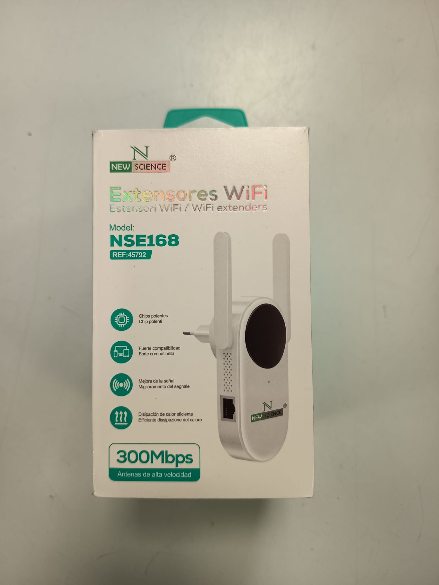 Extensor de WiFi NSE168 de New Science, con una velocidad de 300Mbps. Ideal para mejorar la cobertura de tu red Chips potentes. Fuerte compatibilidad. Mejora de la señal. Disipación de calor eficiente. Antenas de alta velocidad.