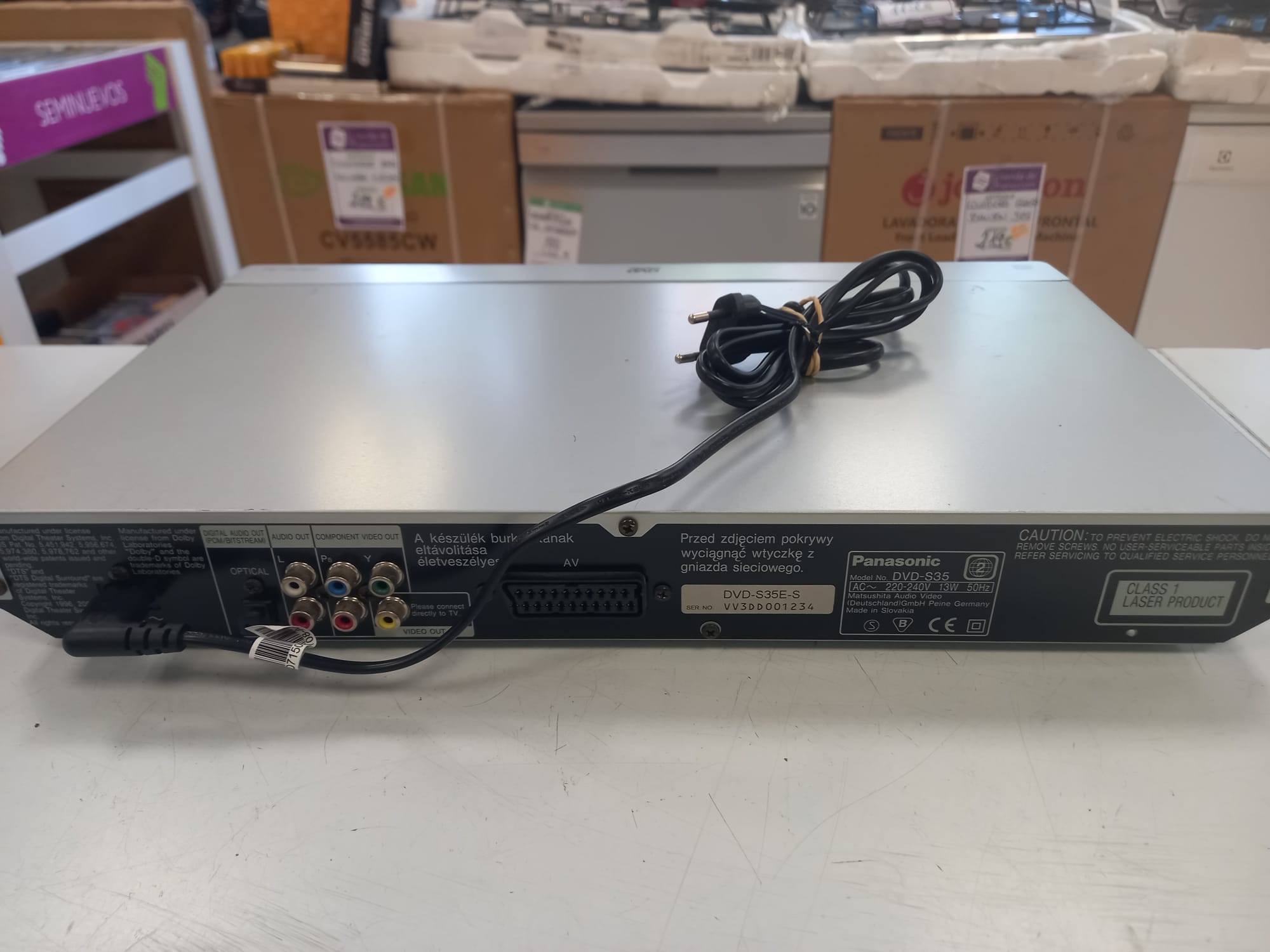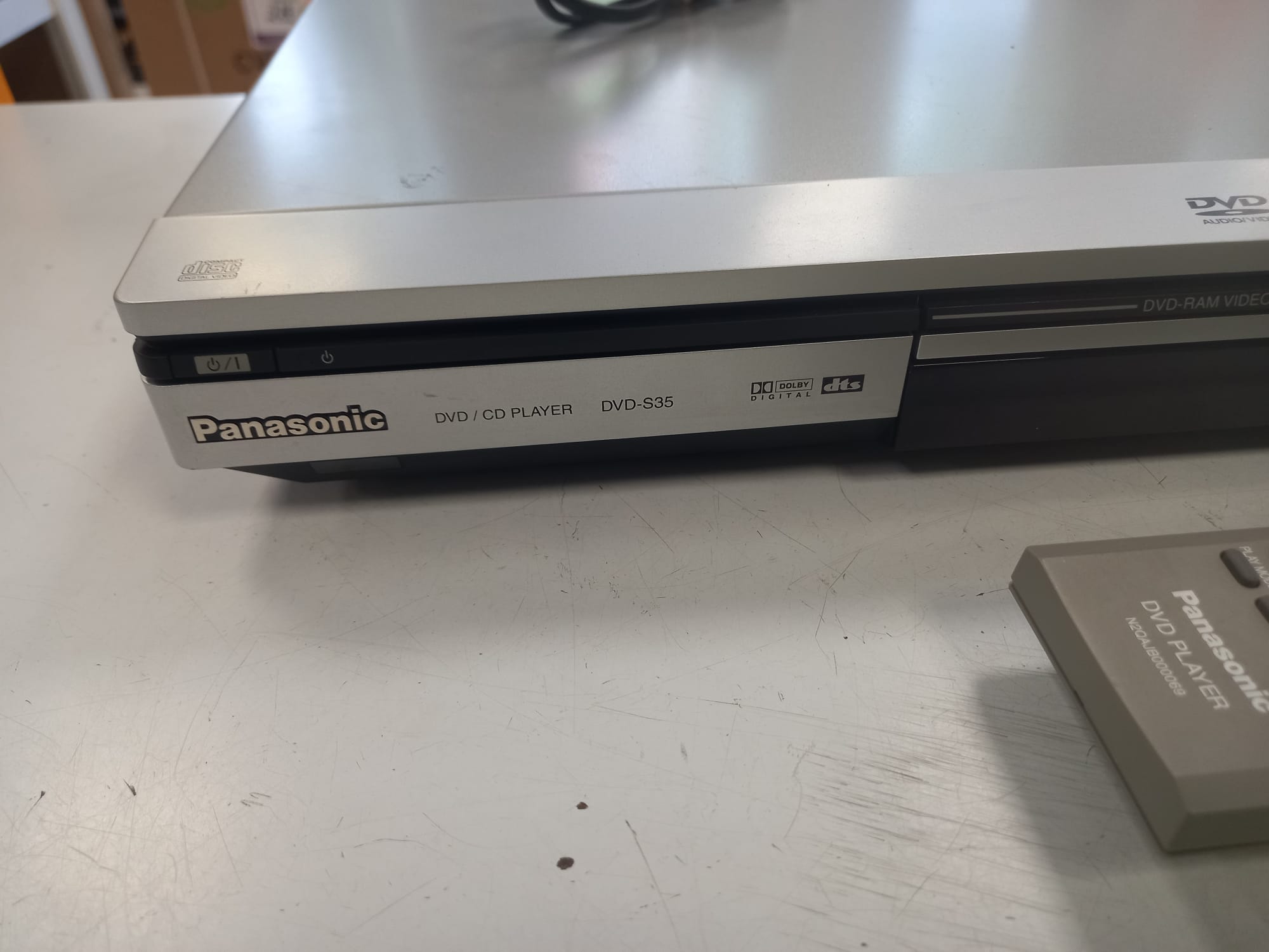 Reproductor DVD S35 Panasonic con mando original. Conexión por RCA o euroconector. Compatible con formatos DVD, CD, WMA, MP3 y JPEG. Reproducción de vídeo DVD-RAM.